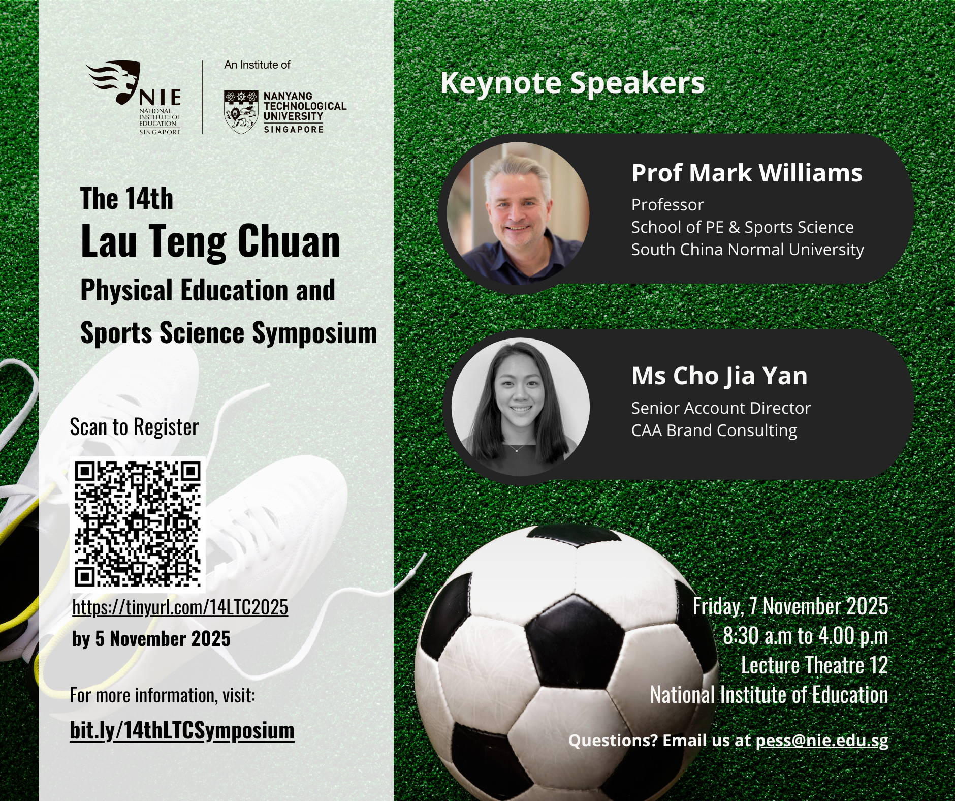 The 14th Lau Teng Chuan Physical Education and Sports Science Symposium, hosted by the Physical Education and Sports Science (PESS) Department, is scheduled to take place on Friday, 7 November 2025, from 8:30 am to 4:00 pm. The main venue for this event will be Lecture Theatre 12 at the National Institute of Education, Nanyang Technological University, Singapore. This year's symposium revolves around the theme of "From Passion to Profession - Pathways in Sport and Wellness".