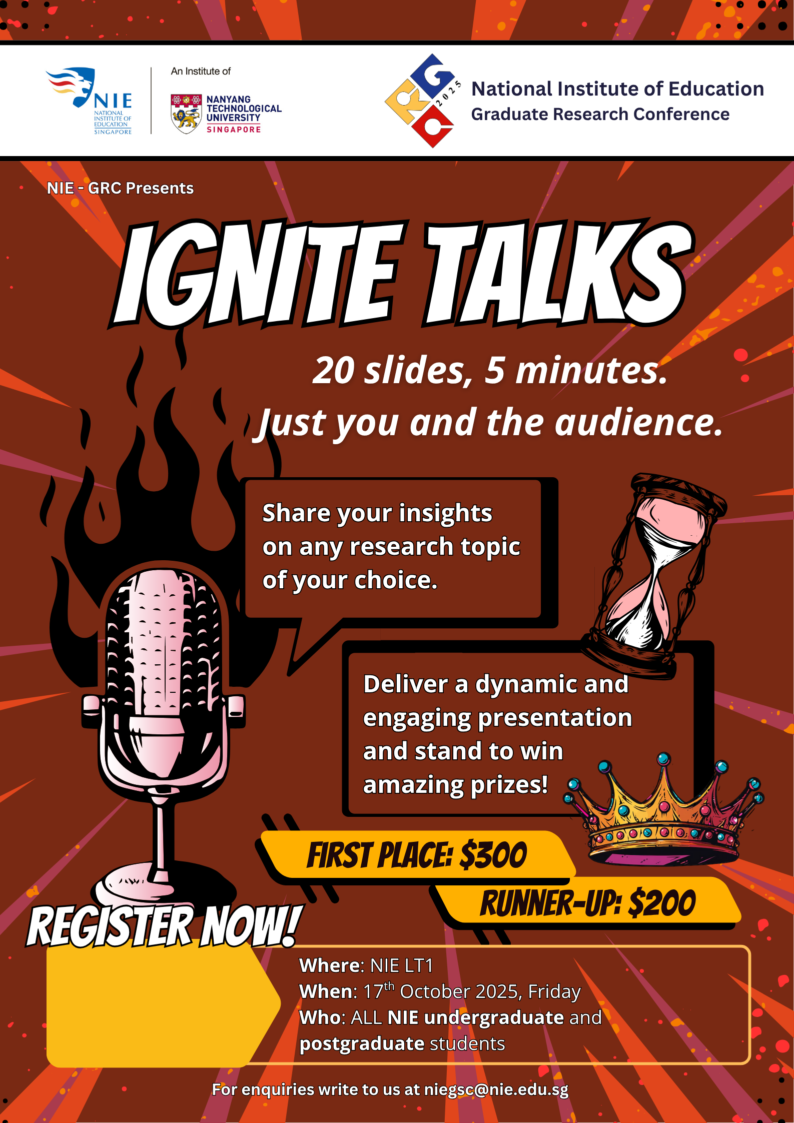 IgniteTalks 2025 is an event organized as part of the NIE Graduate Research Conference (NIE-GRC) and provides opportunities for you, NIE students, a platform to showcase your research in a heart-pulsing format where you have 5 mins to present your idea / work using 20 slides where the slides automatically advance every 15 secs!