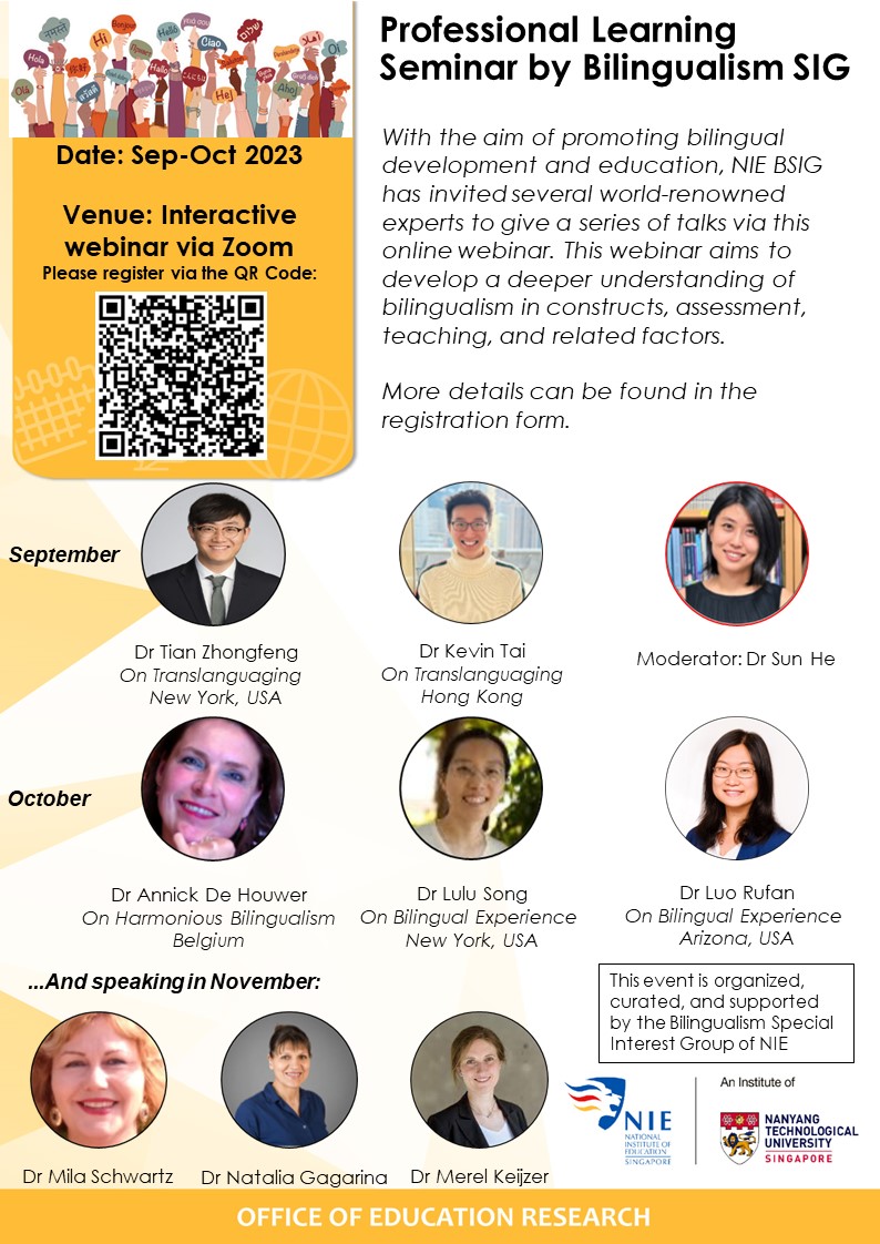 With the aim of promoting bilingual development and education, NIE BSIG has invited several world-renowned experts to give a series of talks via this online webinar. This webinar aims to develop a deeper understanding of bilingualism in constructs, assessment, teaching, and related factors.
