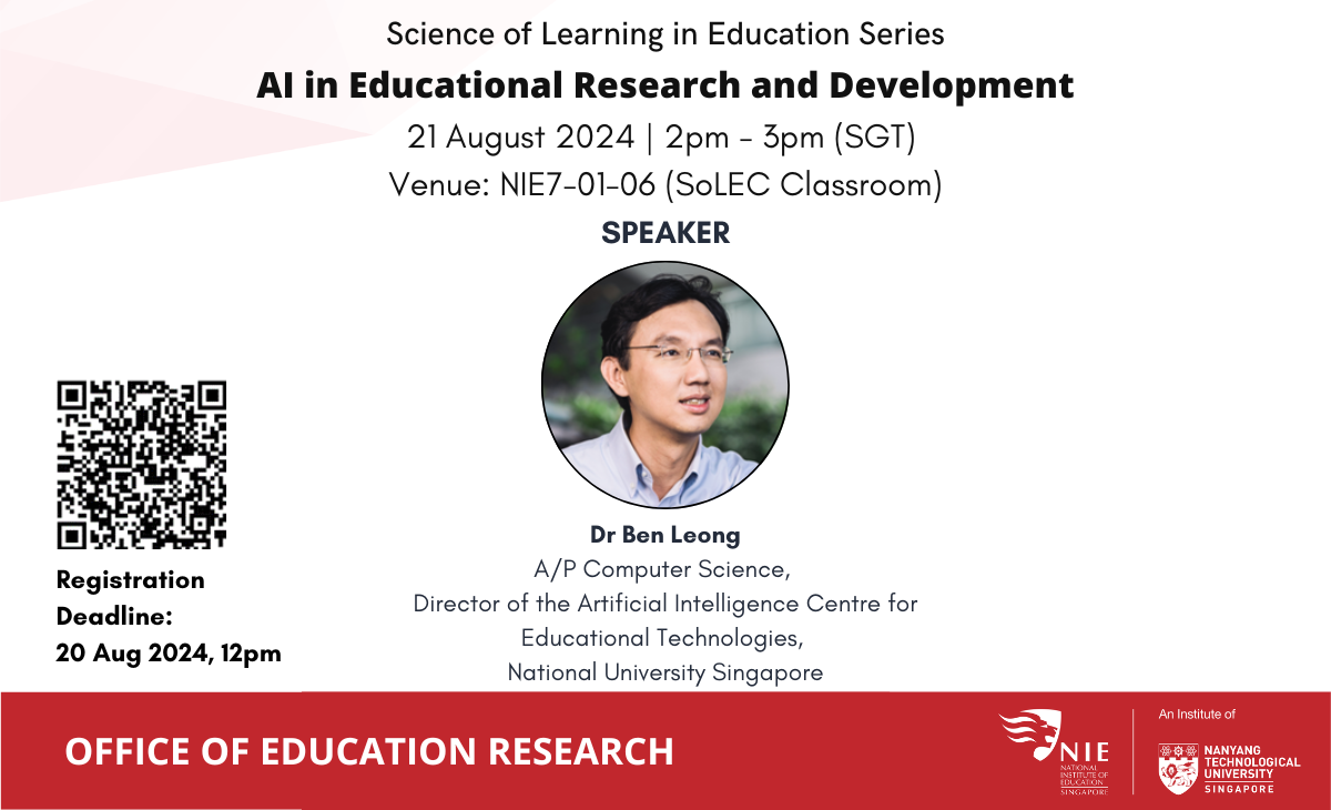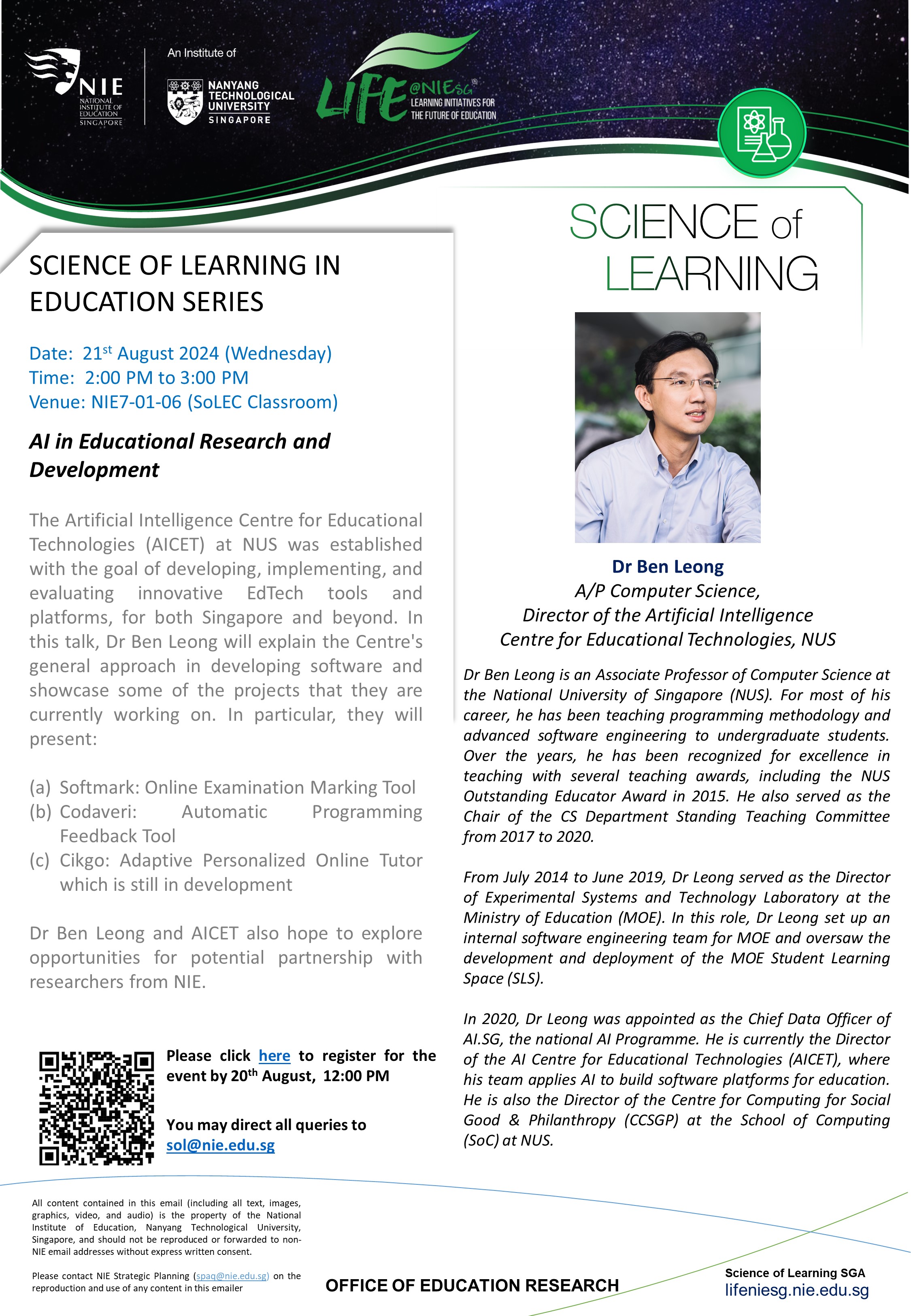 Join us in our Science of Learning in Education Series where Dr Ben Leong will share the Artificial Intelligence Centre for Educational Technologies' (AICET) approach to developing EdTech software as well as the use of AI in Education Research and Development on Wednesday, 21st August 2024. Sign up here: bit.ly/4dpUkbR