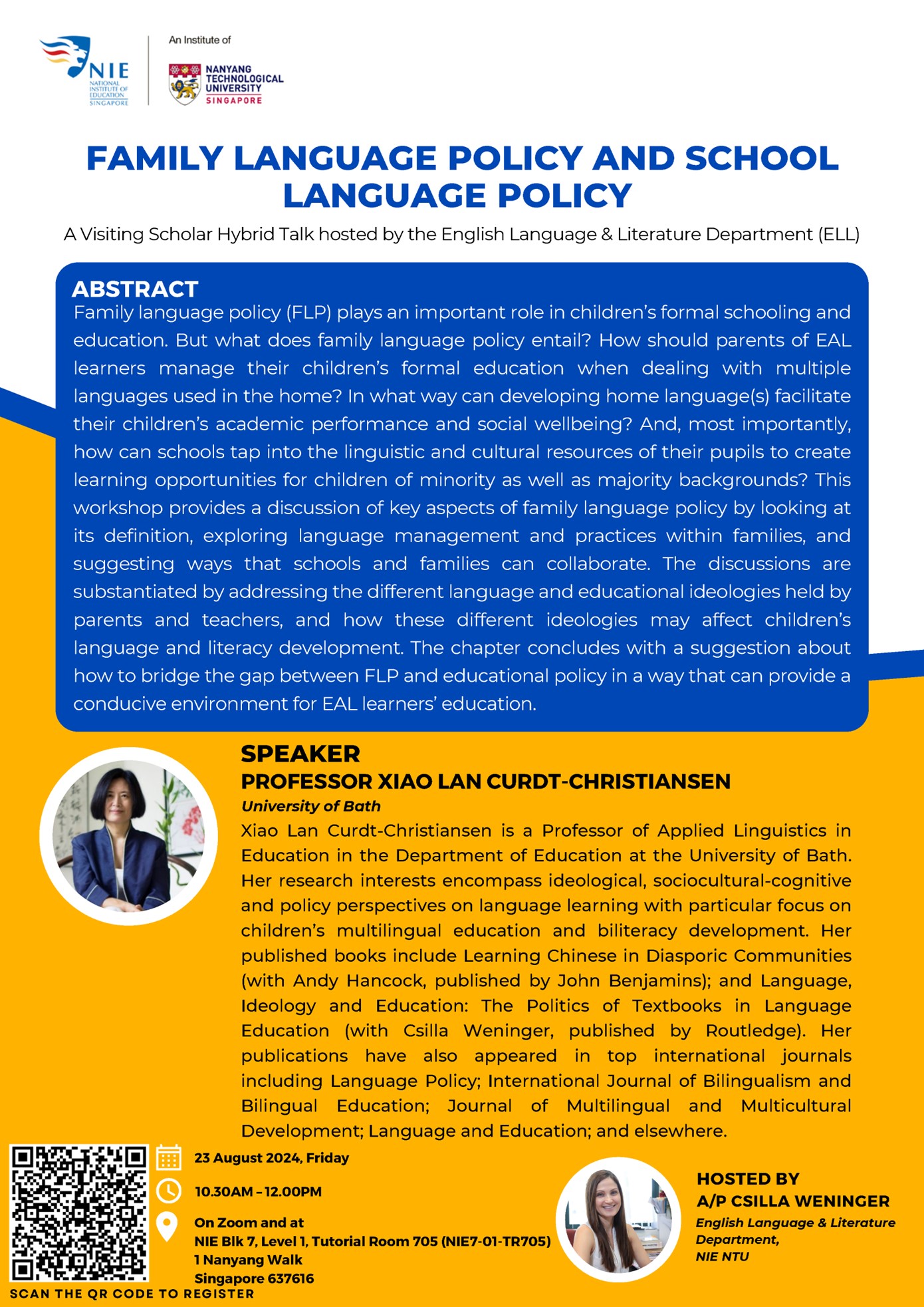 We are pleased to invite you to attend an upcoming hybrid talk by Professor Xiao Lan Curdt-Christiansen on ‘Family Language Policy and School Language Policy’.