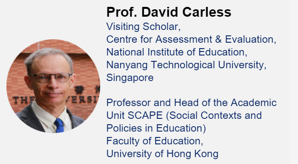 About the SpeakerDavid Carless works as a Professor at the Faculty of Education, University of Hong Kong, and is Head of the Academic Unit SCAPE (Social Contexts and Policies in Education). He is one of the pioneers of feedback literacy research and is listed as a top 0.1% cited researcher in the Stanford top 2% list for social sciences. His books include "Designing effective feedback processes in higher education: A learning-focused approach", by Winstone and Carless, 2019 published by Routledge. He was the winner of a University Outstanding Teaching Award in 2016. The latest details of his work are on his website: https://davidcarless.edu.hku.hk/. | Appointment of Visiting Scholar:The Centre for Assessment & Evaluation (CAE) is delighted towelcome Professor David Carless as Assessment's VisitingScholar. He will contribute significantly to the state of assessmentin NIE and school contexts through seminars and consultations.Prof Carless has an upcoming seminar titled, AssessmentRe-designs for GenAI: Principles and Practices this September.The seminar will touch on some key principles andpractices to inform assessment design in the age of GenAI.For more information on the seminar, kindly view the detailsfound below: |