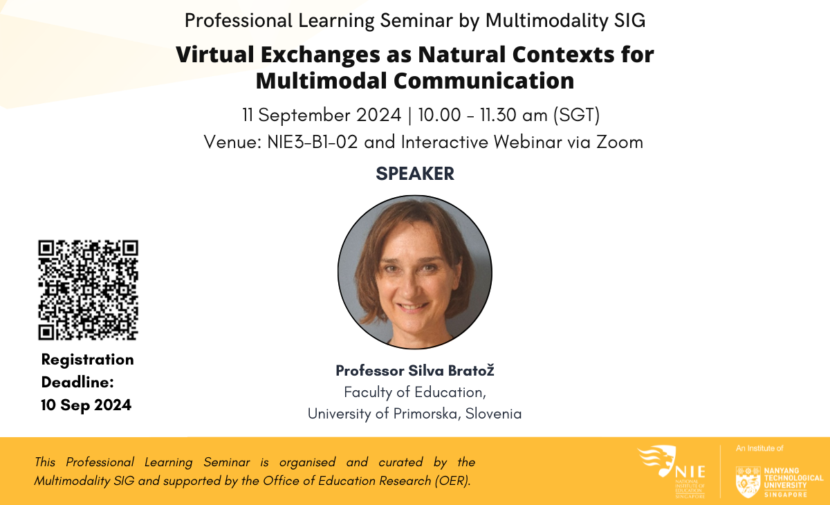 Join us on 11 Sept 2024 for a talk by Prof Silva Bratož on how Virtual Exchanges (VE) foster dynamic multimodal communication. She will present findings and student perceptions from the "Diva Project," an Erasmus+ collaboration across four European countries, where education students developed multilingual and multicultural skills in a linguistically and culturally diverse online study space. Sign up here: https://survey.ntu.edu.sg/EFM/se/3B8716402BF1950E