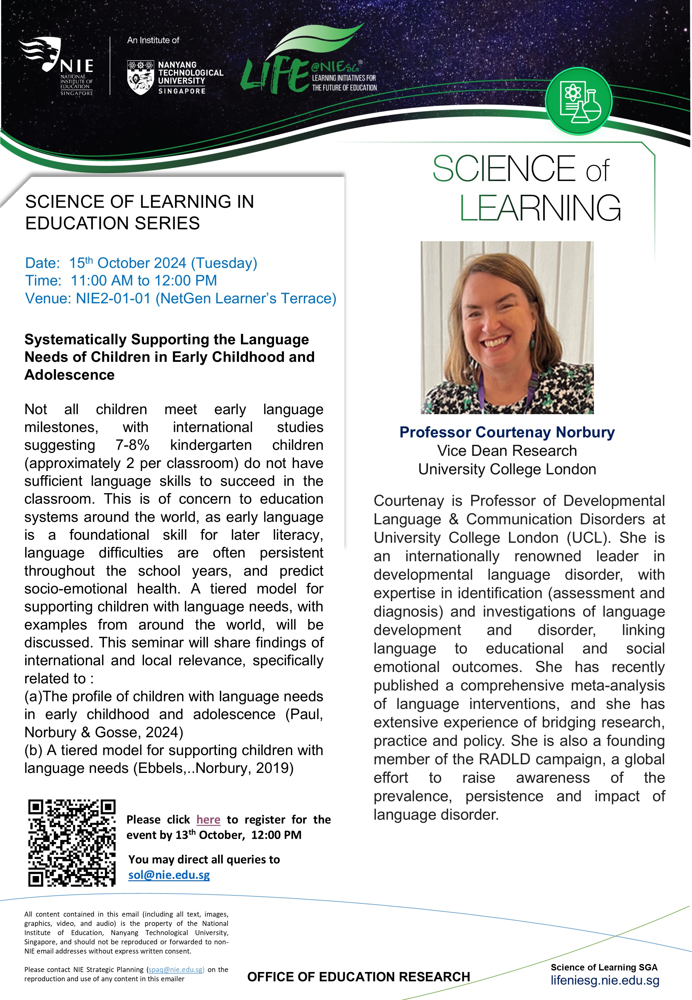 Join us in our Science of Learning in Education Series on Tuesday, 15 Oct 2024 where Professor Courtenay Norbury will share findings of international and local relevance, specifically related to profile of children with language needs in early childhood and adolescence and a tiered model for supporting children with language needs. Sign up here: https://survey.ntu.edu.sg/EFM/se/3B87164024C3E454
