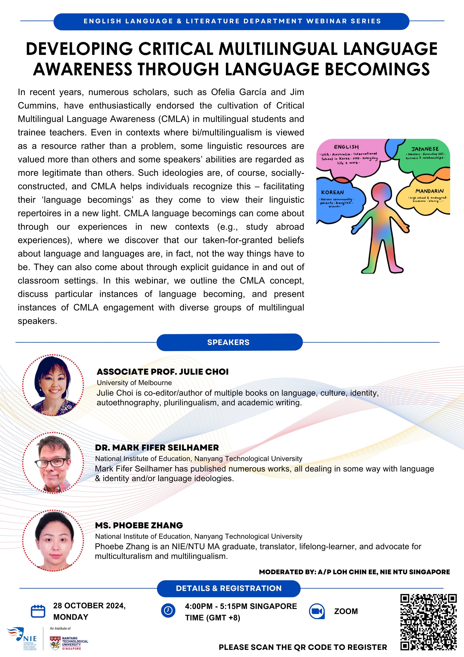 We are pleased to invite you to attend an upcoming webinar on 'Developing Critical Multilingual Language Awareness Through Language Becomings' on 28 October 2024 (Monday), at 4.00 - 5.15pm (Singapore time).