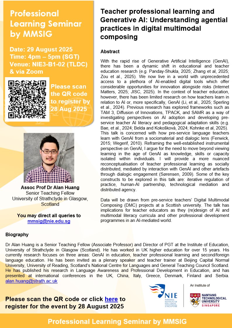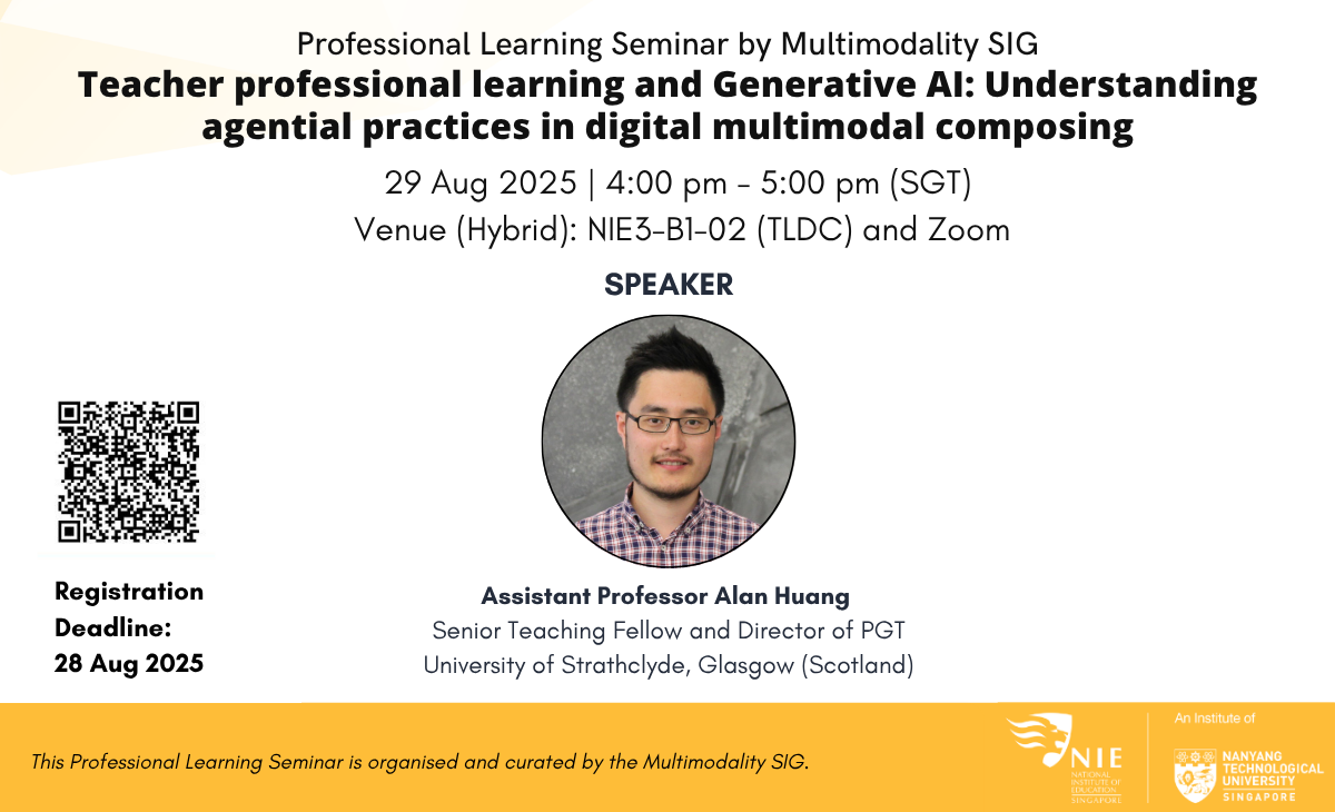 Join us on 24 August where Associate Professor Alan Huang will share how teachers' learning can be re-conceptualised in the age of Generative AI, in the directions of multimodal literacy and human-AI partnership. Sign up here: https://survey.ntu.edu.sg/EFM/se/3B8716403913383F