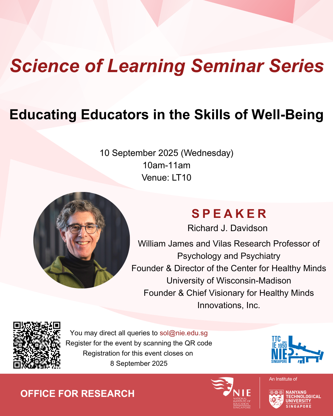 Join us in our Science of Learning in Education Series on Wednesday, 10 September 2025, at LT10 (National Institute of Education) by Dr. Richard J. Davidson, Professor of Psychology and Psychiatry from the University of Wisconsin-Madison.