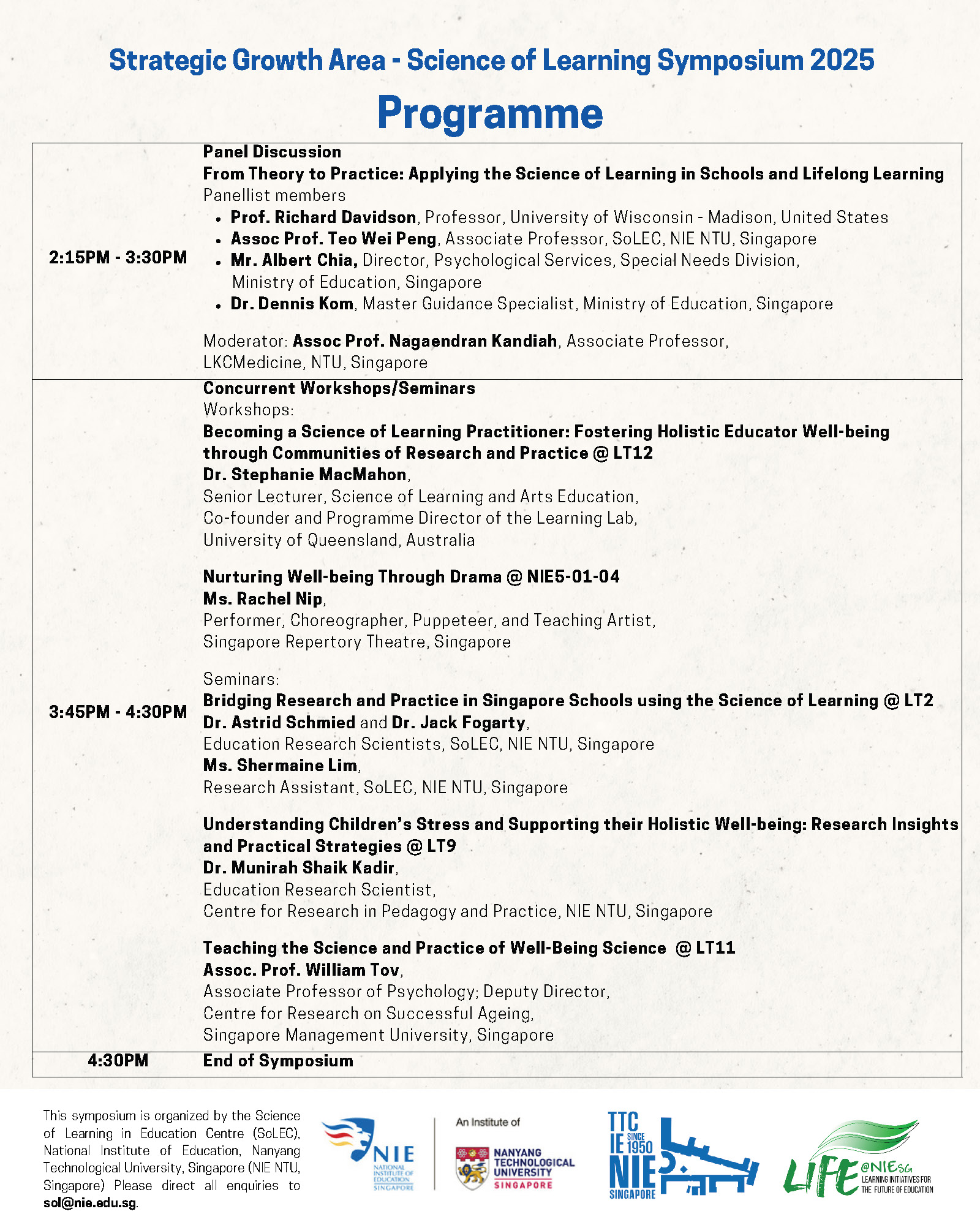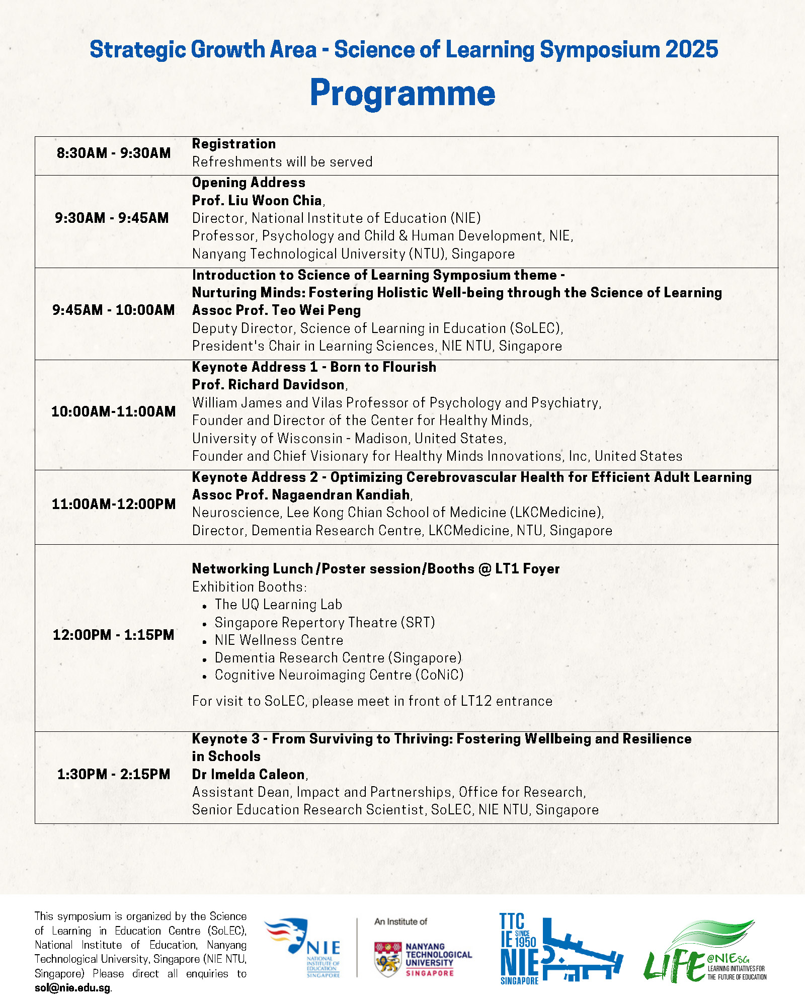 The symposium aims to explore holistic approaches to education that prioritize the well-being and holistic development of learners. This includes integrating insights from the science of learning into educational practice and policy to create environments that support cognitive, emotional, social, and physical growth. The symposium aims to bring together researchers, educators, policymakers, and practitioners to share knowledge, exchange ideas, and collaborate on strategies to enhance learning experiences and outcomes for all individuals.