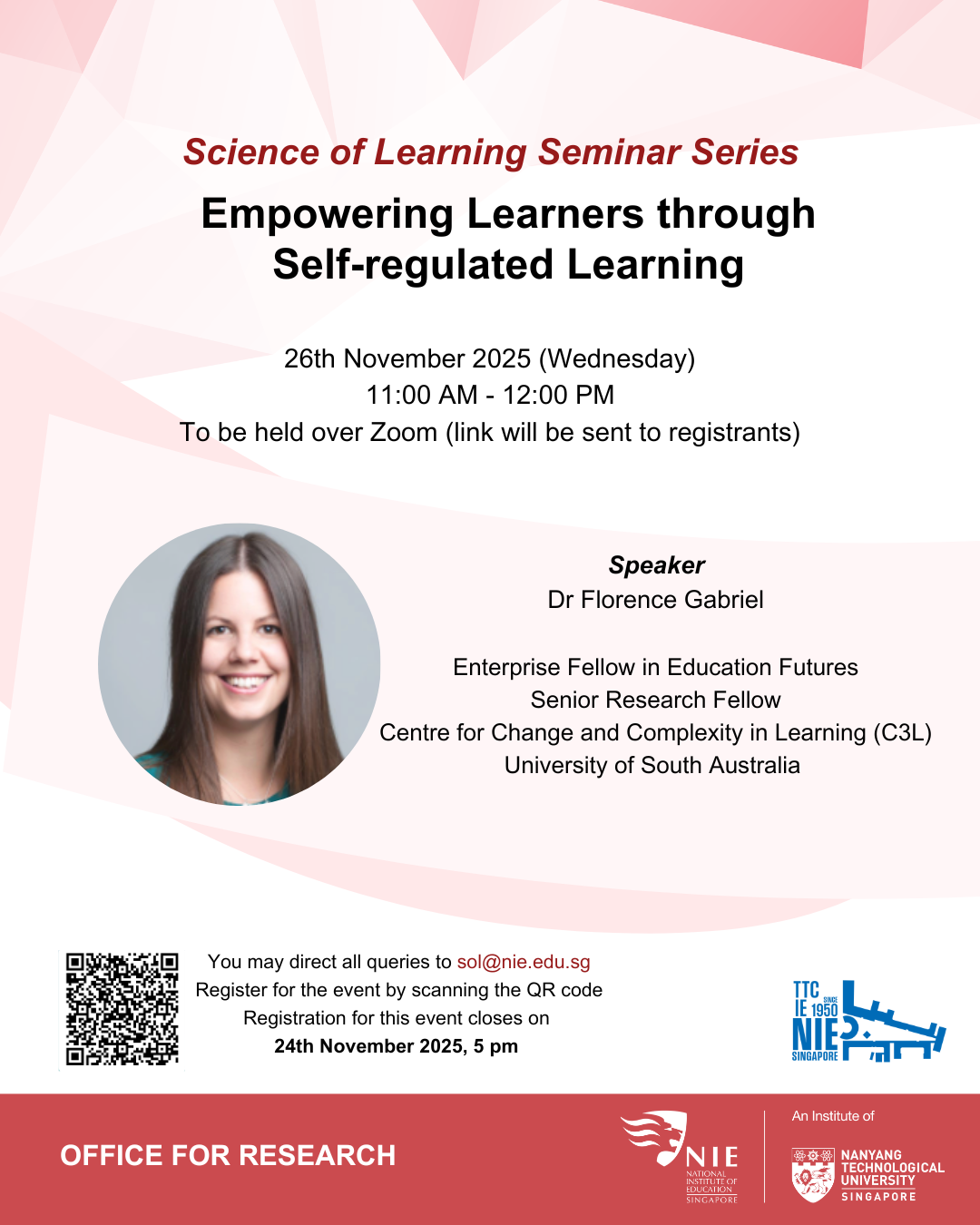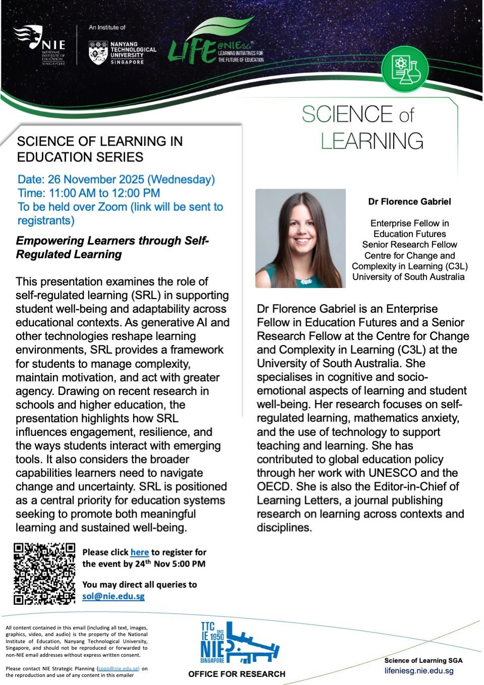 Join us in our Science of Learning in Education Series on Wednesday, 26 November 2025 by University of South Australia from the Dr Florence Gabriel on "Empowering Learners through Self-Regulated Learning". Sign up here: https://forms.cloud.microsoft/Pages/ResponsePage.aspx?id=SJPOFSq-K0aPwOF2WpsgSgot5vD7JwhBvAYEqihGapxUNTlGMVdIRVlPWlRLT0s3TUdBWVc5TzFUNy4u&origin=QRCode