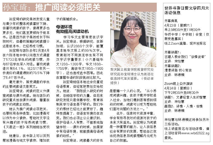 Lianhe Zaobao noted that reading interests and habits should be cultivated from an early age, but the concepts and methods to do so were still lacking. Local poet and publisher Denon Lim said that since 2020, local schools were more inclined towards e-reading, and Lingzi Media, which was founded by him, had set out to create an online reading community and online reading packages for teenagers. Song Yihui, a best-selling author in Taiwan, commented that teaching Mandarin in Singapore was similar to teaching foreign languages or classical Mandarin in Taiwan, and that it was important to create conversations with students instead of adopting a one-way approach. For example, as a language teacher, her job was to translate classical Mandarin into modern Mandarin without violating the authors’ original intention, and to build bridges between children and their forefathers. A researcher at the Centre for Research in Child Development at NTU NIE, Sun Baoqi and her team surveyed 5,732 students from six local secondary schools from February to April 2021 to find out about their reading habits. From their in-depth conversations with 67 students, they found that only 64.1% liked reading, a decrease of 6.4%-points from another similar survey in 2017. She suggested that having a home environment that encouraged the usage of mother tongue would help to improve students’ motivation to read in their mother tongue.