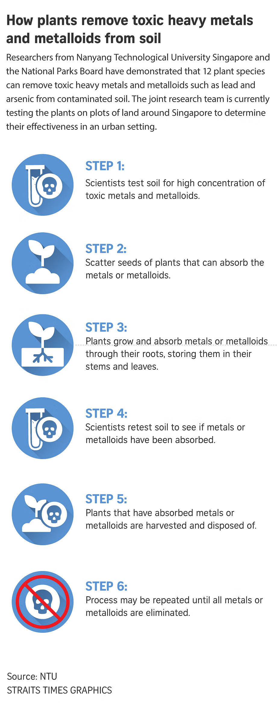 SINGAPORE - Plants readily found in Singapore are now being tapped to clean the soil of toxic contaminants, with 12 tropical species identified to take on the job.