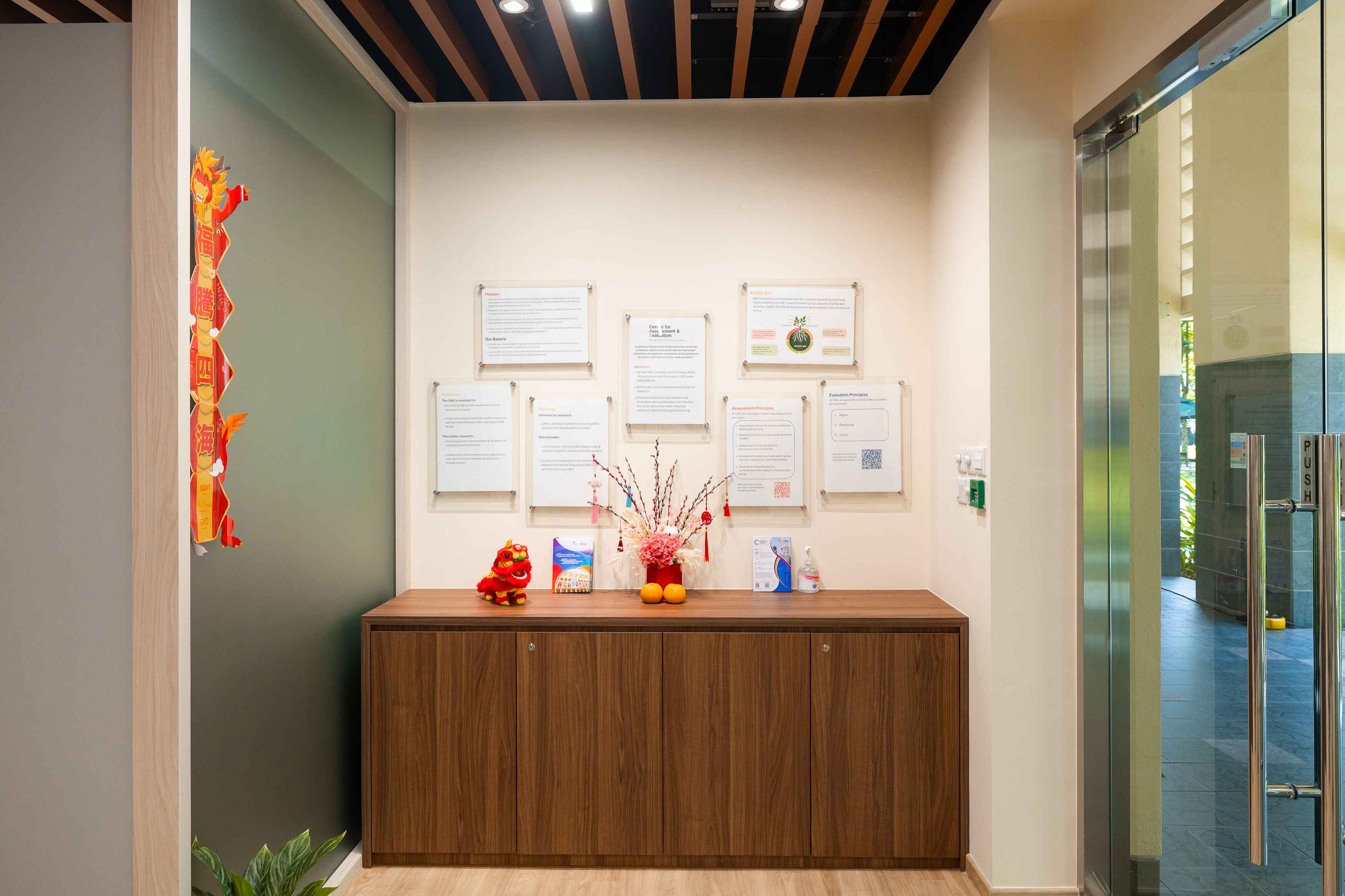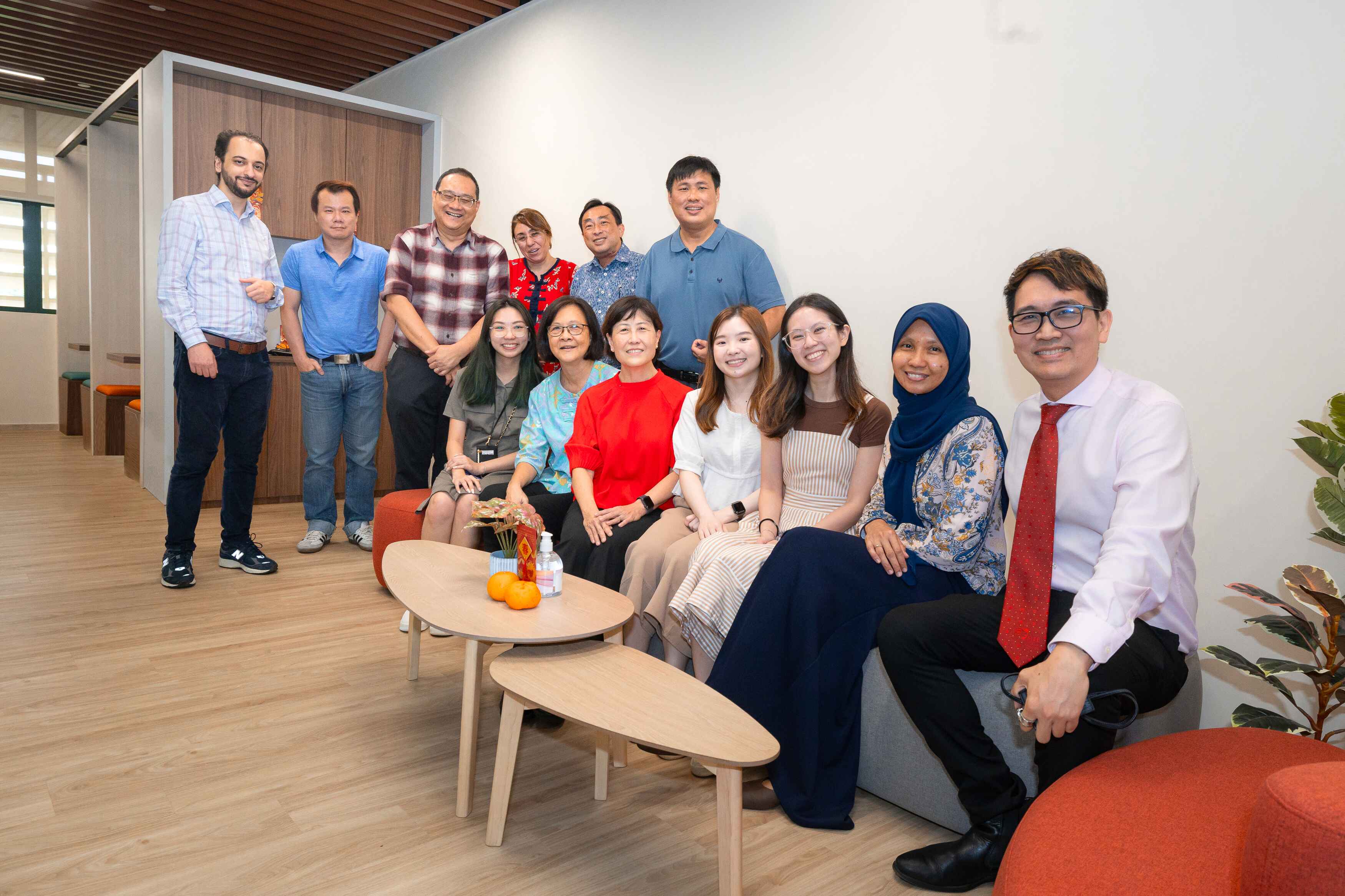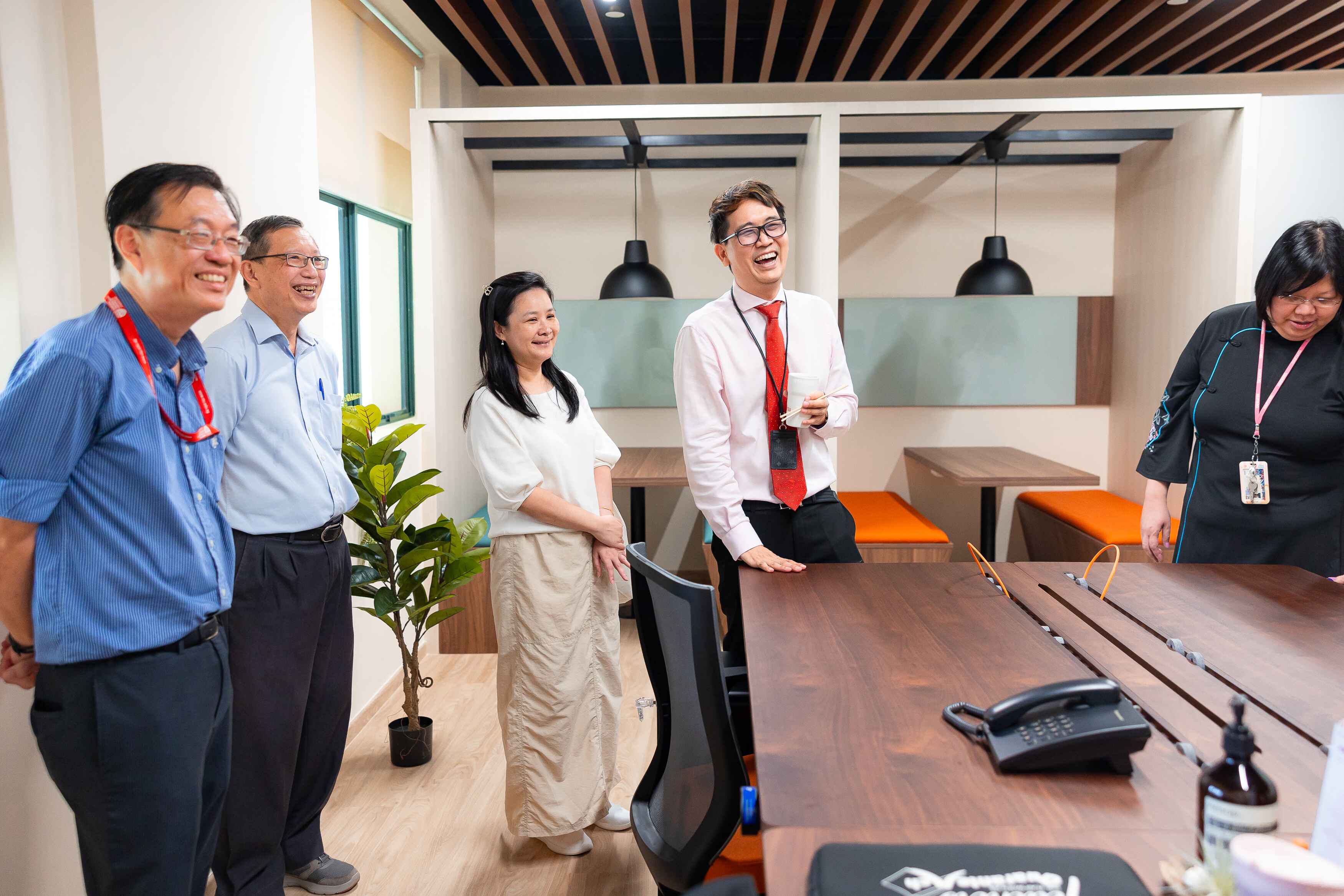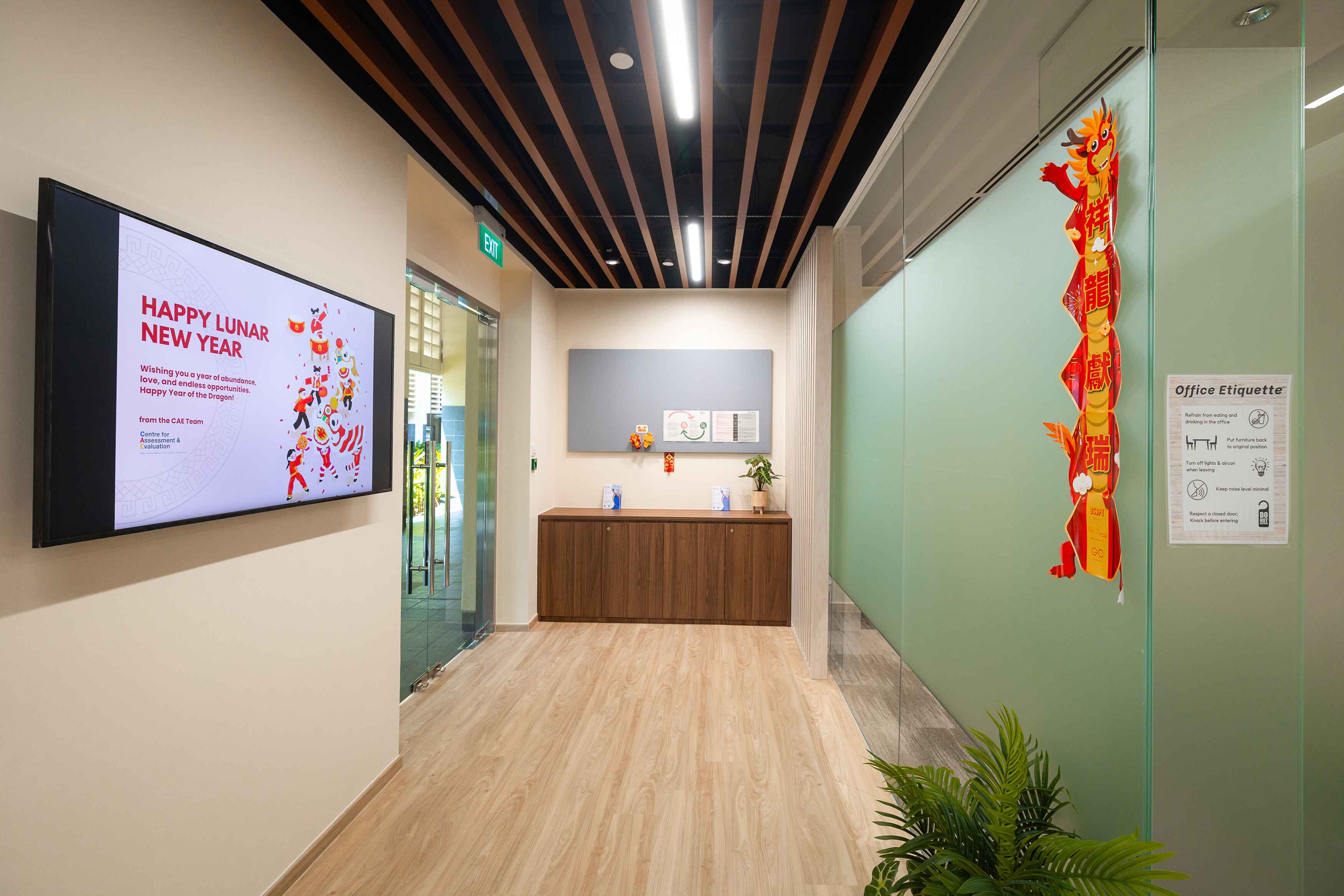 Located at NIE5-01-06, the office features a meeting room, lounge area and an open-concept workstation equipped with standing desks.