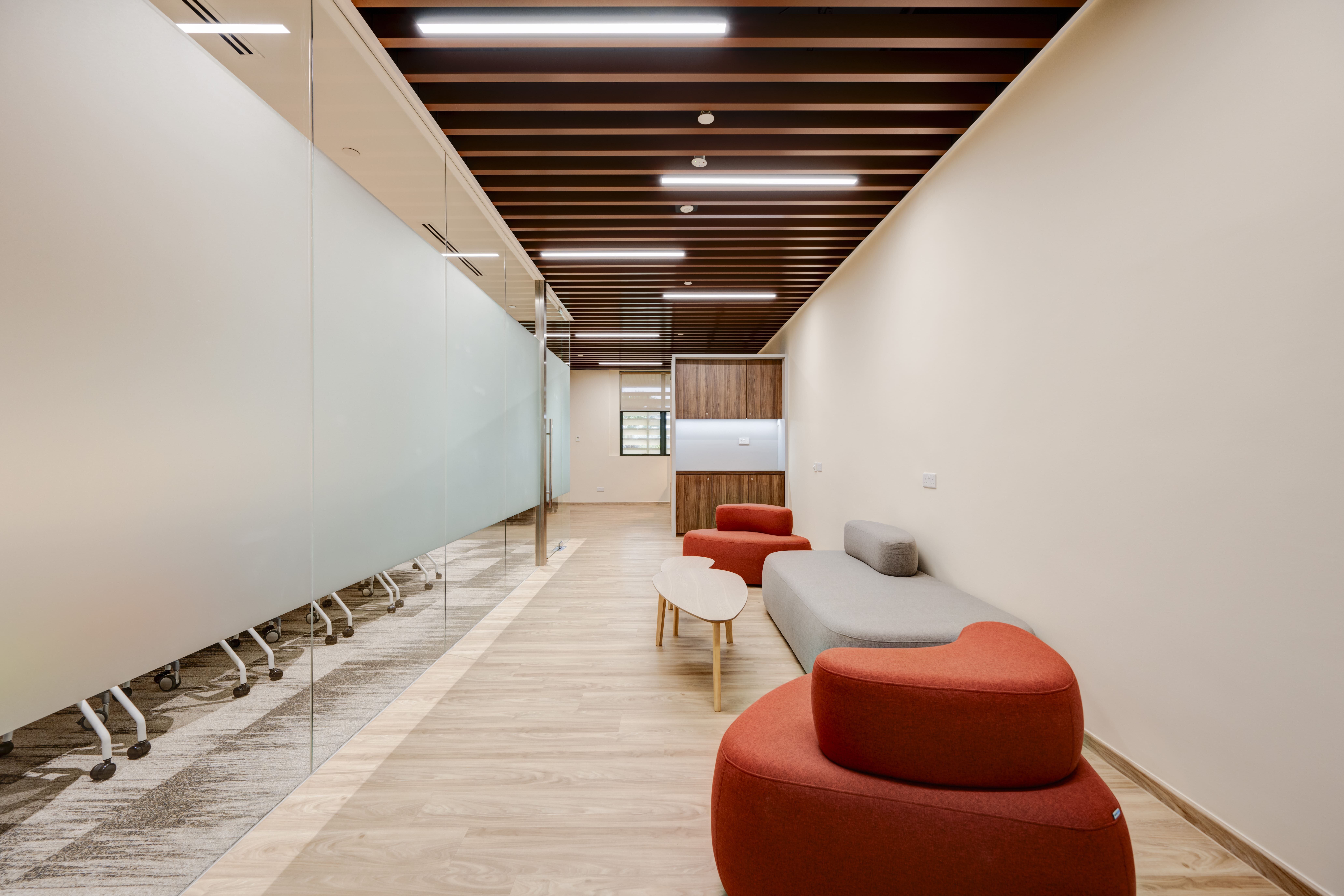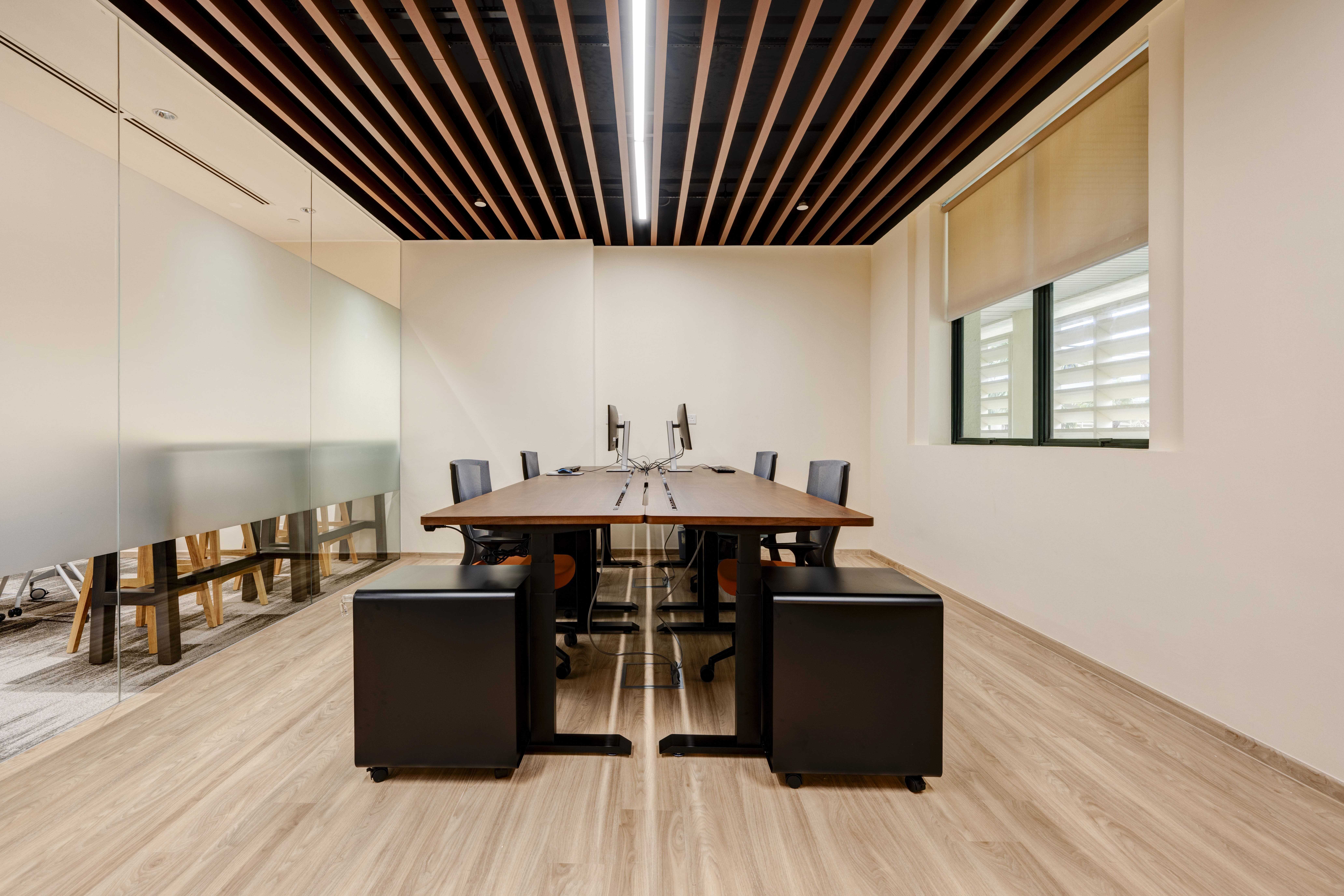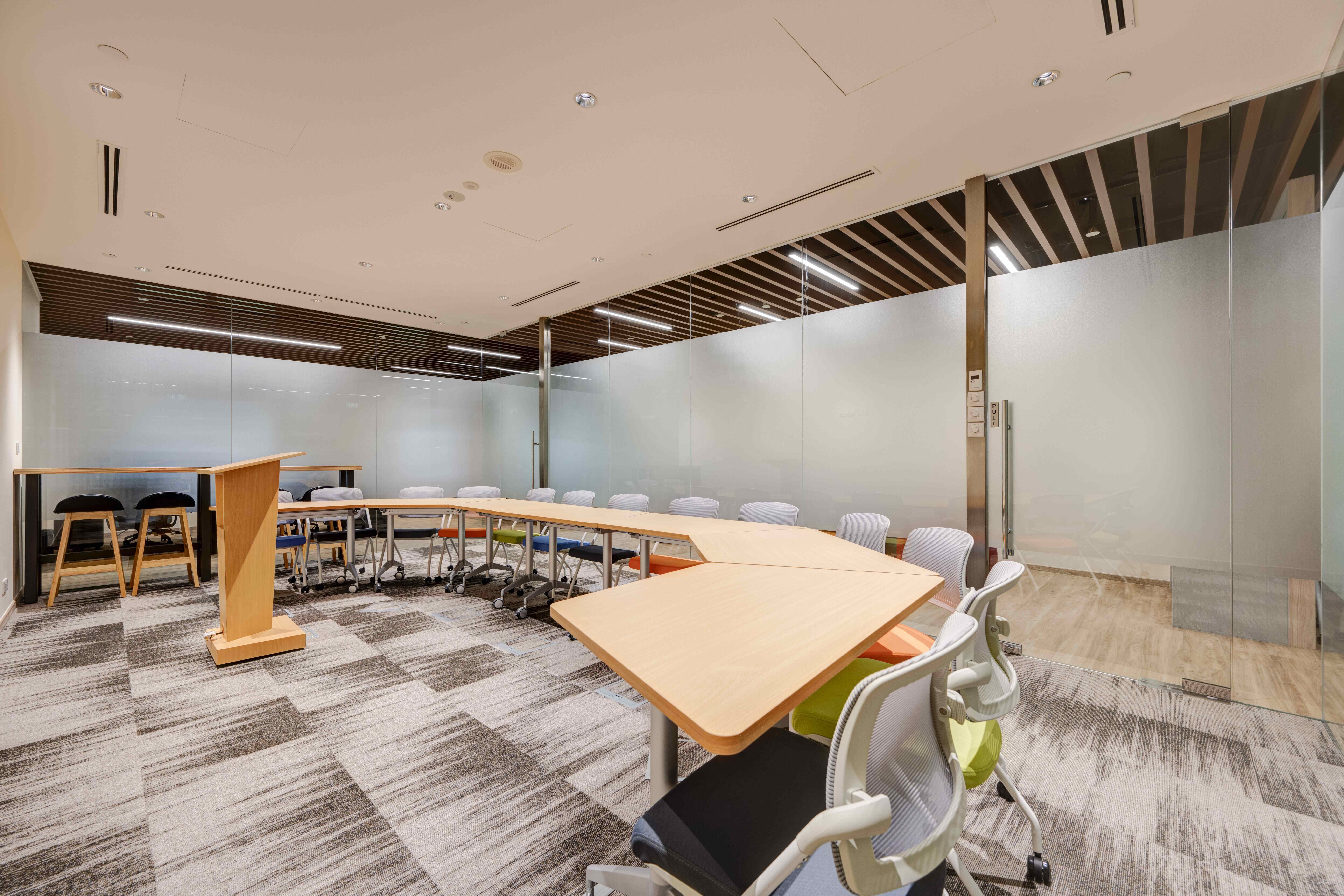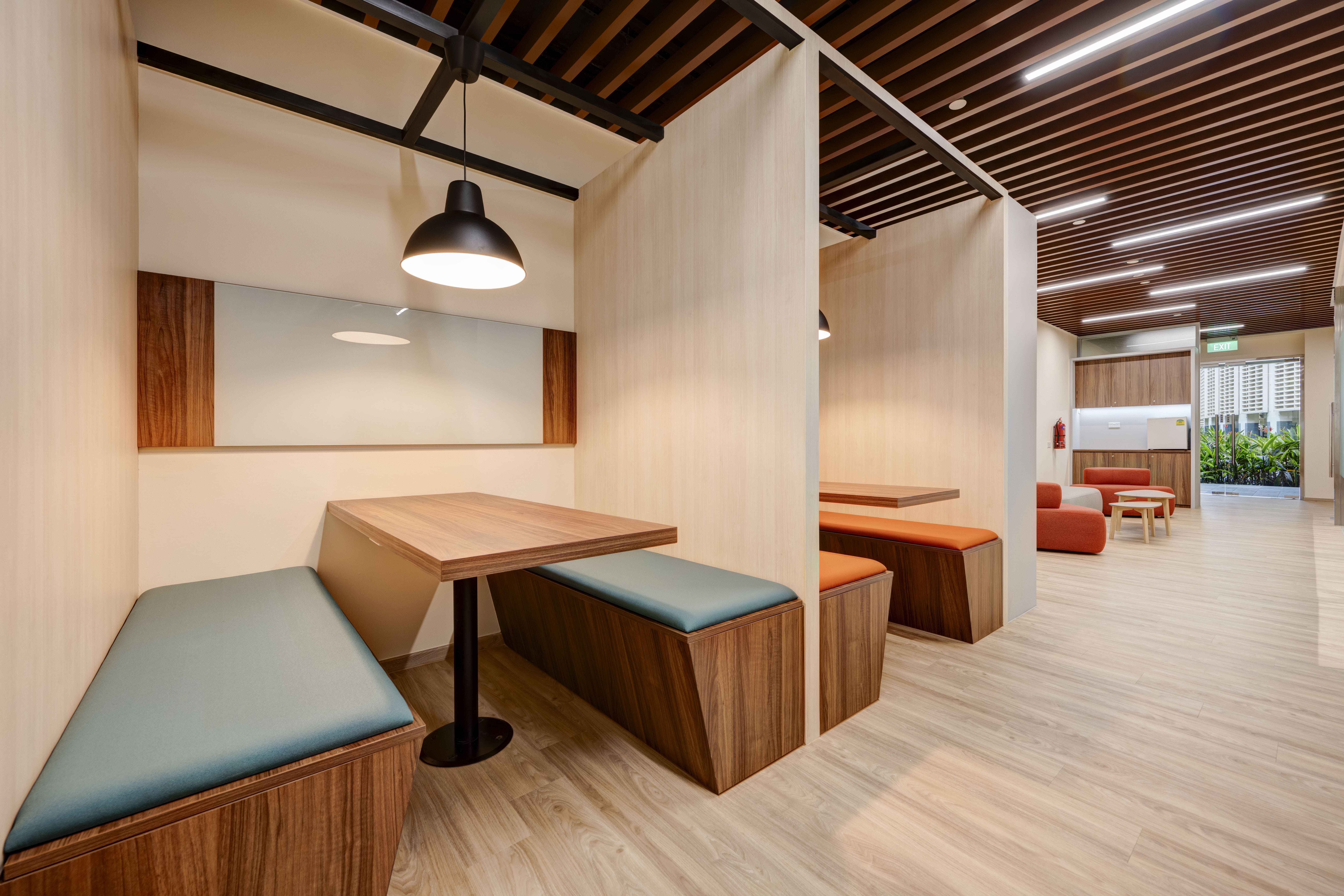 Located at NIE5-01-06, the office features a meeting room, lounge area and an open-concept workstation equipped with standing desks.