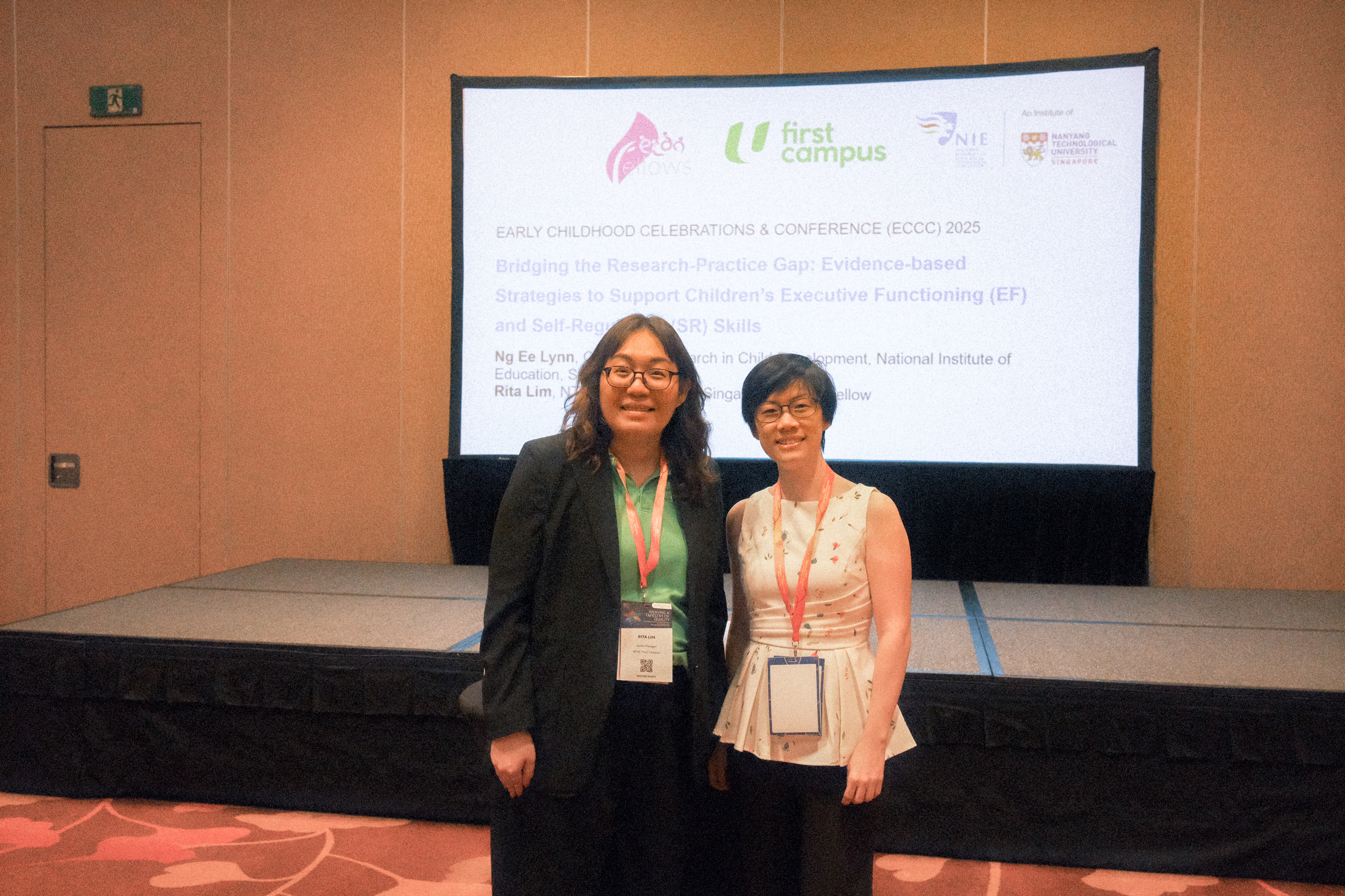 From 25 – 26 September 2025, Dr Ng Ee Lynn, Assistant Centre Director at the Centre for Research in Child Development (CRCD), attended the Early Childhood Celebrations & Conference (ECCCat the Marina Bay Sands Convention Centre. She conducted a workshop titled, "Bridging the Research-Practice Gap: Evidence-based Strategies to Support Children’s Executive Functioning and Self-Regulation Skills", where she explored evidence-based strategies for developing children's self-regulation and executive functioning skills in early childhood settings. Participants also engaged in hands-on activities and role-play to learn practical approaches adaptable across different ages and needs.