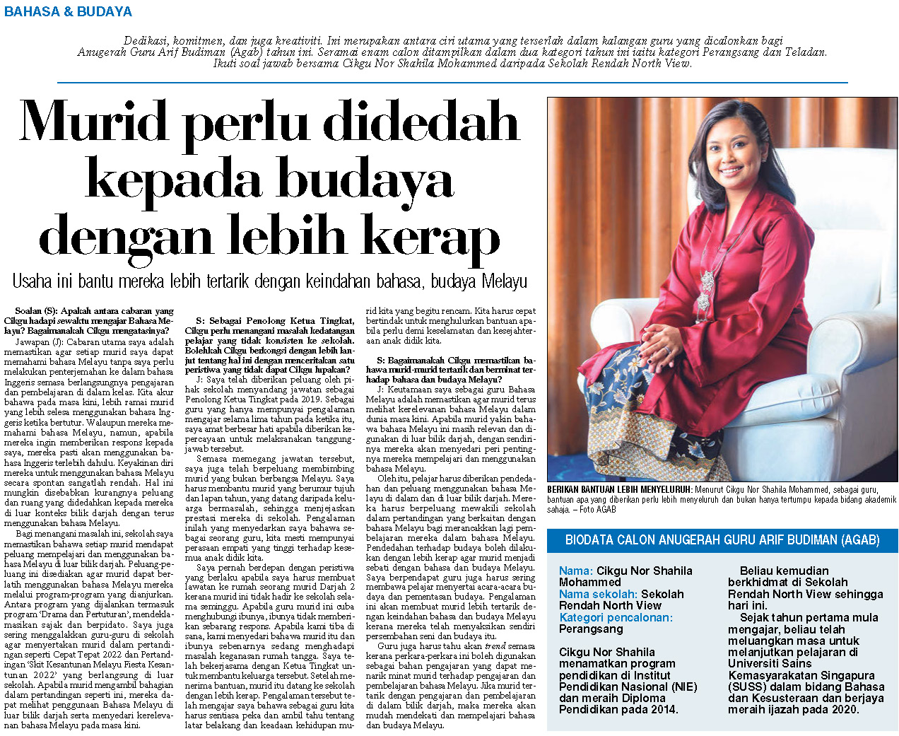 Dedication, commitment, and creativity. This is one of the main characteristics that stand out among the teachers nominated for the Arif Budiman Teacher Award (Agab) this year. A total of six candidates are featured in two categories this year, namely the Stimulator and Role Model category. Berita Harian interviewed Teacher Nor Shahila Mohammed from North View Primary School on why pupils need to be exposed to culture more often. This effort helps them to be more interested in the beauty of the Malay language and culture.