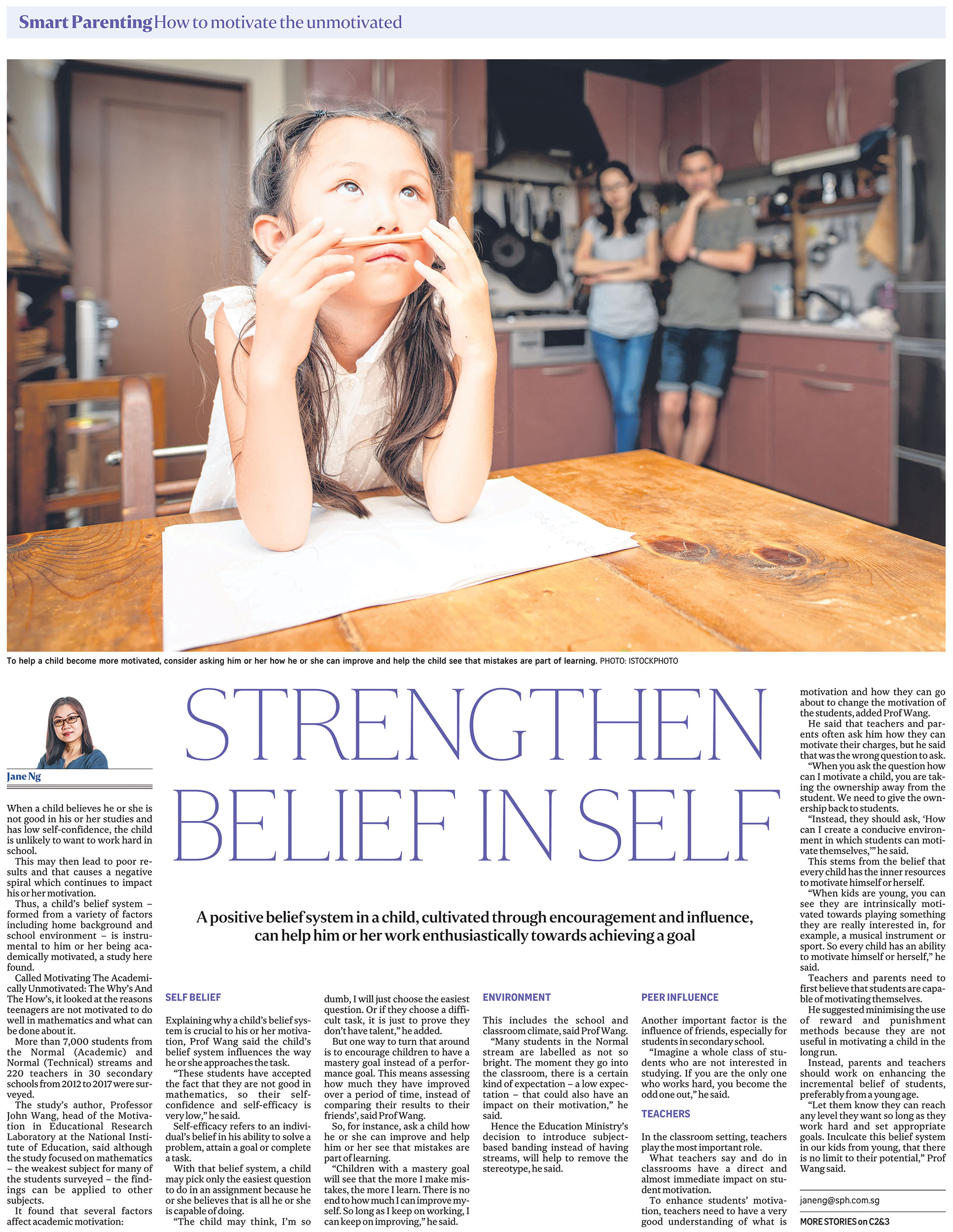 Professor John Wang contributed to Straits Times on the area of Smart Parenting: How to motivate the unmotivated. He provided his expertise through suggesting some tips to build a positive belief system around the child.