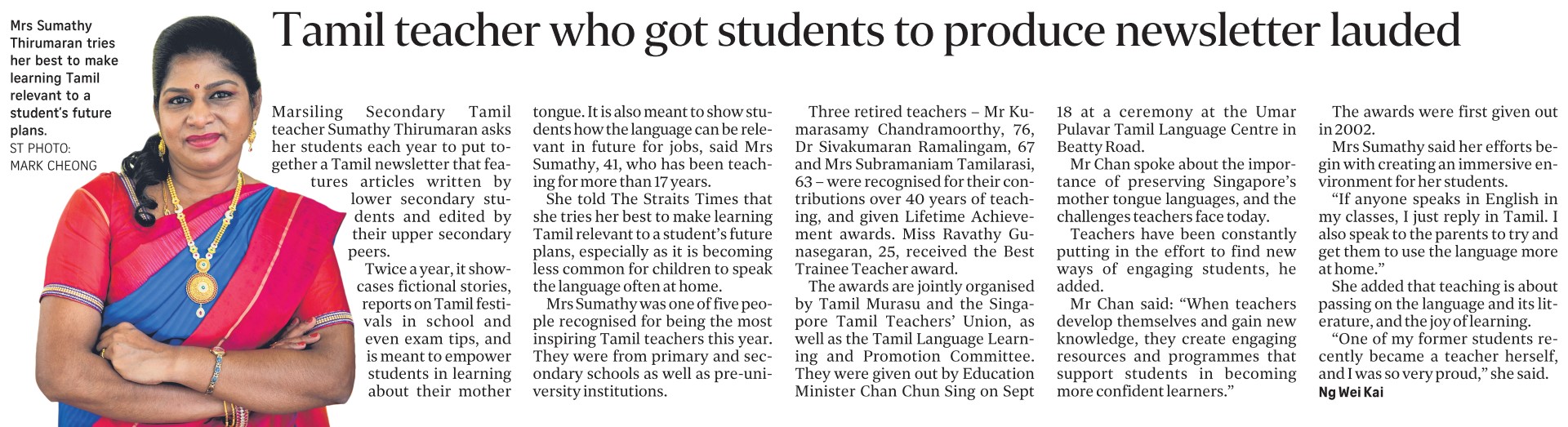 Marsiling Secondary Tamil teacher Sumathy Thirumaran asks her students each year to put together a Tamil newsletter that features articles written by lower secondary students and edited by their upper secondary peers.