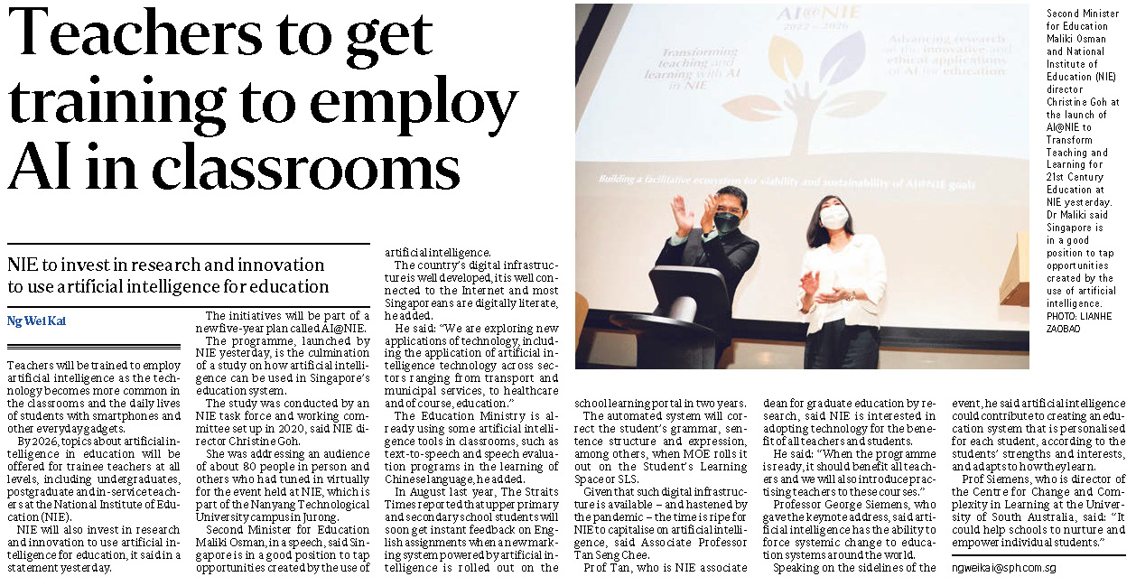 Published on 26 May 2022 Teachers to get training to employ AI in classrooms Source: The Straits Times © SPH Media Limited. Permission required for reproduction