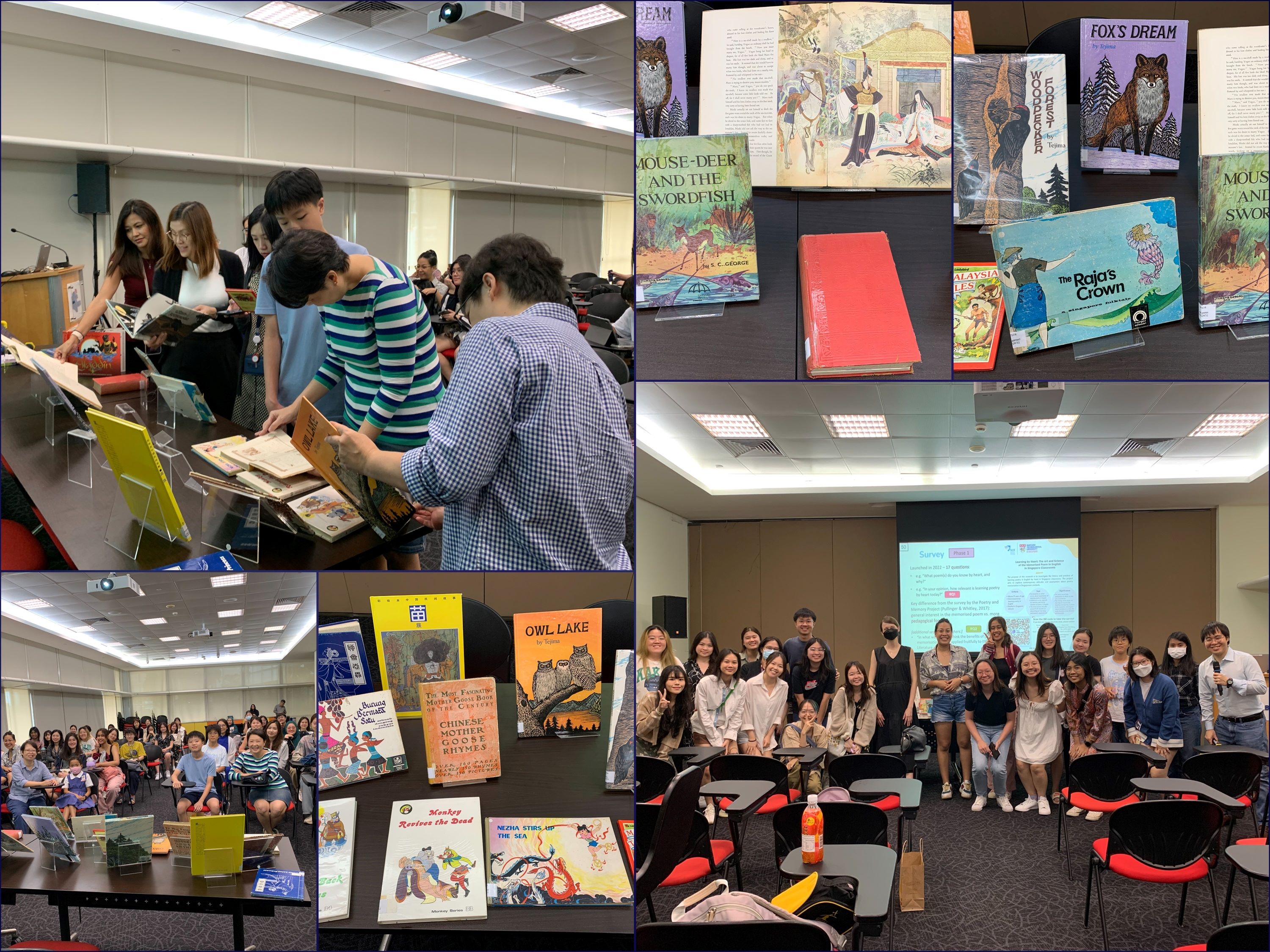 Our NIE/NTU ELL students taking the courses MEL918 Reading in a Multimodal Age and HL2042 Children’s Literature (led by A/P Loh Chin Ee and Dr Katherine Wakely-Mulroney respectively) participated in guided tours of exhibitions held at the National Library Board (NLB). These exhibitions comprised the Historical Asian Children’s Literature (HACL) Collection, which was recognised in 2022 by the UNESCO Memory of the World Committee for Asia-Pacific (MOWCAP) as an indelible part of our region’s culture and heritage, and the Donor Gallery, which showcases a sampling of rare publications and selected out-of-print children’s books gifted by donors. In addition, Ow Yeong Wai Kit (ELL PhD Candidate) presented a historical overview about learning poetry by heart for children, featuring insights from the archives at the National Library. By all accounts, the excursion offered our students fascinating glimpses into how children’s literature has evolved over time, as well as the sheer range and diversity of children’s books across Asia.