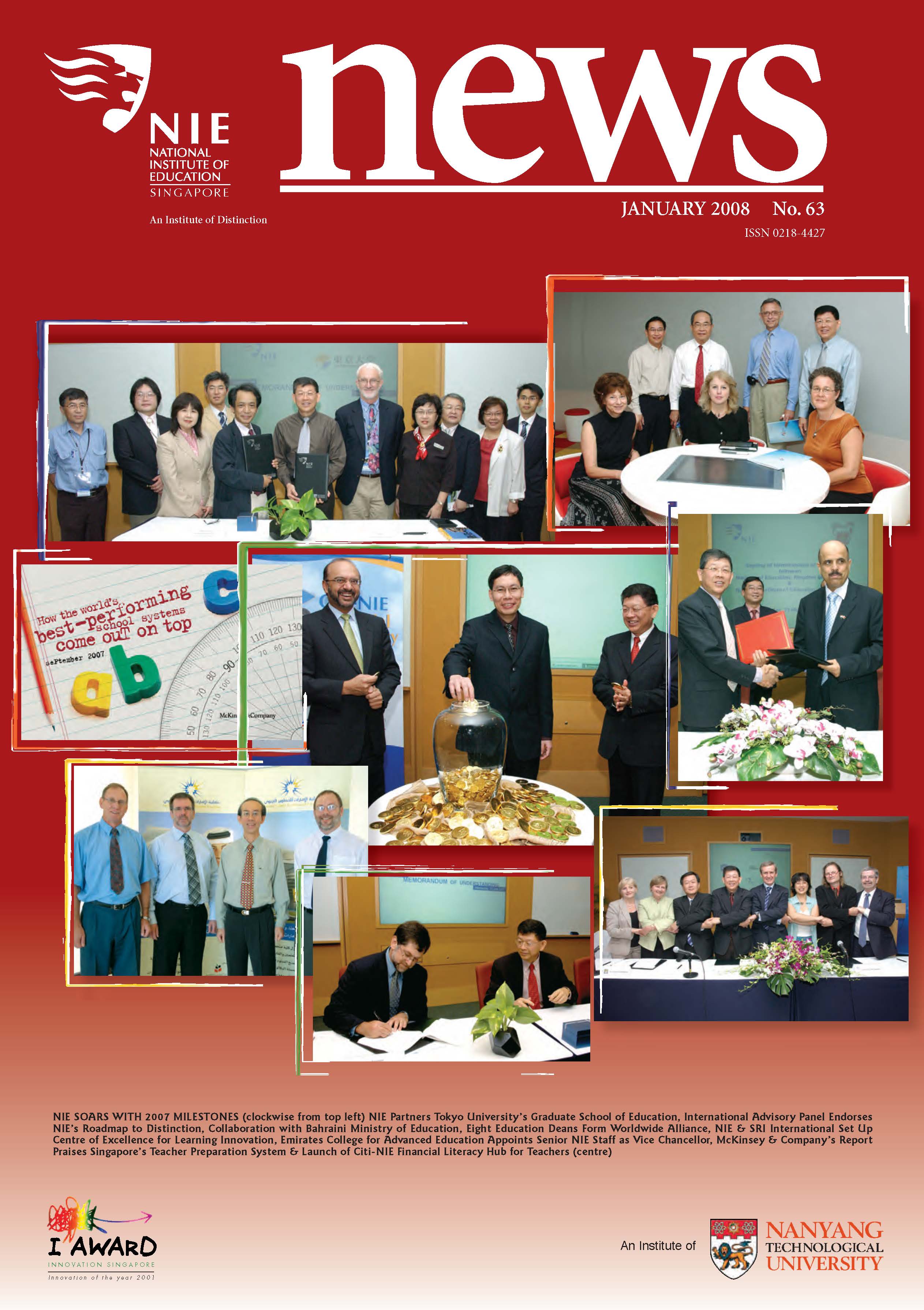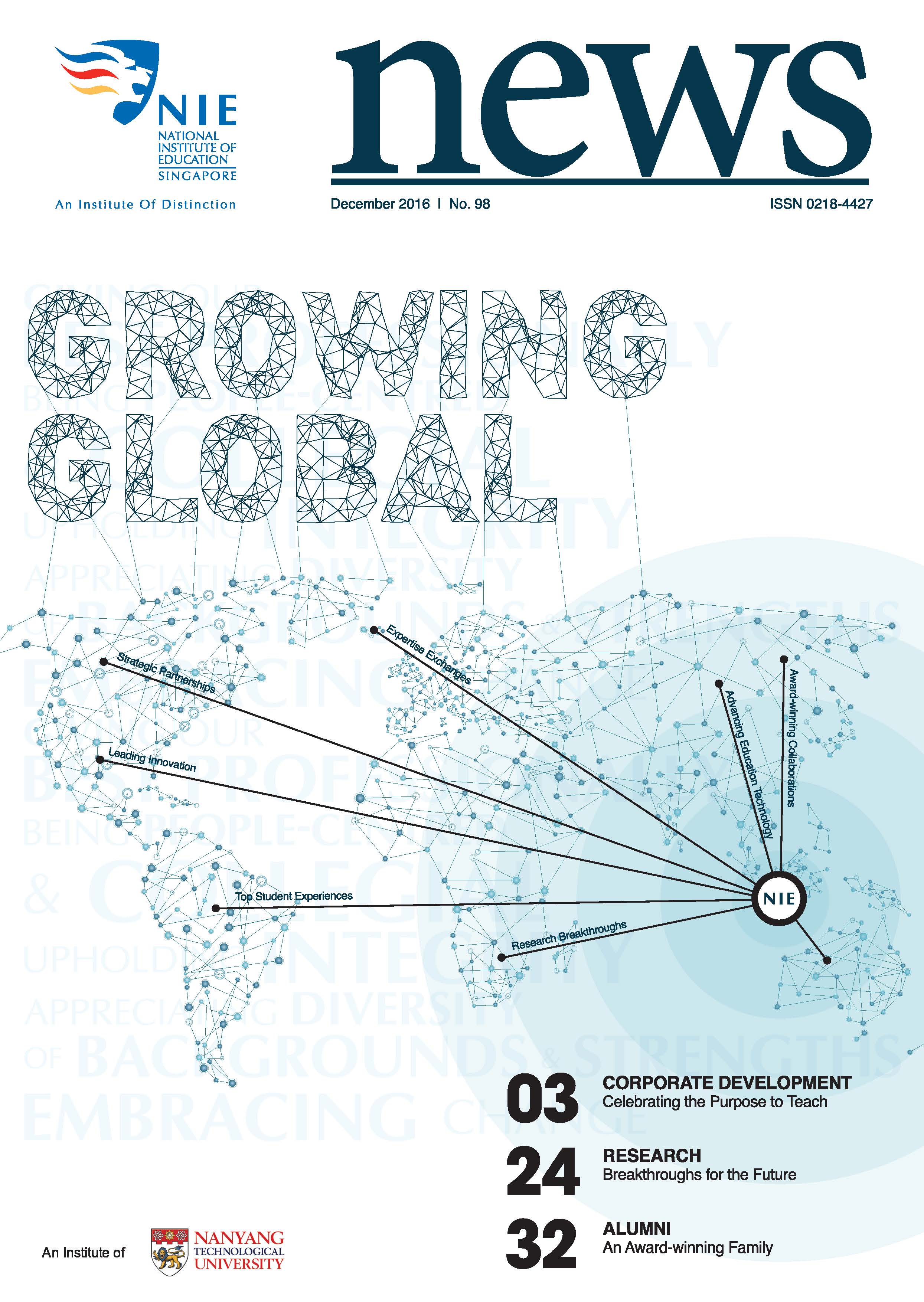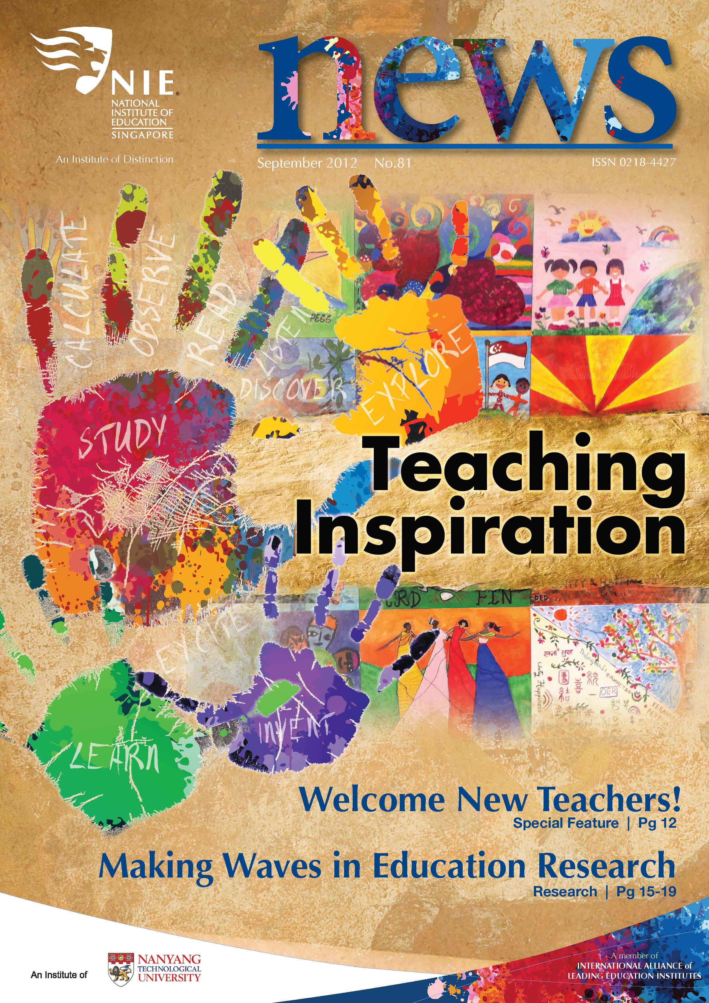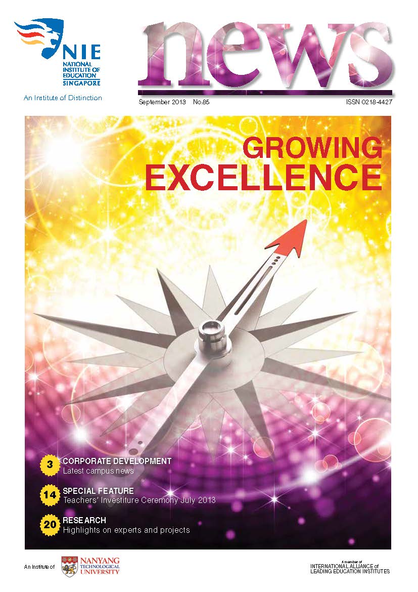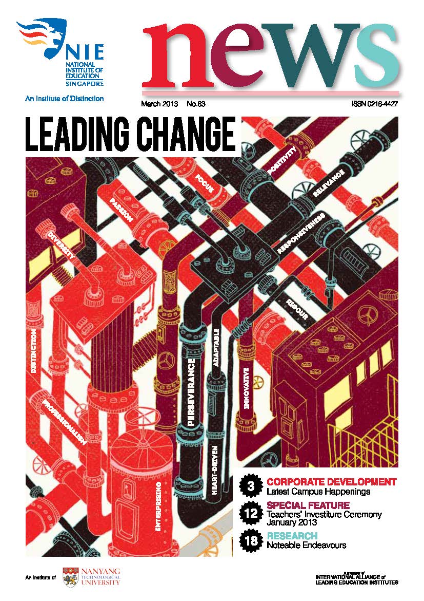 NIEWS 2020s #131 Unlocking Potential With Strategic SynergyMarch 2025 #132 Innovation through Inclusive EducationJune 2025 #133 Supercharging Teacher DevelopmentSeptember 2025 #134 Reflecting On Our Collective AchievementsDecember 2025 #130 Strengthening NetworksDecember 2024 #129 Instilling a Caring CultureSeptember 2024 #128 Championing Knowledge CreationJune 2024 #127 Unlocking the power for EdTechMarch 2024 #126 Ready for the FutureDecember 2023 #125Wired for KnowledgeSeptember 2023 #124Diversity in LearningJune 2023 #123Inspired to ServeMarch 2023 #122Reinforcing ValuesDecember 2022 #121Reimagining EducationSeptember 2022 #120Rethinking PossibilitiesJune 2022 #119Reconnecting LearningMarch 2022 #118Play to LearnDecember 2021 #117Building ResilienceSeptember 2021 #116Reimagining PedagogiesJune 2021 #115Rekindling InnovationMarch 2021 #114From Z to ADecember 2020 #113Learning UnlimitedSeptember 2020 #112The Teacher's Digital ToolboxJune 2020 #111Growing Into TeacherhoodMarch 2020 2010s #110Forward & UpwardDecember 2019 #109Celebrating Educators of TodaySeptember 2019 #108Architects of Learning EnvironmentJune 2019 #107Steering Learners in a Borderless WorldMarch 2019 #106A Future-Ready NIEDecember 2018 #105Prism of PossibilitiesSeptember 2018 #104Through A Different LensJune 2018 #103Nurture & NatureApril 2018 #102Transformation & ContinuityJanuary 2018 #101Advancing in Leadership and Educational ChangeOctober 2017 #100100th Issue: The Joy of LearningJuly 2017 #99Leading LearnerMarch 2017 #98Growing GlobalDecember 2016 #97Harnessing TalentSeptember 2016 #96Powering PassionJune 2016 #95Challenging CreativityMarch 2016 #94Impacting InsightDecember 2015 #93Driving DiscoverySeptember 2015 #92Scripting IntelligenceJune 2015 #91Seeding TalentMarch 2015 #90Reinventing the Future of LearningDecember 2014 #89Mapping Out Good LearningSeptember 2014 #88Opening Doors for Higher EducationJune 2014 #87Breaking Ground for EducationMarch 2014 #86Classroom InnovatorsDecember 2013 #85Growing ExcellenceSeptember 2013 #84Learning InspirationJune 2013 #83Leading ChangeMarch 2013 #82Designing the FutureDecember 2012 #81Teaching InspirationSeptember 2012 #80Growing ExcellenceJune 2012 #79Passion for TeachingMarch 2012 #78Passion for ServingDecember 2011 #77Passion for CollaboratingSeptember 2011 #76Passion for LearningJune 2011 #7521st Century Educators Lead with PassionMarch 2011 2000s #7460 Years of EducationDecember 2010 #73Touching Hearts and Transforming MindsSeptember 2010 #72Singapore Youth Olympic Games 2010 Special IssueJune 2010 #716 Decades of Transforming TeachingMarch 2010 #70Teacher Education in the 21st CenturyDecember 2009 #69Convocation 2009September 2009 #68Research. Art Gallery. Creativity. Innovative Teaching Technology.May 2009 #67Search Wikipedia: NIE AchievementsFebruary 2009 #66NIE Director's Race 2008October 2008 #65Leaders in the Service of LearnersJuly 2008 #64Learning to Serve, Serving to LearnApril 2008 #63January 2008 #62October 2007 #61July 2007 #60April 2007 #59January 2007 #58October 2006 #57July 2006 #56April 2006 #55January 2006 #54NIE's Conservation Efforts Lead to Release of Hawksbill Turtle HatchlingsOctober 2005 #53NIE is Energy EfficientJuly 2005 #52Teach Less, Learn MoreApril 2005 #51Caring & GivingJanuary 2005 #50Caring & GivingOctober 2004 #49Celebrate Learning!July 2004 #48April 2004 #47Signing CeremonyJanuary 2004 #46October 2003 #45Appointment Changes in ConversationJuly 2003 #44April 2003 #43Professor Leo Tan Awarded Ordre National du MeriteJanuary 2003 #42The Caring Teacher Awards 2002October 2002 #41July 2002 #40NIE Official OpeningApril 2002 #39NIE of NantahJanuary 2002 #38NIE: An Institute of Distinction?October 2001 #37An Invitation to the NIE Open HouseJuly 2001 #36Thoughts on the NIE Corporate Seminar 2001April 2001 #35Yunnan Garden Here We ComeFebruary 2001 1990s #34The Reflective SpinOctober 1999 #33Teacher's Investiture CeremonyJuly 1999 #32April 1999 #31Continuity and ChangeJanuary 1999 #30NIE Convocation 1998October 1998 #29The Singapore Centre for Teaching ThinkingJuly 1998 #28Educating the FutureApril 1998 #27AIESEP Singapore 1997 World ConferenceJanuary 1998 #26It's Never Too LateOctober 1997 #25The Thinking ConferenceJuly 1997 #24Minister's VisitApril 1997 #23The Tan Kah Kee ProfessorshipJanuary 1997 #22Scholars in the Teaching ProfessionOctober 1996 #21A Sign of Things to ComeJuly 1996 #20Professor Sir Michael Howard Lee Kuan Yew Distinguished VisitorApril 1996 #19Principal's Executive Centre (PEC)January 1996 #18Convocation 1995October 1995 #17The Eighth Asian Workshop on Child and Adolescent DevelopmentJuly 1995 #16NIE Celebrates World ChampionApril 1995 #15Designing Drugs Through Computer SimulationJanuary 1995 #14Convocation 1994October 1994 #13Relocation of NIE to Jurong CampusJuly 1994 #12Programme for National AwarenessApril 1994 #11A Glorious First... Commonwealth Writer's Prize 1993January 1994 #10Mentoring in Management Education: The NIE ModelOctober 1993 #9NIE Signed Memorandum of Understanding with the National Parks BoardJuly 1993 #8Elaine Feinstein: NTU's First Writer In-Residence - A Brief and Personal ResponseApril 1993 #7NIE Convocation 1992January 1993 #6NTU Open DayOctober 1992 #5Visit to UK UniversitiesJuly 1992 #4The Tree of Education - A Sculpture by Chern Lian ShanApril 1992 #3NIE (NTU) - SISIR Joint Project Agreement on the Lettuce Research ProjectJanuary 1992 #2Ministers Visit NIEOctober 1991 #1NTU Inauguration - A Major Step ForwardJuly 1991