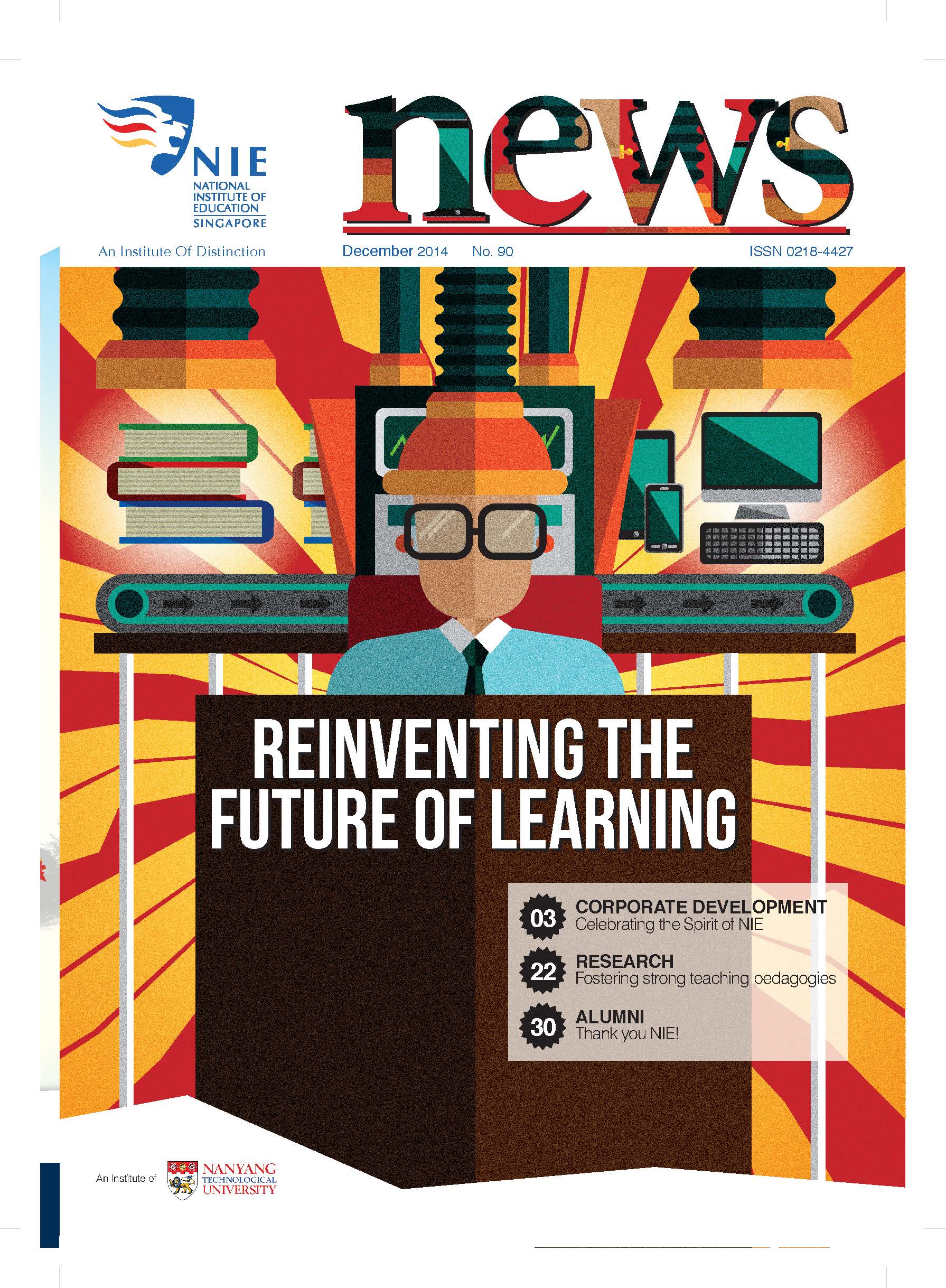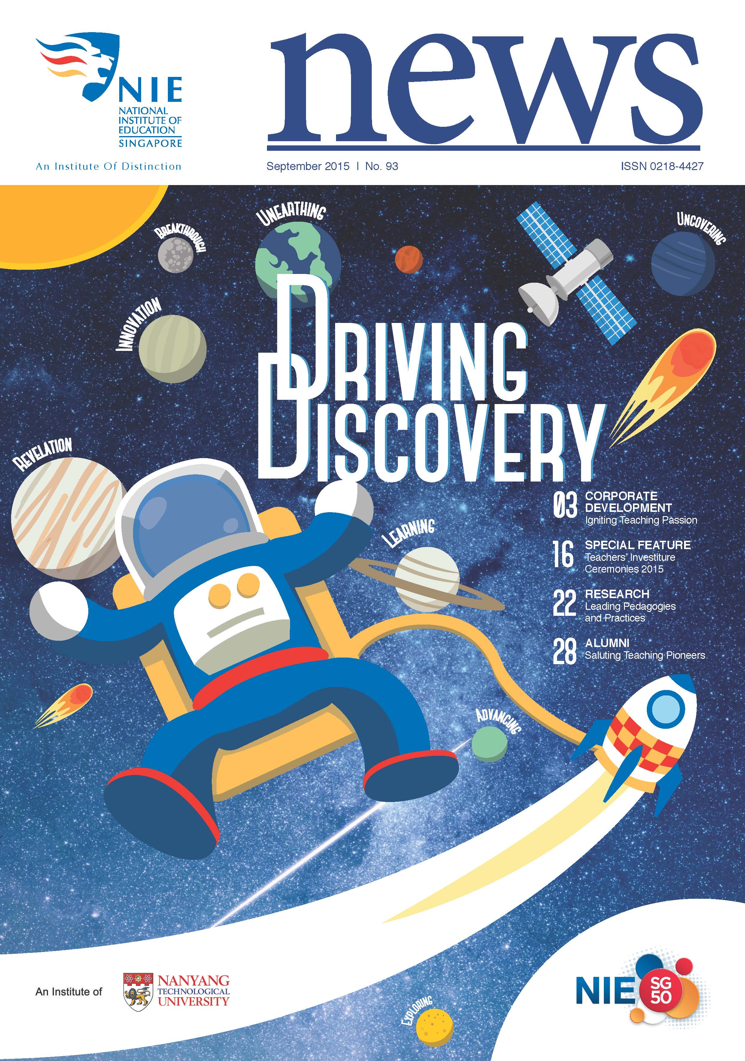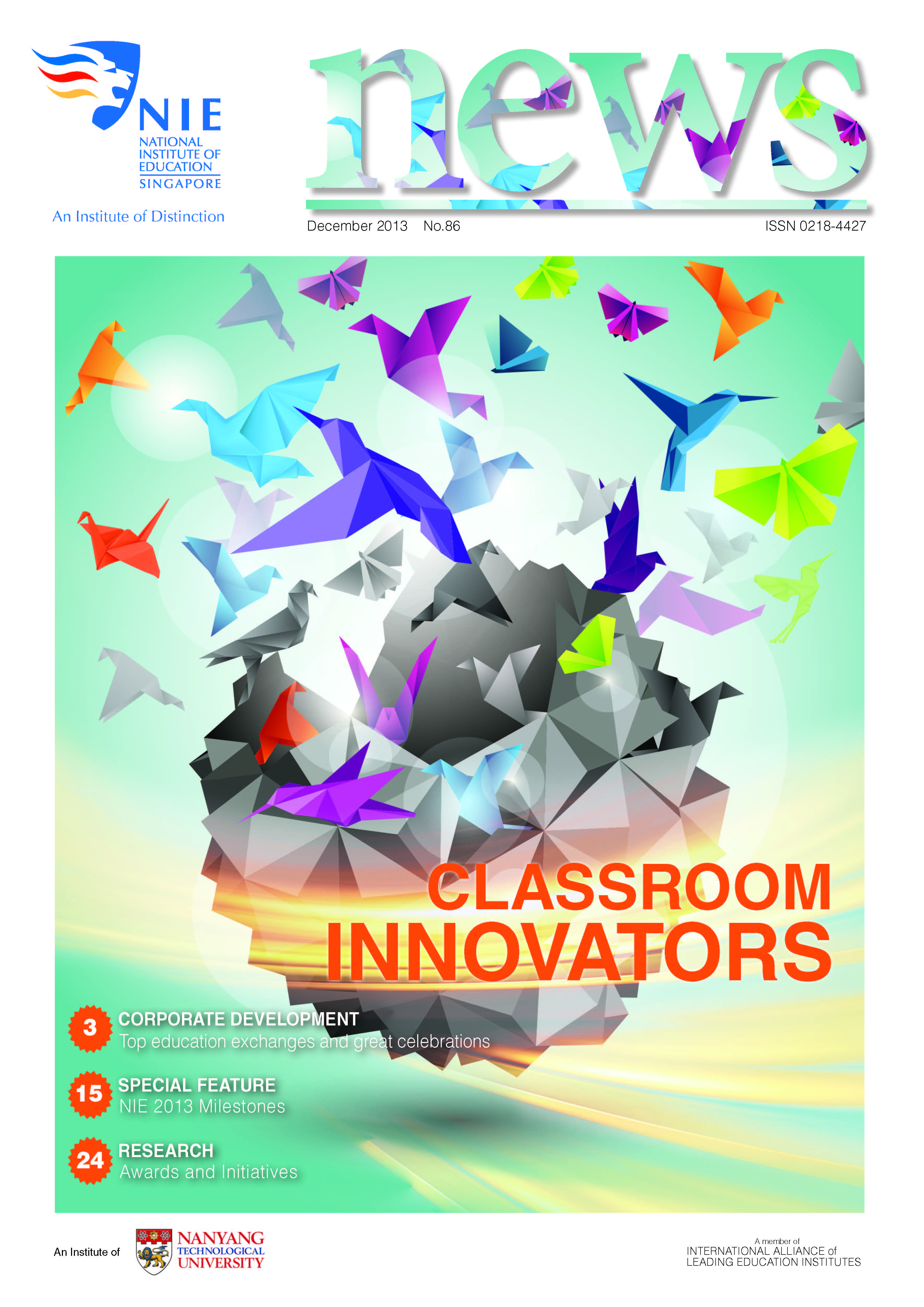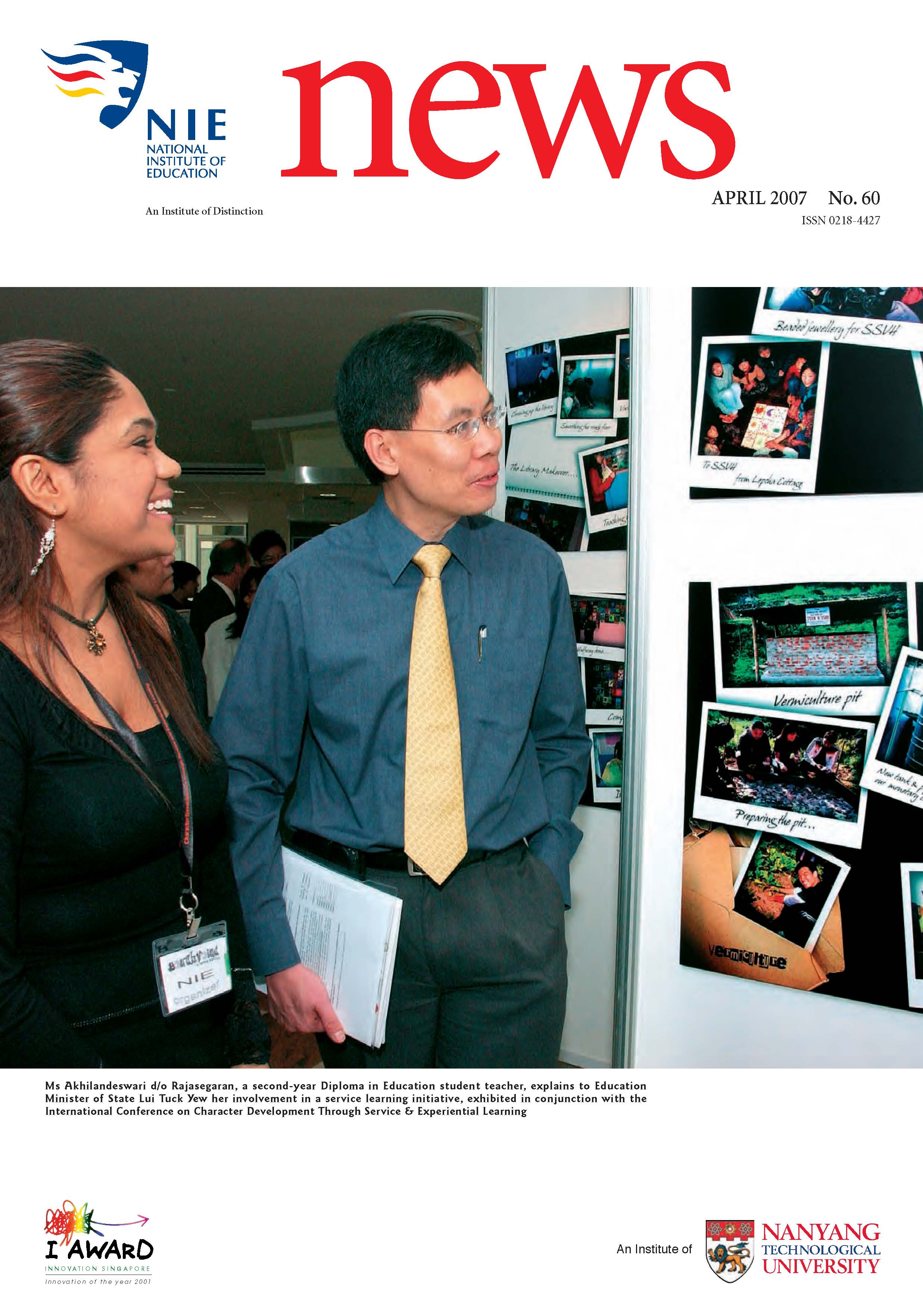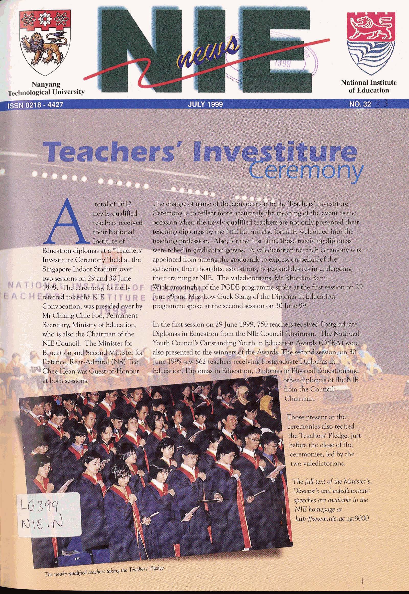 NIEWS 2020s #131 Unlocking Potential With Strategic SynergyMarch 2025 #132 Innovation through Inclusive EducationJune 2025 #133 Supercharging Teacher DevelopmentSeptember 2025 #134 Reflecting On Our Collective AchievementsDecember 2025 #130 Strengthening NetworksDecember 2024 #129 Instilling a Caring CultureSeptember 2024 #128 Championing Knowledge CreationJune 2024 #127 Unlocking the power for EdTechMarch 2024 #126 Ready for the FutureDecember 2023 #125Wired for KnowledgeSeptember 2023 #124Diversity in LearningJune 2023 #123Inspired to ServeMarch 2023 #122Reinforcing ValuesDecember 2022 #121Reimagining EducationSeptember 2022 #120Rethinking PossibilitiesJune 2022 #119Reconnecting LearningMarch 2022 #118Play to LearnDecember 2021 #117Building ResilienceSeptember 2021 #116Reimagining PedagogiesJune 2021 #115Rekindling InnovationMarch 2021 #114From Z to ADecember 2020 #113Learning UnlimitedSeptember 2020 #112The Teacher's Digital ToolboxJune 2020 #111Growing Into TeacherhoodMarch 2020 2010s #110Forward & UpwardDecember 2019 #109Celebrating Educators of TodaySeptember 2019 #108Architects of Learning EnvironmentJune 2019 #107Steering Learners in a Borderless WorldMarch 2019 #106A Future-Ready NIEDecember 2018 #105Prism of PossibilitiesSeptember 2018 #104Through A Different LensJune 2018 #103Nurture & NatureApril 2018 #102Transformation & ContinuityJanuary 2018 #101Advancing in Leadership and Educational ChangeOctober 2017 #100100th Issue: The Joy of LearningJuly 2017 #99Leading LearnerMarch 2017 #98Growing GlobalDecember 2016 #97Harnessing TalentSeptember 2016 #96Powering PassionJune 2016 #95Challenging CreativityMarch 2016 #94Impacting InsightDecember 2015 #93Driving DiscoverySeptember 2015 #92Scripting IntelligenceJune 2015 #91Seeding TalentMarch 2015 #90Reinventing the Future of LearningDecember 2014 #89Mapping Out Good LearningSeptember 2014 #88Opening Doors for Higher EducationJune 2014 #87Breaking Ground for EducationMarch 2014 #86Classroom InnovatorsDecember 2013 #85Growing ExcellenceSeptember 2013 #84Learning InspirationJune 2013 #83Leading ChangeMarch 2013 #82Designing the FutureDecember 2012 #81Teaching InspirationSeptember 2012 #80Growing ExcellenceJune 2012 #79Passion for TeachingMarch 2012 #78Passion for ServingDecember 2011 #77Passion for CollaboratingSeptember 2011 #76Passion for LearningJune 2011 #7521st Century Educators Lead with PassionMarch 2011 2000s #7460 Years of EducationDecember 2010 #73Touching Hearts and Transforming MindsSeptember 2010 #72Singapore Youth Olympic Games 2010 Special IssueJune 2010 #716 Decades of Transforming TeachingMarch 2010 #70Teacher Education in the 21st CenturyDecember 2009 #69Convocation 2009September 2009 #68Research. Art Gallery. Creativity. Innovative Teaching Technology.May 2009 #67Search Wikipedia: NIE AchievementsFebruary 2009 #66NIE Director's Race 2008October 2008 #65Leaders in the Service of LearnersJuly 2008 #64Learning to Serve, Serving to LearnApril 2008 #63January 2008 #62October 2007 #61July 2007 #60April 2007 #59January 2007 #58October 2006 #57July 2006 #56April 2006 #55January 2006 #54NIE's Conservation Efforts Lead to Release of Hawksbill Turtle HatchlingsOctober 2005 #53NIE is Energy EfficientJuly 2005 #52Teach Less, Learn MoreApril 2005 #51Caring & GivingJanuary 2005 #50Caring & GivingOctober 2004 #49Celebrate Learning!July 2004 #48April 2004 #47Signing CeremonyJanuary 2004 #46October 2003 #45Appointment Changes in ConversationJuly 2003 #44April 2003 #43Professor Leo Tan Awarded Ordre National du MeriteJanuary 2003 #42The Caring Teacher Awards 2002October 2002 #41July 2002 #40NIE Official OpeningApril 2002 #39NIE of NantahJanuary 2002 #38NIE: An Institute of Distinction?October 2001 #37An Invitation to the NIE Open HouseJuly 2001 #36Thoughts on the NIE Corporate Seminar 2001April 2001 #35Yunnan Garden Here We ComeFebruary 2001 1990s #34The Reflective SpinOctober 1999 #33Teacher's Investiture CeremonyJuly 1999 #32April 1999 #31Continuity and ChangeJanuary 1999 #30NIE Convocation 1998October 1998 #29The Singapore Centre for Teaching ThinkingJuly 1998 #28Educating the FutureApril 1998 #27AIESEP Singapore 1997 World ConferenceJanuary 1998 #26It's Never Too LateOctober 1997 #25The Thinking ConferenceJuly 1997 #24Minister's VisitApril 1997 #23The Tan Kah Kee ProfessorshipJanuary 1997 #22Scholars in the Teaching ProfessionOctober 1996 #21A Sign of Things to ComeJuly 1996 #20Professor Sir Michael Howard Lee Kuan Yew Distinguished VisitorApril 1996 #19Principal's Executive Centre (PEC)January 1996 #18Convocation 1995October 1995 #17The Eighth Asian Workshop on Child and Adolescent DevelopmentJuly 1995 #16NIE Celebrates World ChampionApril 1995 #15Designing Drugs Through Computer SimulationJanuary 1995 #14Convocation 1994October 1994 #13Relocation of NIE to Jurong CampusJuly 1994 #12Programme for National AwarenessApril 1994 #11A Glorious First... Commonwealth Writer's Prize 1993January 1994 #10Mentoring in Management Education: The NIE ModelOctober 1993 #9NIE Signed Memorandum of Understanding with the National Parks BoardJuly 1993 #8Elaine Feinstein: NTU's First Writer In-Residence - A Brief and Personal ResponseApril 1993 #7NIE Convocation 1992January 1993 #6NTU Open DayOctober 1992 #5Visit to UK UniversitiesJuly 1992 #4The Tree of Education - A Sculpture by Chern Lian ShanApril 1992 #3NIE (NTU) - SISIR Joint Project Agreement on the Lettuce Research ProjectJanuary 1992 #2Ministers Visit NIEOctober 1991 #1NTU Inauguration - A Major Step ForwardJuly 1991