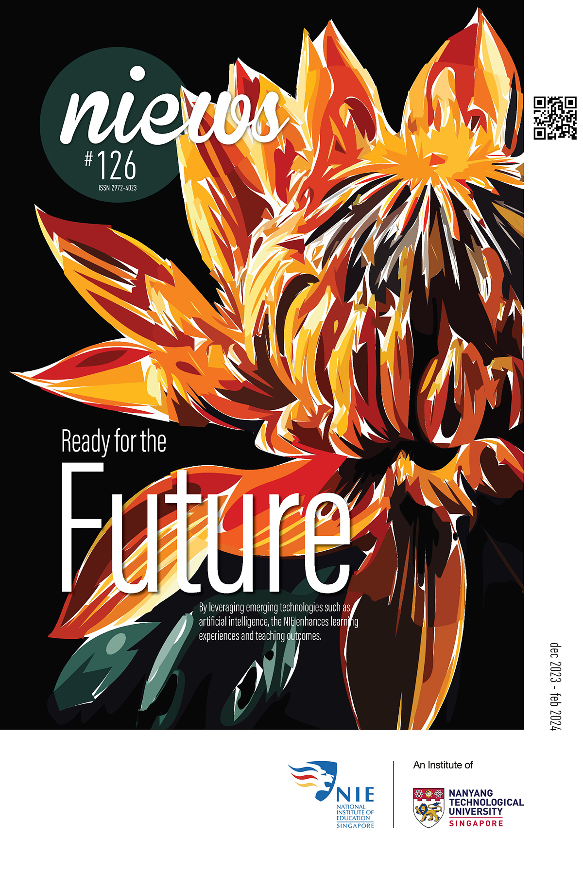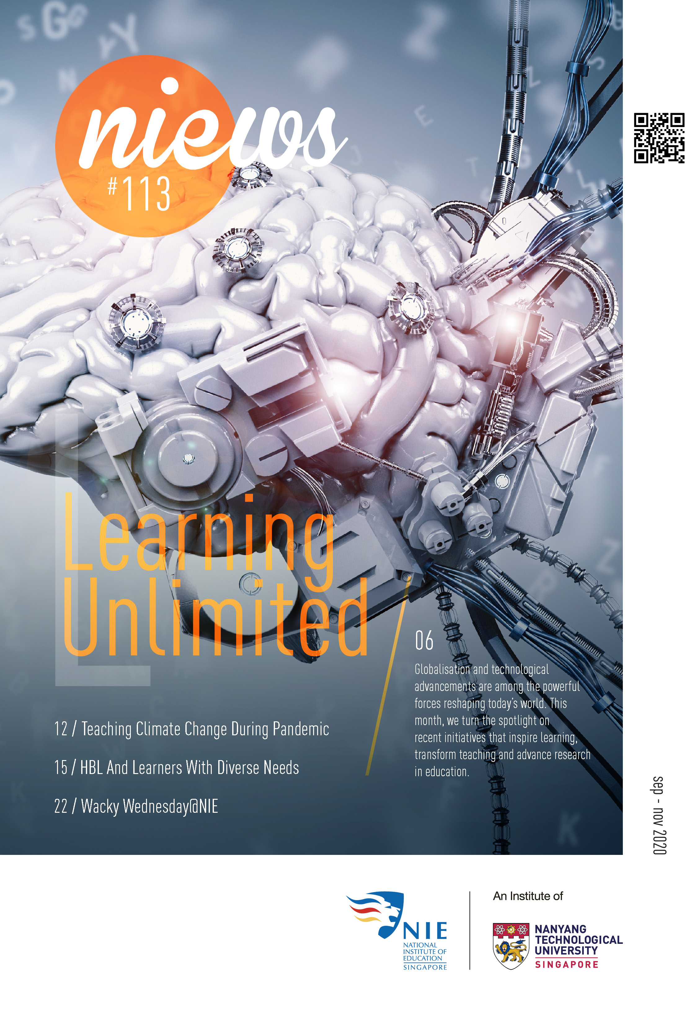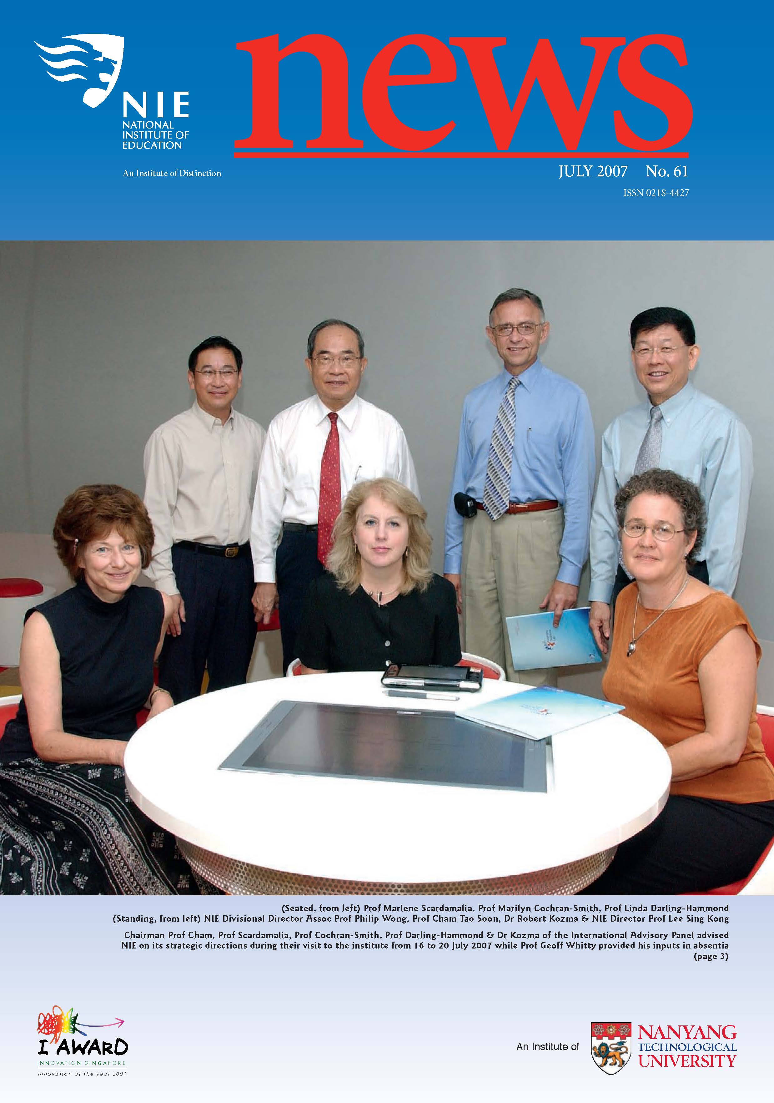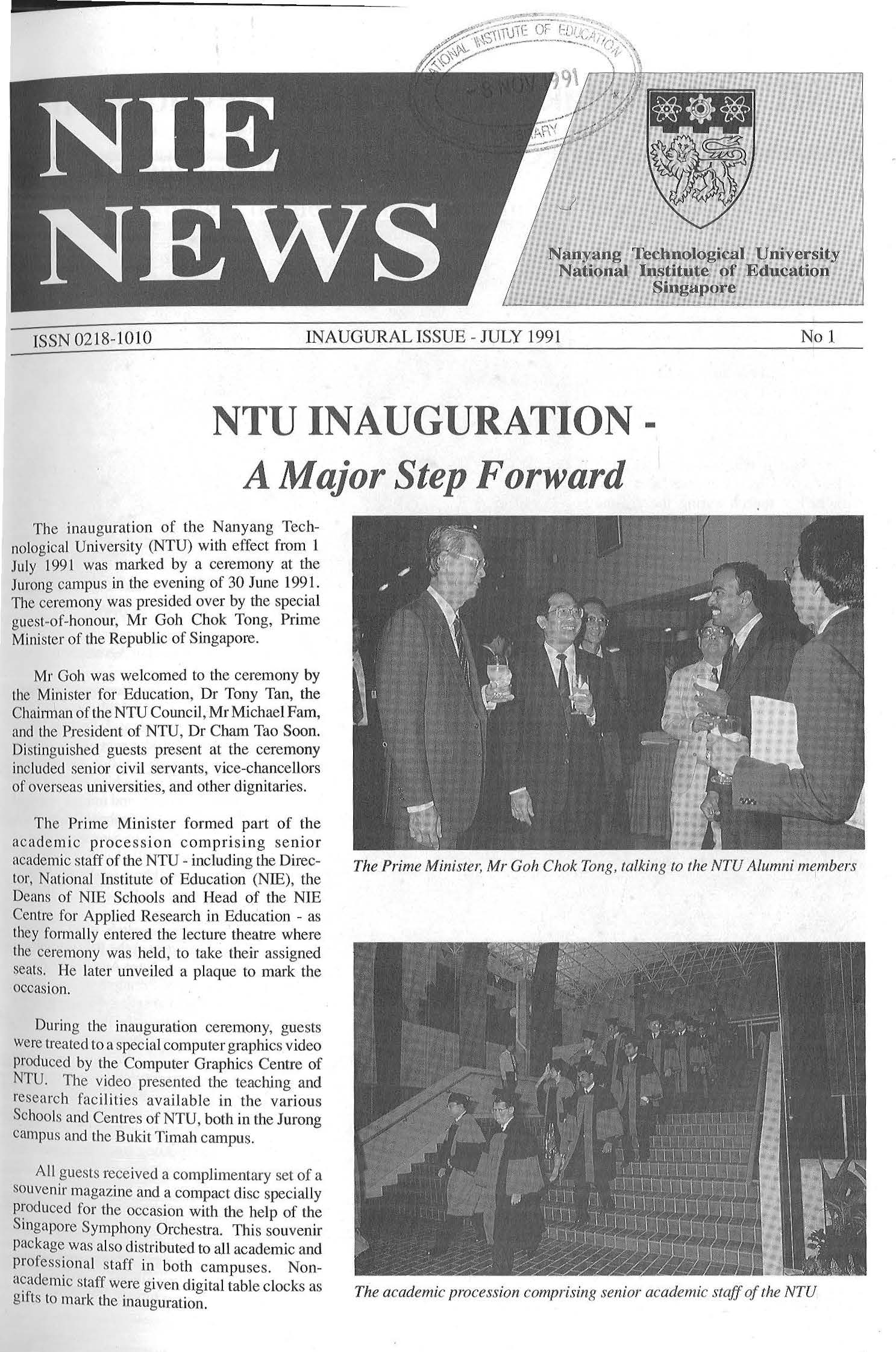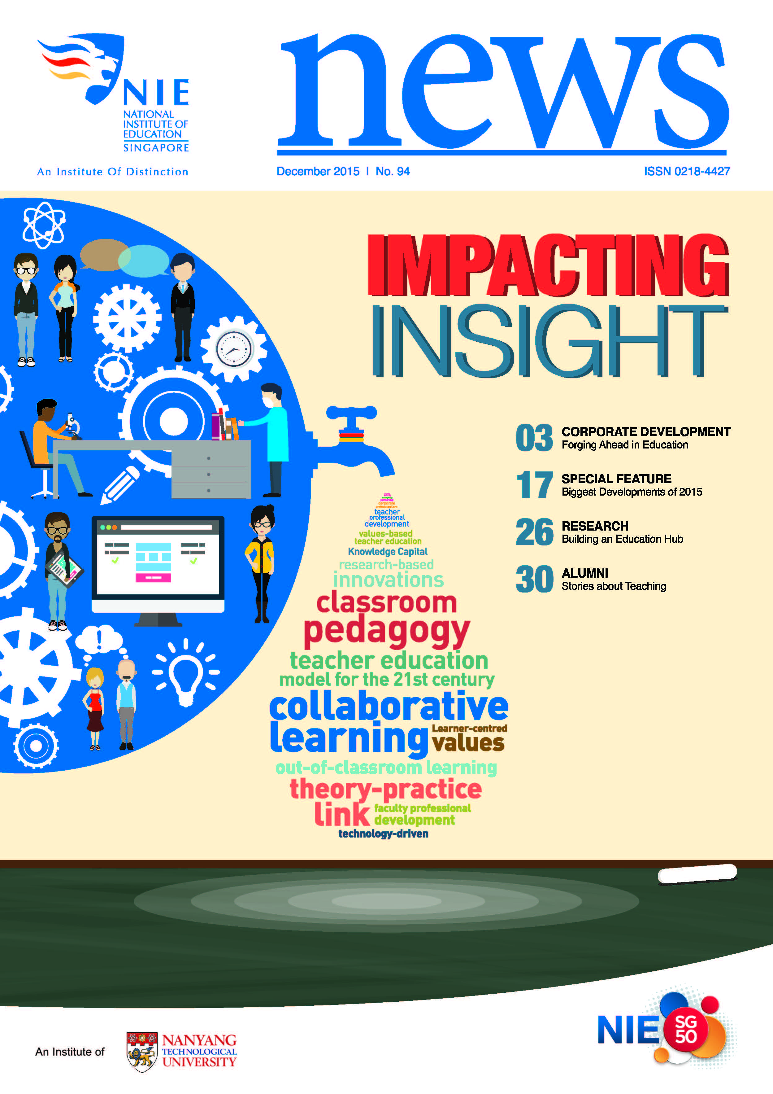 NIEWS 2020s #131 Unlocking Potential With Strategic SynergyMarch 2025 #132 Innovation through Inclusive EducationJune 2025 #133 Supercharging Teacher DevelopmentSeptember 2025 #134 Reflecting On Our Collective AchievementsDecember 2025 #130 Strengthening NetworksDecember 2024 #129 Instilling a Caring CultureSeptember 2024 #128 Championing Knowledge CreationJune 2024 #127 Unlocking the power for EdTechMarch 2024 #126 Ready for the FutureDecember 2023 #125Wired for KnowledgeSeptember 2023 #124Diversity in LearningJune 2023 #123Inspired to ServeMarch 2023 #122Reinforcing ValuesDecember 2022 #121Reimagining EducationSeptember 2022 #120Rethinking PossibilitiesJune 2022 #119Reconnecting LearningMarch 2022 #118Play to LearnDecember 2021 #117Building ResilienceSeptember 2021 #116Reimagining PedagogiesJune 2021 #115Rekindling InnovationMarch 2021 #114From Z to ADecember 2020 #113Learning UnlimitedSeptember 2020 #112The Teacher's Digital ToolboxJune 2020 #111Growing Into TeacherhoodMarch 2020 2010s #110Forward & UpwardDecember 2019 #109Celebrating Educators of TodaySeptember 2019 #108Architects of Learning EnvironmentJune 2019 #107Steering Learners in a Borderless WorldMarch 2019 #106A Future-Ready NIEDecember 2018 #105Prism of PossibilitiesSeptember 2018 #104Through A Different LensJune 2018 #103Nurture & NatureApril 2018 #102Transformation & ContinuityJanuary 2018 #101Advancing in Leadership and Educational ChangeOctober 2017 #100100th Issue: The Joy of LearningJuly 2017 #99Leading LearnerMarch 2017 #98Growing GlobalDecember 2016 #97Harnessing TalentSeptember 2016 #96Powering PassionJune 2016 #95Challenging CreativityMarch 2016 #94Impacting InsightDecember 2015 #93Driving DiscoverySeptember 2015 #92Scripting IntelligenceJune 2015 #91Seeding TalentMarch 2015 #90Reinventing the Future of LearningDecember 2014 #89Mapping Out Good LearningSeptember 2014 #88Opening Doors for Higher EducationJune 2014 #87Breaking Ground for EducationMarch 2014 #86Classroom InnovatorsDecember 2013 #85Growing ExcellenceSeptember 2013 #84Learning InspirationJune 2013 #83Leading ChangeMarch 2013 #82Designing the FutureDecember 2012 #81Teaching InspirationSeptember 2012 #80Growing ExcellenceJune 2012 #79Passion for TeachingMarch 2012 #78Passion for ServingDecember 2011 #77Passion for CollaboratingSeptember 2011 #76Passion for LearningJune 2011 #7521st Century Educators Lead with PassionMarch 2011 2000s #7460 Years of EducationDecember 2010 #73Touching Hearts and Transforming MindsSeptember 2010 #72Singapore Youth Olympic Games 2010 Special IssueJune 2010 #716 Decades of Transforming TeachingMarch 2010 #70Teacher Education in the 21st CenturyDecember 2009 #69Convocation 2009September 2009 #68Research. Art Gallery. Creativity. Innovative Teaching Technology.May 2009 #67Search Wikipedia: NIE AchievementsFebruary 2009 #66NIE Director's Race 2008October 2008 #65Leaders in the Service of LearnersJuly 2008 #64Learning to Serve, Serving to LearnApril 2008 #63January 2008 #62October 2007 #61July 2007 #60April 2007 #59January 2007 #58October 2006 #57July 2006 #56April 2006 #55January 2006 #54NIE's Conservation Efforts Lead to Release of Hawksbill Turtle HatchlingsOctober 2005 #53NIE is Energy EfficientJuly 2005 #52Teach Less, Learn MoreApril 2005 #51Caring & GivingJanuary 2005 #50Caring & GivingOctober 2004 #49Celebrate Learning!July 2004 #48April 2004 #47Signing CeremonyJanuary 2004 #46October 2003 #45Appointment Changes in ConversationJuly 2003 #44April 2003 #43Professor Leo Tan Awarded Ordre National du MeriteJanuary 2003 #42The Caring Teacher Awards 2002October 2002 #41July 2002 #40NIE Official OpeningApril 2002 #39NIE of NantahJanuary 2002 #38NIE: An Institute of Distinction?October 2001 #37An Invitation to the NIE Open HouseJuly 2001 #36Thoughts on the NIE Corporate Seminar 2001April 2001 #35Yunnan Garden Here We ComeFebruary 2001 1990s #34The Reflective SpinOctober 1999 #33Teacher's Investiture CeremonyJuly 1999 #32April 1999 #31Continuity and ChangeJanuary 1999 #30NIE Convocation 1998October 1998 #29The Singapore Centre for Teaching ThinkingJuly 1998 #28Educating the FutureApril 1998 #27AIESEP Singapore 1997 World ConferenceJanuary 1998 #26It's Never Too LateOctober 1997 #25The Thinking ConferenceJuly 1997 #24Minister's VisitApril 1997 #23The Tan Kah Kee ProfessorshipJanuary 1997 #22Scholars in the Teaching ProfessionOctober 1996 #21A Sign of Things to ComeJuly 1996 #20Professor Sir Michael Howard Lee Kuan Yew Distinguished VisitorApril 1996 #19Principal's Executive Centre (PEC)January 1996 #18Convocation 1995October 1995 #17The Eighth Asian Workshop on Child and Adolescent DevelopmentJuly 1995 #16NIE Celebrates World ChampionApril 1995 #15Designing Drugs Through Computer SimulationJanuary 1995 #14Convocation 1994October 1994 #13Relocation of NIE to Jurong CampusJuly 1994 #12Programme for National AwarenessApril 1994 #11A Glorious First... Commonwealth Writer's Prize 1993January 1994 #10Mentoring in Management Education: The NIE ModelOctober 1993 #9NIE Signed Memorandum of Understanding with the National Parks BoardJuly 1993 #8Elaine Feinstein: NTU's First Writer In-Residence - A Brief and Personal ResponseApril 1993 #7NIE Convocation 1992January 1993 #6NTU Open DayOctober 1992 #5Visit to UK UniversitiesJuly 1992 #4The Tree of Education - A Sculpture by Chern Lian ShanApril 1992 #3NIE (NTU) - SISIR Joint Project Agreement on the Lettuce Research ProjectJanuary 1992 #2Ministers Visit NIEOctober 1991 #1NTU Inauguration - A Major Step ForwardJuly 1991