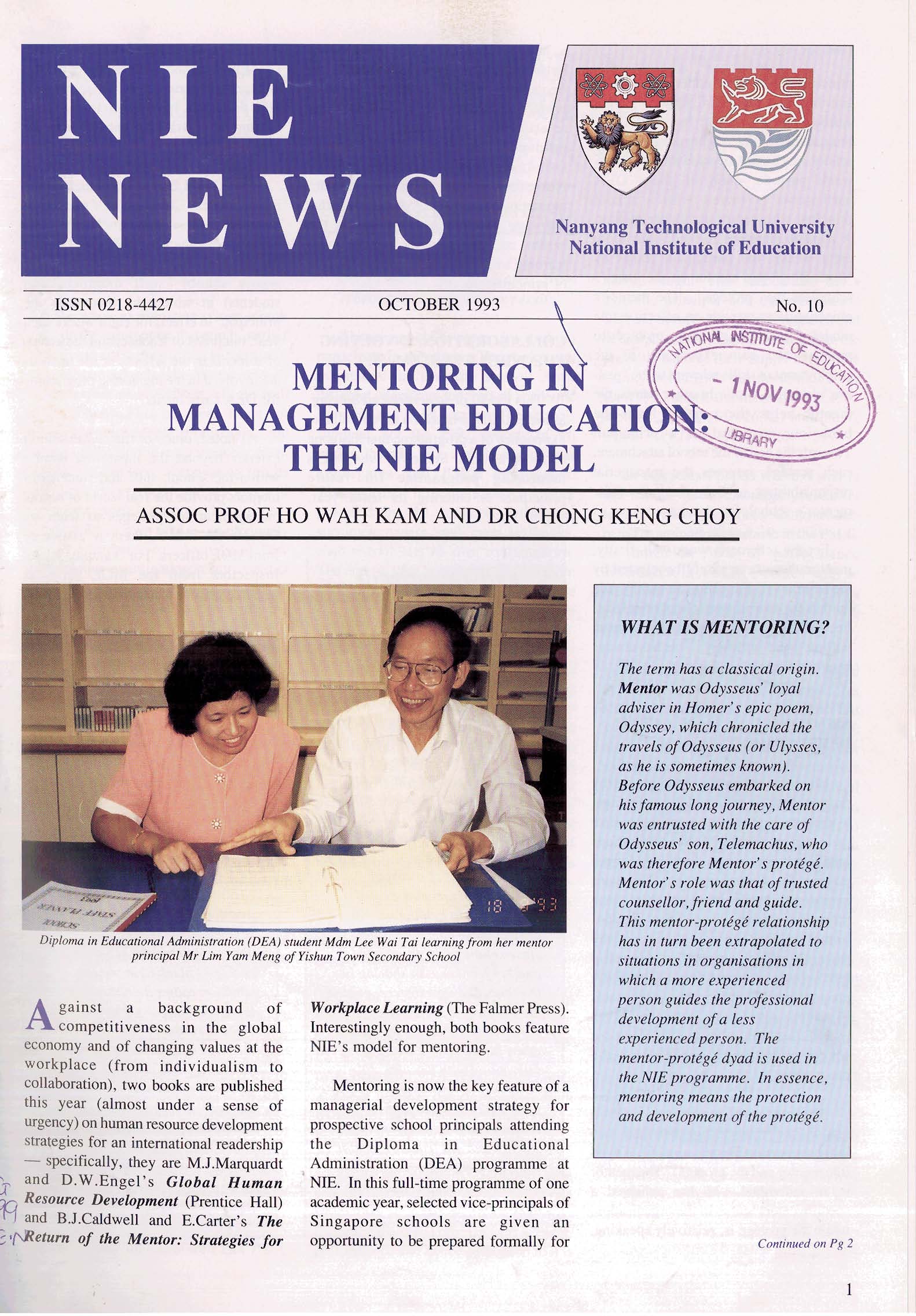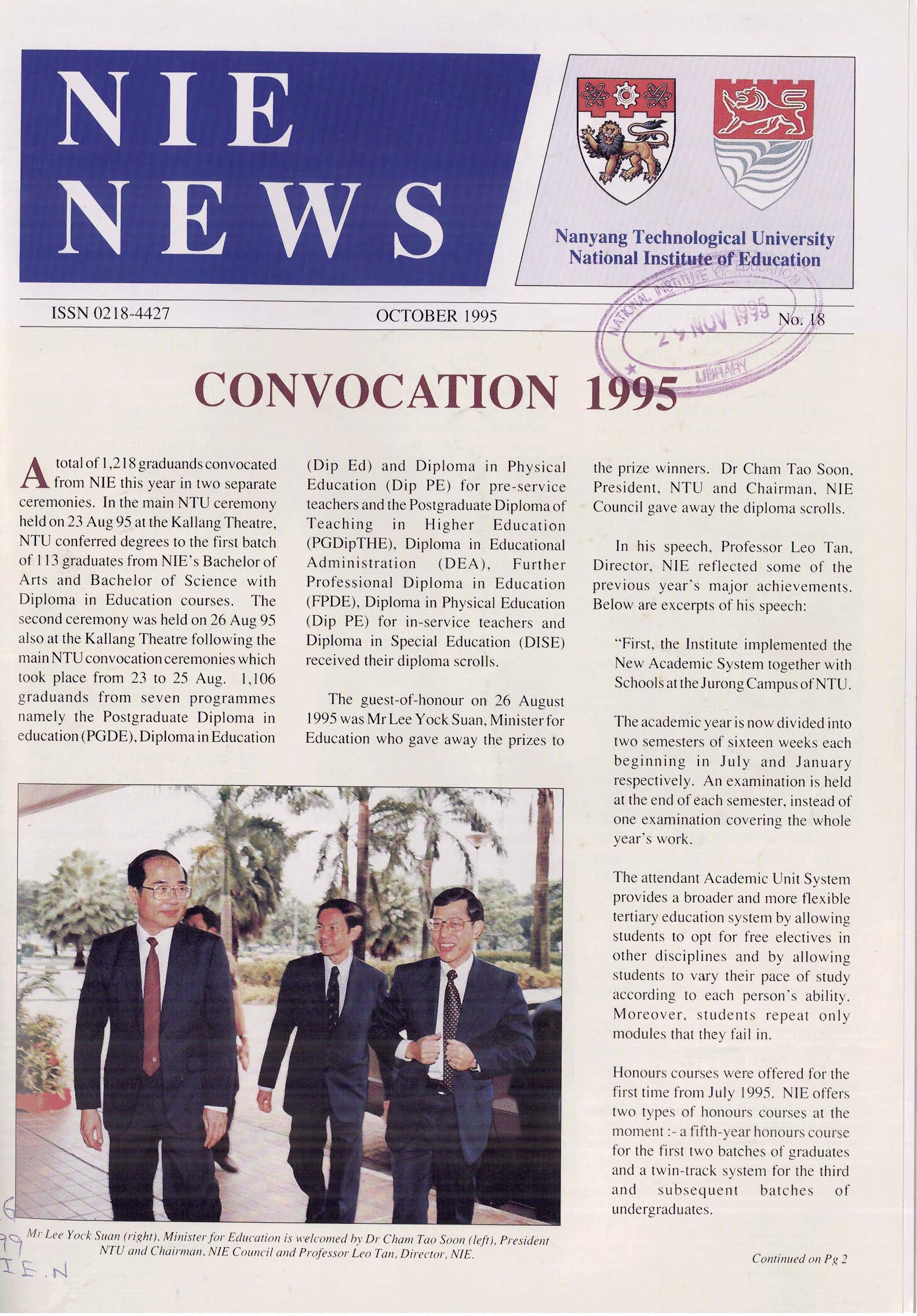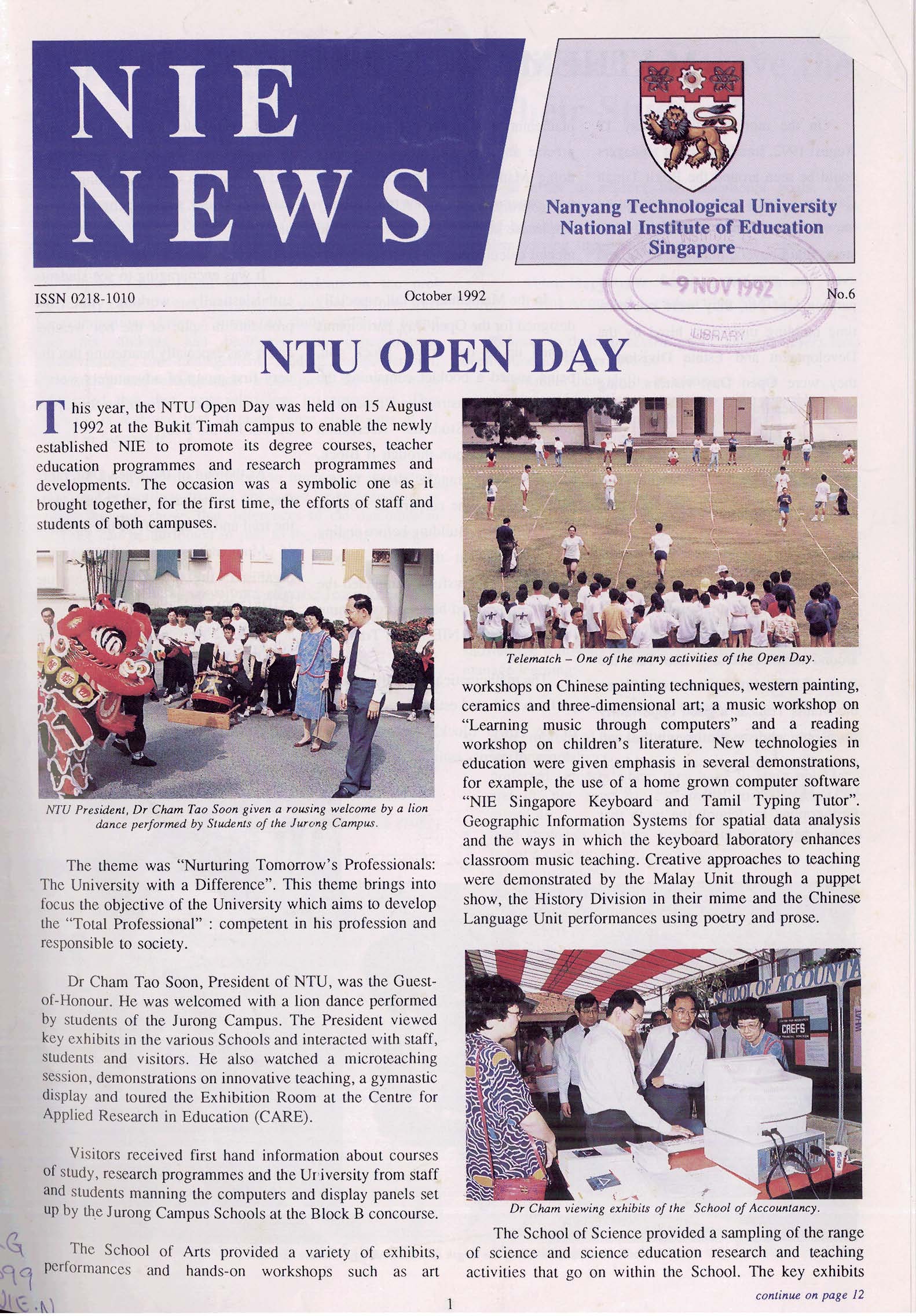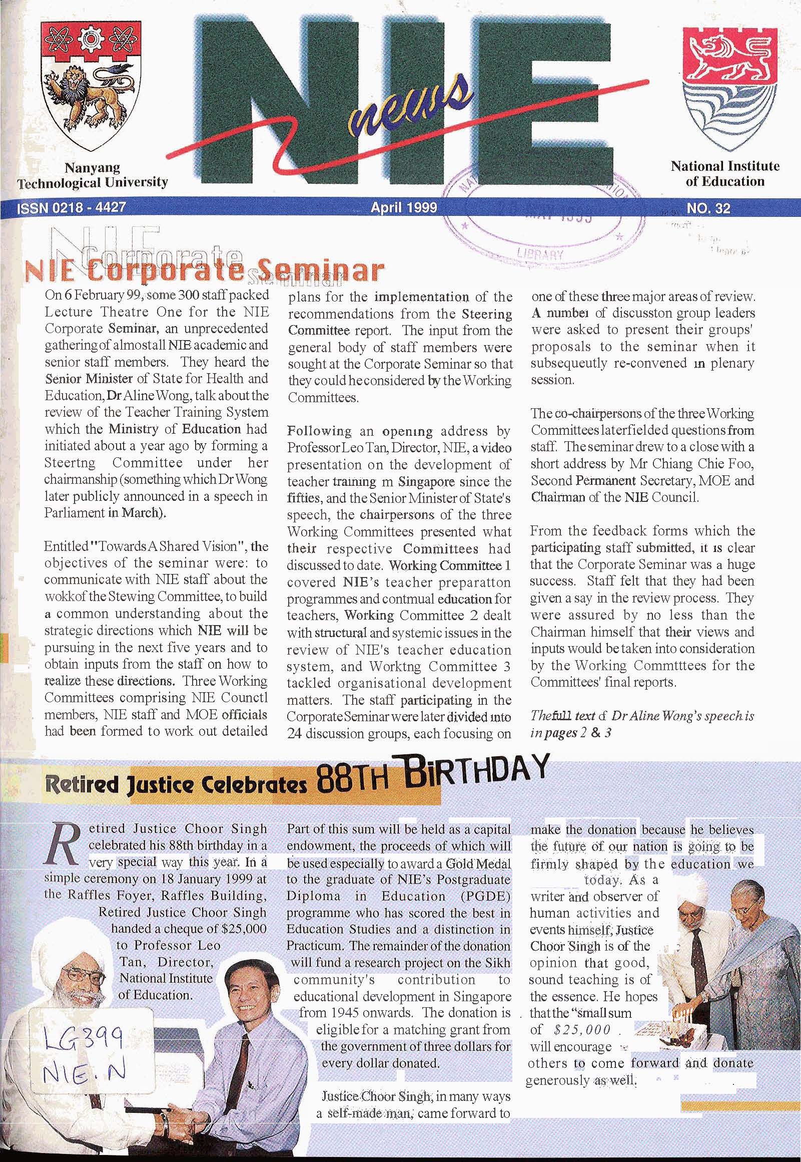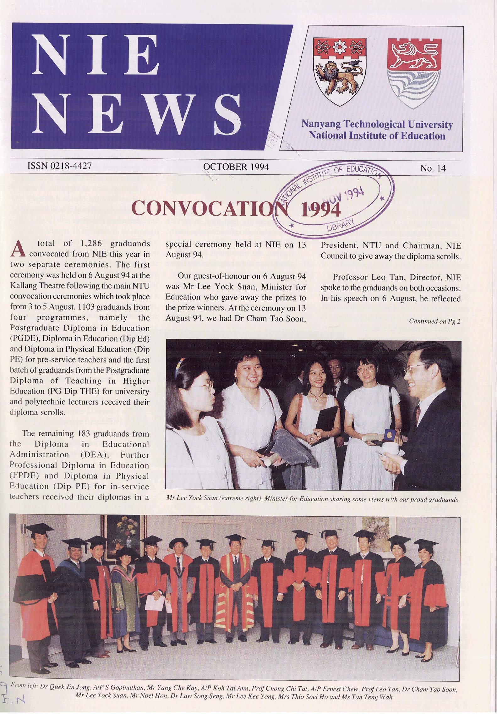 NIEWS 2020s #131 Unlocking Potential With Strategic SynergyMarch 2025 #132 Innovation through Inclusive EducationJune 2025 #133 Supercharging Teacher DevelopmentSeptember 2025 #134 Reflecting On Our Collective AchievementsDecember 2025 #130 Strengthening NetworksDecember 2024 #129 Instilling a Caring CultureSeptember 2024 #128 Championing Knowledge CreationJune 2024 #127 Unlocking the power for EdTechMarch 2024 #126 Ready for the FutureDecember 2023 #125Wired for KnowledgeSeptember 2023 #124Diversity in LearningJune 2023 #123Inspired to ServeMarch 2023 #122Reinforcing ValuesDecember 2022 #121Reimagining EducationSeptember 2022 #120Rethinking PossibilitiesJune 2022 #119Reconnecting LearningMarch 2022 #118Play to LearnDecember 2021 #117Building ResilienceSeptember 2021 #116Reimagining PedagogiesJune 2021 #115Rekindling InnovationMarch 2021 #114From Z to ADecember 2020 #113Learning UnlimitedSeptember 2020 #112The Teacher's Digital ToolboxJune 2020 #111Growing Into TeacherhoodMarch 2020 2010s #110Forward & UpwardDecember 2019 #109Celebrating Educators of TodaySeptember 2019 #108Architects of Learning EnvironmentJune 2019 #107Steering Learners in a Borderless WorldMarch 2019 #106A Future-Ready NIEDecember 2018 #105Prism of PossibilitiesSeptember 2018 #104Through A Different LensJune 2018 #103Nurture & NatureApril 2018 #102Transformation & ContinuityJanuary 2018 #101Advancing in Leadership and Educational ChangeOctober 2017 #100100th Issue: The Joy of LearningJuly 2017 #99Leading LearnerMarch 2017 #98Growing GlobalDecember 2016 #97Harnessing TalentSeptember 2016 #96Powering PassionJune 2016 #95Challenging CreativityMarch 2016 #94Impacting InsightDecember 2015 #93Driving DiscoverySeptember 2015 #92Scripting IntelligenceJune 2015 #91Seeding TalentMarch 2015 #90Reinventing the Future of LearningDecember 2014 #89Mapping Out Good LearningSeptember 2014 #88Opening Doors for Higher EducationJune 2014 #87Breaking Ground for EducationMarch 2014 #86Classroom InnovatorsDecember 2013 #85Growing ExcellenceSeptember 2013 #84Learning InspirationJune 2013 #83Leading ChangeMarch 2013 #82Designing the FutureDecember 2012 #81Teaching InspirationSeptember 2012 #80Growing ExcellenceJune 2012 #79Passion for TeachingMarch 2012 #78Passion for ServingDecember 2011 #77Passion for CollaboratingSeptember 2011 #76Passion for LearningJune 2011 #7521st Century Educators Lead with PassionMarch 2011 2000s #7460 Years of EducationDecember 2010 #73Touching Hearts and Transforming MindsSeptember 2010 #72Singapore Youth Olympic Games 2010 Special IssueJune 2010 #716 Decades of Transforming TeachingMarch 2010 #70Teacher Education in the 21st CenturyDecember 2009 #69Convocation 2009September 2009 #68Research. Art Gallery. Creativity. Innovative Teaching Technology.May 2009 #67Search Wikipedia: NIE AchievementsFebruary 2009 #66NIE Director's Race 2008October 2008 #65Leaders in the Service of LearnersJuly 2008 #64Learning to Serve, Serving to LearnApril 2008 #63January 2008 #62October 2007 #61July 2007 #60April 2007 #59January 2007 #58October 2006 #57July 2006 #56April 2006 #55January 2006 #54NIE's Conservation Efforts Lead to Release of Hawksbill Turtle HatchlingsOctober 2005 #53NIE is Energy EfficientJuly 2005 #52Teach Less, Learn MoreApril 2005 #51Caring & GivingJanuary 2005 #50Caring & GivingOctober 2004 #49Celebrate Learning!July 2004 #48April 2004 #47Signing CeremonyJanuary 2004 #46October 2003 #45Appointment Changes in ConversationJuly 2003 #44April 2003 #43Professor Leo Tan Awarded Ordre National du MeriteJanuary 2003 #42The Caring Teacher Awards 2002October 2002 #41July 2002 #40NIE Official OpeningApril 2002 #39NIE of NantahJanuary 2002 #38NIE: An Institute of Distinction?October 2001 #37An Invitation to the NIE Open HouseJuly 2001 #36Thoughts on the NIE Corporate Seminar 2001April 2001 #35Yunnan Garden Here We ComeFebruary 2001 1990s #34The Reflective SpinOctober 1999 #33Teacher's Investiture CeremonyJuly 1999 #32April 1999 #31Continuity and ChangeJanuary 1999 #30NIE Convocation 1998October 1998 #29The Singapore Centre for Teaching ThinkingJuly 1998 #28Educating the FutureApril 1998 #27AIESEP Singapore 1997 World ConferenceJanuary 1998 #26It's Never Too LateOctober 1997 #25The Thinking ConferenceJuly 1997 #24Minister's VisitApril 1997 #23The Tan Kah Kee ProfessorshipJanuary 1997 #22Scholars in the Teaching ProfessionOctober 1996 #21A Sign of Things to ComeJuly 1996 #20Professor Sir Michael Howard Lee Kuan Yew Distinguished VisitorApril 1996 #19Principal's Executive Centre (PEC)January 1996 #18Convocation 1995October 1995 #17The Eighth Asian Workshop on Child and Adolescent DevelopmentJuly 1995 #16NIE Celebrates World ChampionApril 1995 #15Designing Drugs Through Computer SimulationJanuary 1995 #14Convocation 1994October 1994 #13Relocation of NIE to Jurong CampusJuly 1994 #12Programme for National AwarenessApril 1994 #11A Glorious First... Commonwealth Writer's Prize 1993January 1994 #10Mentoring in Management Education: The NIE ModelOctober 1993 #9NIE Signed Memorandum of Understanding with the National Parks BoardJuly 1993 #8Elaine Feinstein: NTU's First Writer In-Residence - A Brief and Personal ResponseApril 1993 #7NIE Convocation 1992January 1993 #6NTU Open DayOctober 1992 #5Visit to UK UniversitiesJuly 1992 #4The Tree of Education - A Sculpture by Chern Lian ShanApril 1992 #3NIE (NTU) - SISIR Joint Project Agreement on the Lettuce Research ProjectJanuary 1992 #2Ministers Visit NIEOctober 1991 #1NTU Inauguration - A Major Step ForwardJuly 1991