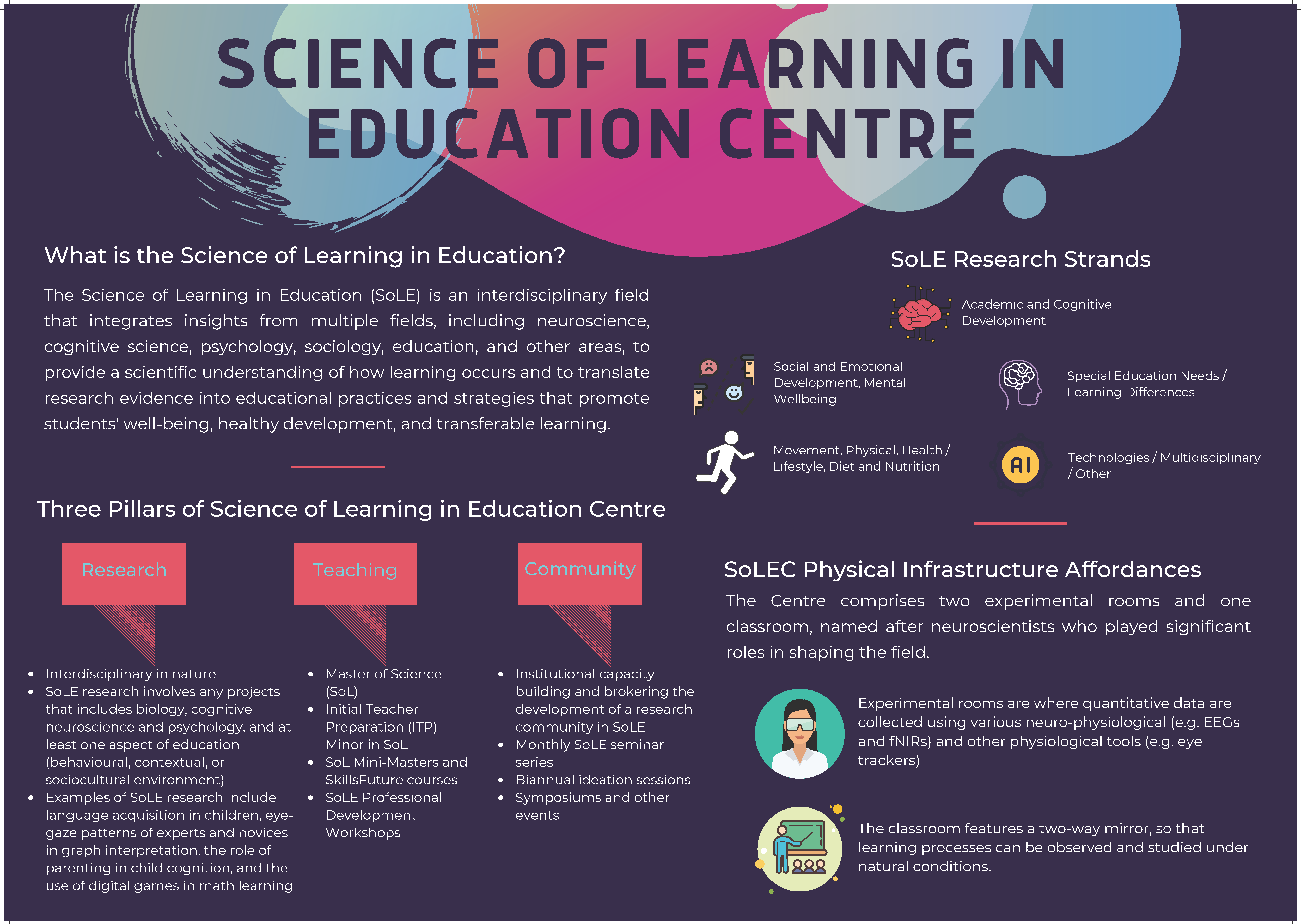 Welcome to the Science of Learning in Education Centre (SoLEC) at the NIE. Our centre is to be a key institutional mechanism for advancing NIE’s vision of leading the future of education. We complement NIE's existing Education Research with state-of-the-art Science of Learning (SoL) research and modelling techniques in order to advance knowledge on learning and its underlying mechanisms. To this end, we synthesize research investigations and findings across different disciplines, including neuroscience, cognitive science, psychology, technology, education, and possibly others. A key Science of Learning in Education agenda for us is to bridge the divides between SoL and Education. This includes bridging experimental research conducted in controlled settings with research that is “in the wild” such as in schools, classrooms, and beyond. Hence, we hope to bring translational gains to lab based research, and vice versa, where complex problems of practice can also be informed by experimental research evidences.