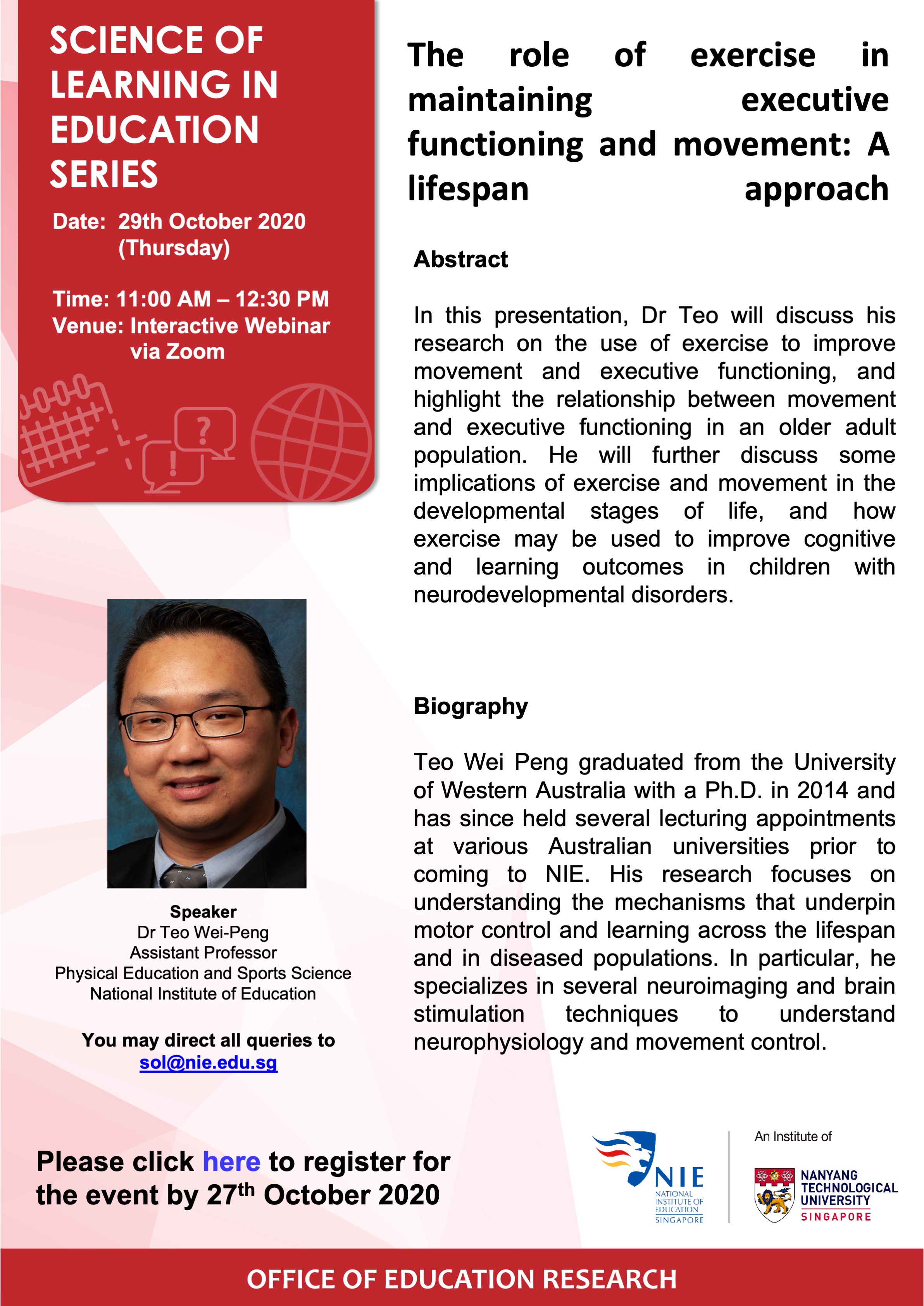 We have a vibrant SoL community at NIE, NTU that are working on various projects. The Strategic Growth Area - Science of Learning (SGA-SoL) seminar series provide a platform for colleagues to disseminate their research to the wider SoL community. Check out some of our past presenters and look out for more exciting talks to come.