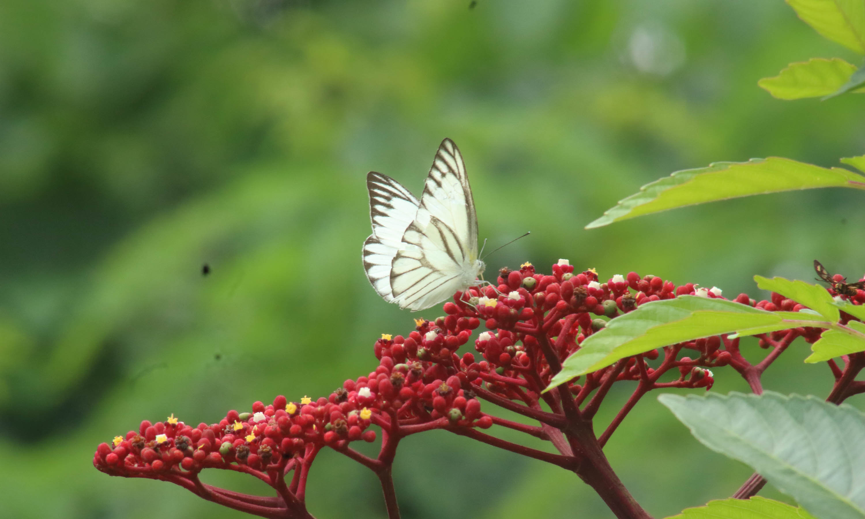 A Striped Albatross butterfly (Appias libythea) feeding on nectar from a Red Leea (Leea rubra) within a road verge in Singapore’s Jurong town. Red Leeas are commonly planted in verges and native to the country. (Credit: NTU Singapore)