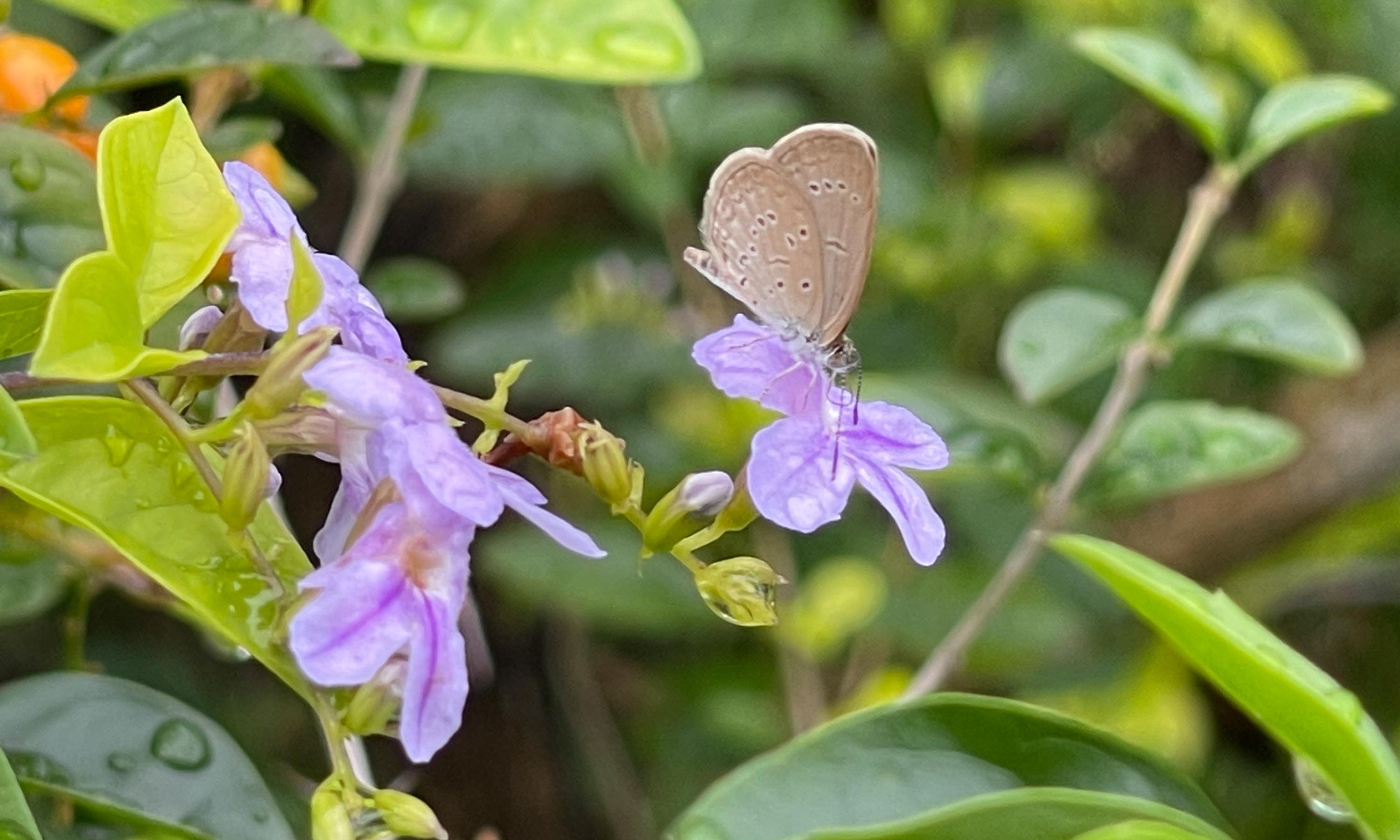 A Lesser Grass Blue butterfly (Zizina otis) feeding on nectar from a Golden Dewdrop (Duranta erecta) within a road verge in Singapore’s Bedok town. Golden Dewdrops are commonly planted in verges and not native to the country. (Credit: NTU Singapore)