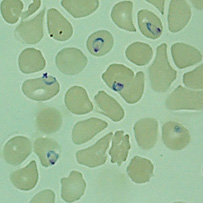 Red blood cells infected with malaria parasites (blue rings). Image credit: Prof Peter Preiser.