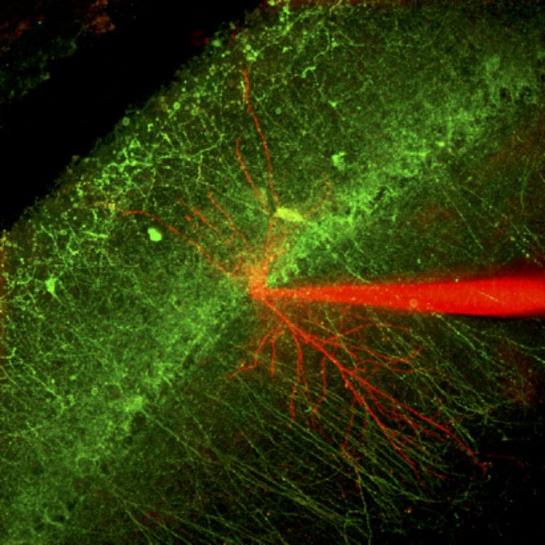 Optogenetics allows mapping of the circuit structure between inhibitory neurons (green) and an excitatory neuron in the hippocampus (red). Triangular structure on the right: glass pipette to fill the neuron with red fluorescent dye. Credit: Ryuichi Nakajima/George Augustine.