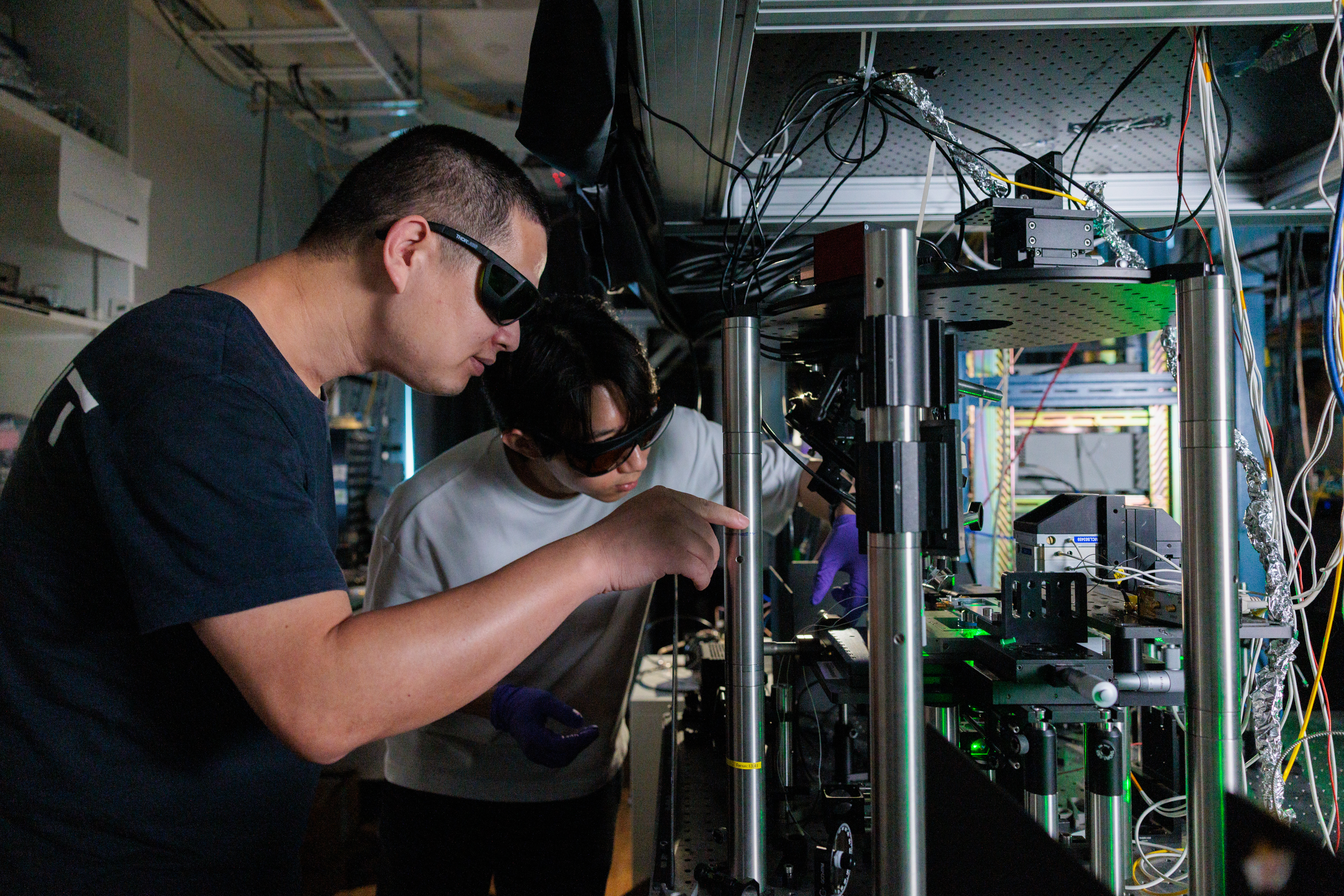 (Front) Co-first author of the research, Dr Cai Hongbing, with the team's experimental setup. Credit: Centre for Quantum Technologies, NTU.