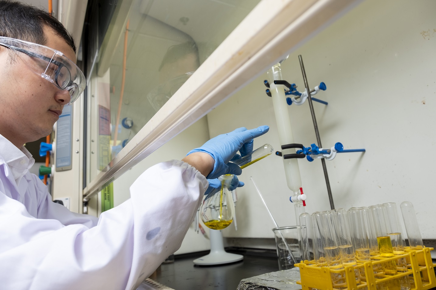 Research fellow Dr Huang Jingsheng from NTU Singapore’s School of Chemistry, Chemical Engineering and Biotechnology preparing new anti-brain cancer compounds in a fume hood. A silica column was used to get a purified form of the compounds (yellow liquid in flask). (Credit: NTU Singapore)