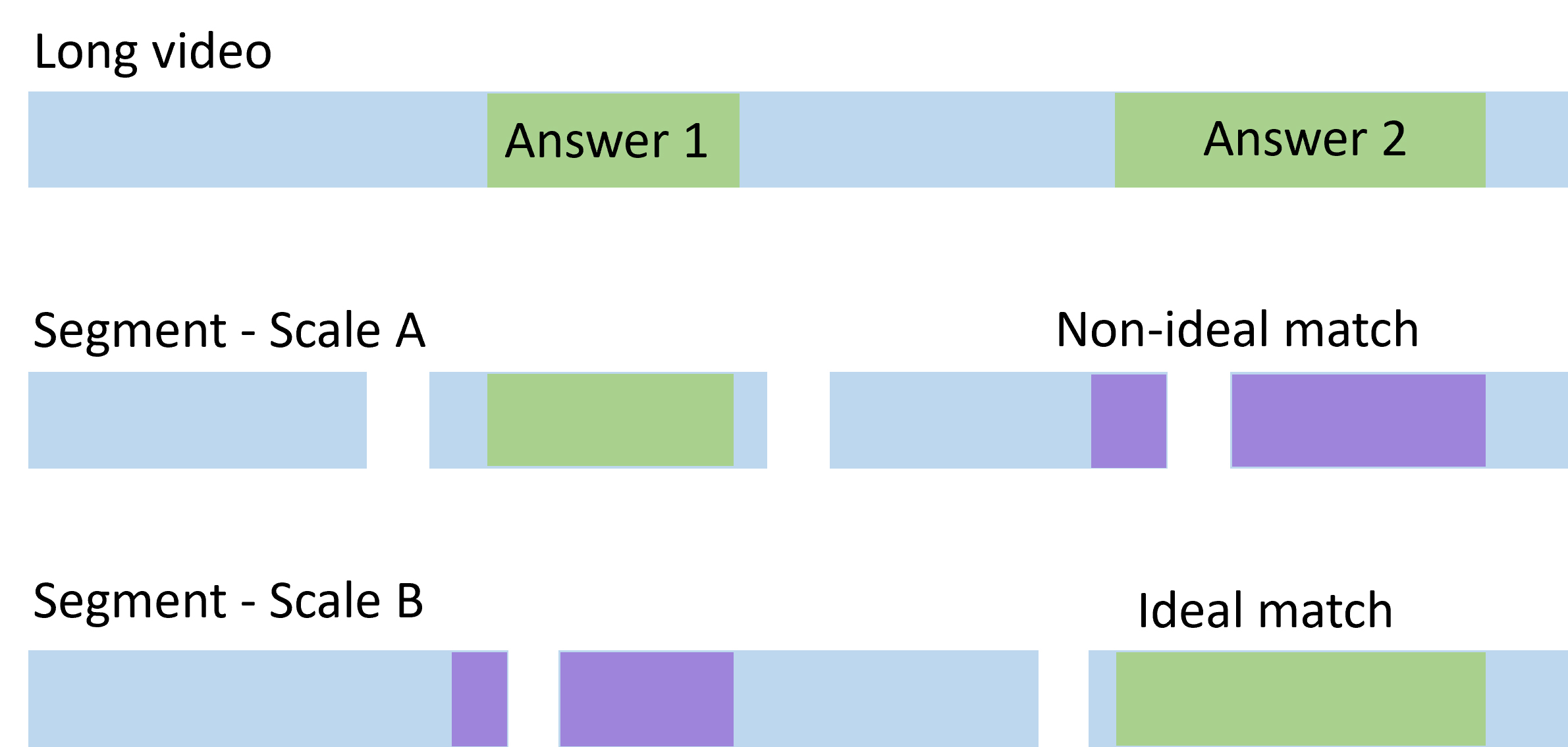 Illustration of how a long video is split into shorter segments of multiple scales for searching. Some clips contain ideal matches, while others contain non-ideal matches. The model derives answers from all segments with potential matches. Credit: NTU Singapore.