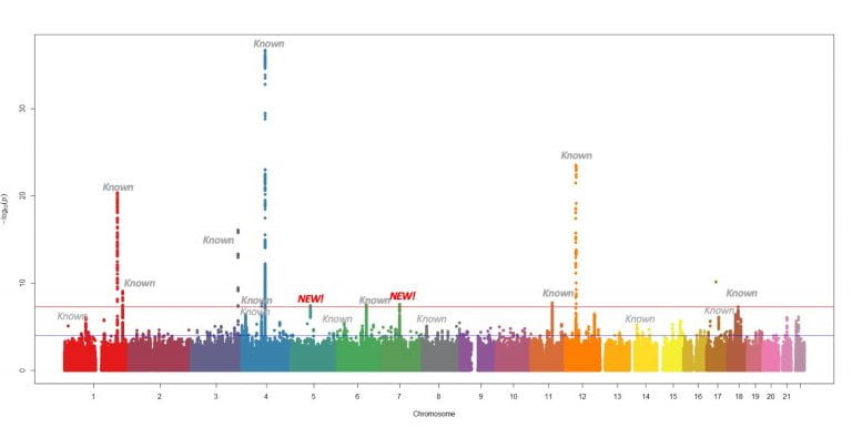 Figure 3: Analysis of the Asian genome-wide association study highlighting genetic variants that might be associated with susceptibility to Parkinson’s disease. While many have been found previously in studies of European patients (“Known”, in grey), two are novel findings (“NEW!”, in red).