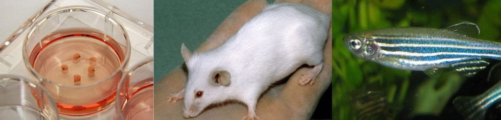 Figure 4: Functional studies in disease models, including in brain organoids (lab-grown miniature brain-resembling organs), mice and zebrafish. Credit: (left) Genome Institute of Singapore, Agency for Science, Technology and Research, Singapore; (centre and right) Wikipedia Commons.