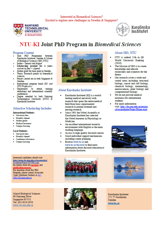 Joint Programmes The School of Biological Sciences is proud to offer a Joint Ph.D Programme in the area of Biomedical Sciences with our partner institution: Karolinska Institutet (Sweden).