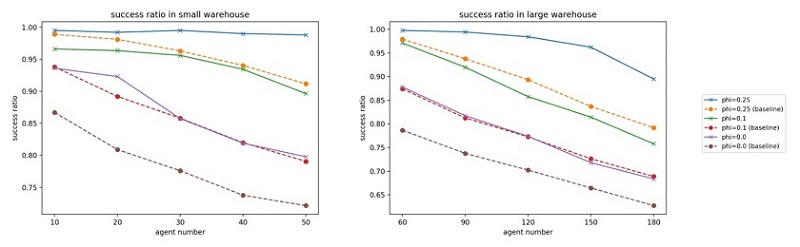 In the baseline algorithm, which is in dashed lines, we skip the agent selection phase and select the agent with the minimum flexibility directly. It can be observed that our framework has an improvement in the success ratio of tasks meeting deadlines in both warehouses compared to the baseline algorithm.