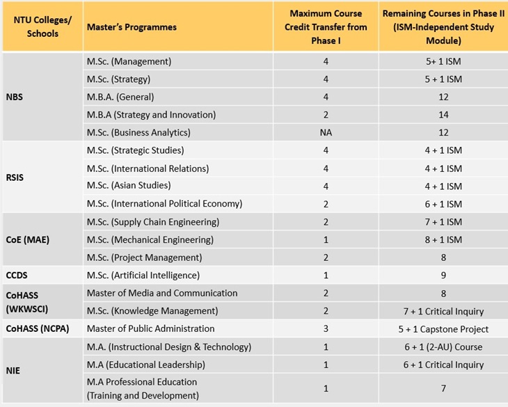 The Number Of Credit Transfer Attainable For The Various NTU Master's Programmes Is Shown In The Table Below: