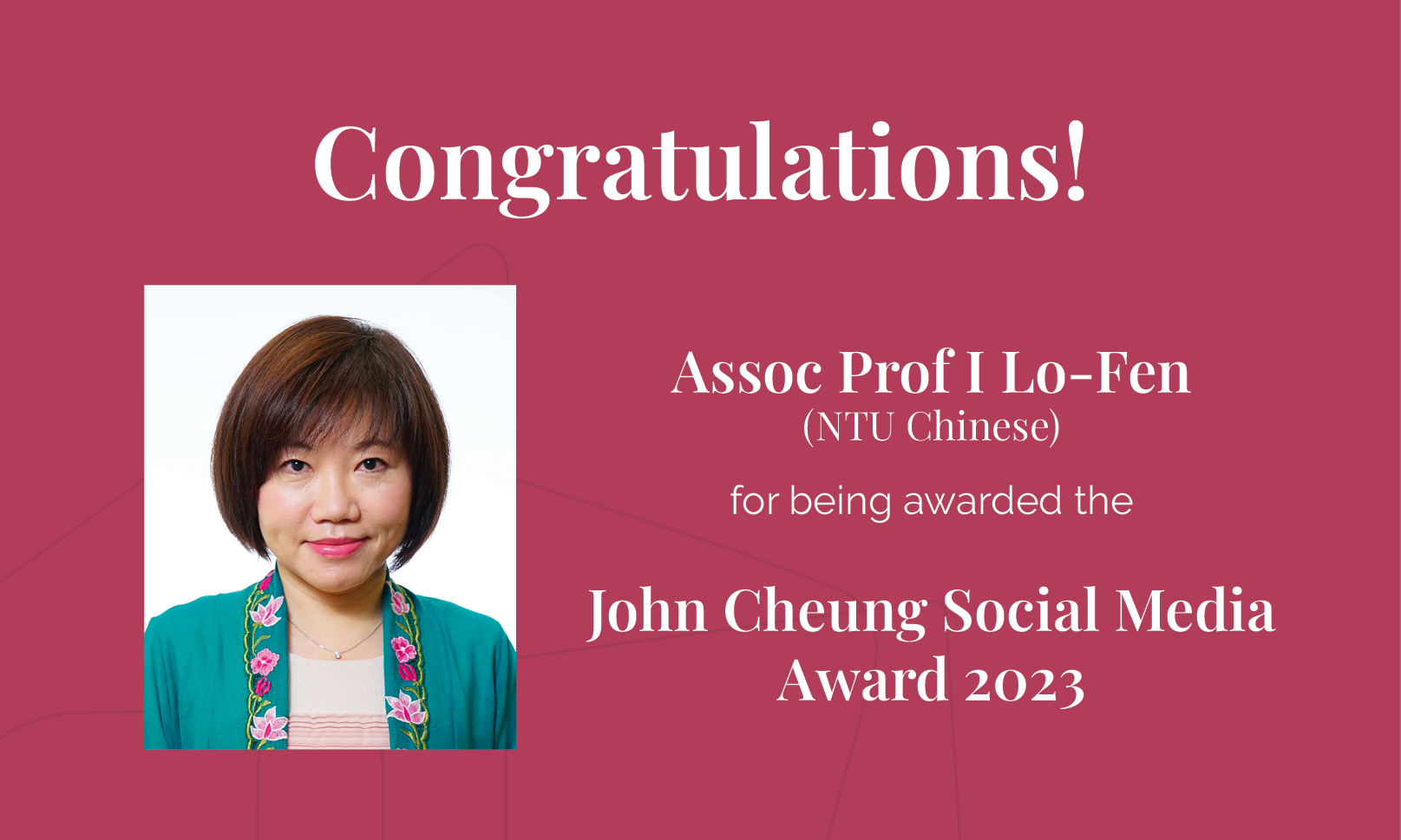 Associate Professor I Lo-Fen (NTU Chinese) has been awarded the John Cheung Social Media Award 2023 for exemplary and innovative use of social media in teaching.
