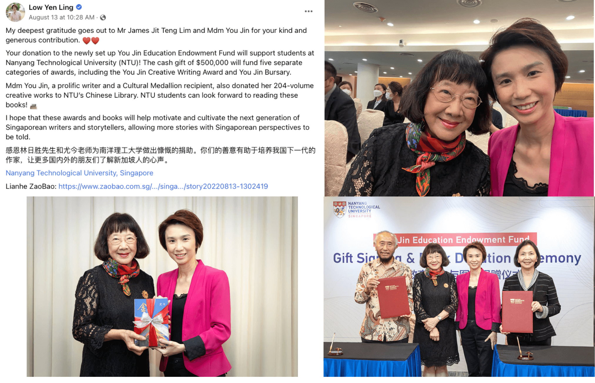 新加坡时间2022年8月12日14:00-15:00,为培养中文人才、鼓励华文创作与出版,新加坡知名作家尤今(本名谭幼今)的丈夫林日胜先生以她的名义设立“尤今教育基金”,向南洋理工大学人文学院中文系捐赠50万新元,经过政府的配套资助,捐赠总额达125万新元。尤今老师向南大中文图书馆捐赠个人文学作品206部,设立“尤今的文学世界”专柜,展览三年。新加坡贸工部兼文化、社区及青年部政务部长刘燕玲女士出席并见证签字仪式。南大副校长连萧思女士、南大人文、艺术与社会科学学院院长廖振扬教授,南大人文学院院长Neil Murphy教授、南大图书馆馆长冯叔玲女士、南大中文系主任曲景毅副教授、南大事务发展部副主任郑雅兴先生、新加坡作家协会会长林得楠先生及尤今的家人等数十位嘉宾出席了仪式。