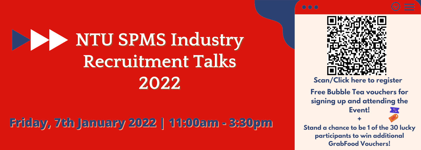 NTU's School of Physical and Mathematical Sciences (SPMS) is hosting a series of industry recruitment talks by employers actively looking for graduates from Science, Technology, and Mathematics (STEM) subjects. All SPMS students and alumni are cordially invited.