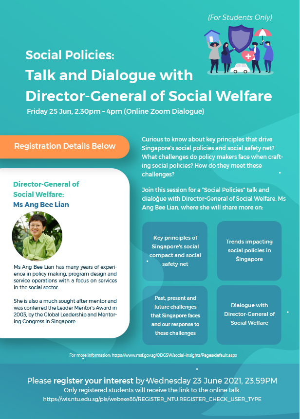 Brief description of the area(s) to be covered | Curious to know about key principles that drive Singapore's social policies and social safety net? What challenges do policymakers face when crafting social policies? How do they meet these challenges? Join this session for a "Social Policies" talk and dialogue with Director-General of Social Welfare, Ms Ang Bee Lian, where she will share more on: Key principles of Singapore's social compact and social safety net
