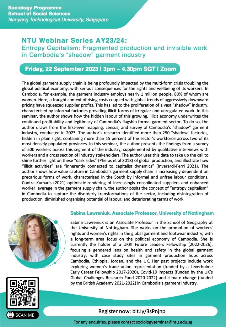 We are pleased to invite you to our upcoming seminar “Entropy Capitalism: Fragmented production and invisible work in Cambodia’s “shadow” garment industry”, presented by Associate Professor Sabina Lawreniuk.