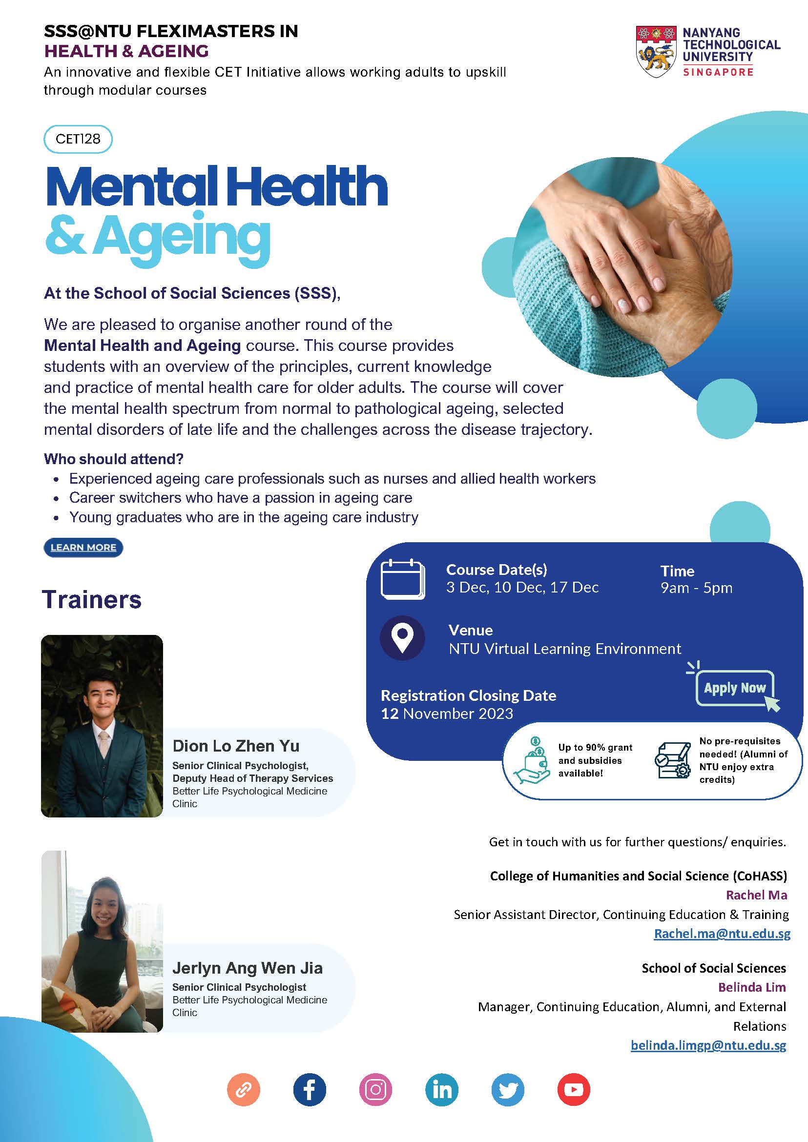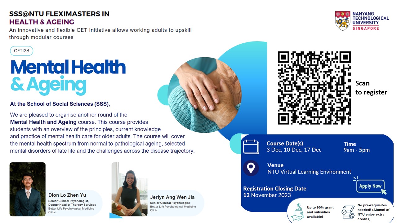 Our upcoming Mental Health and Ageing course is back! Dive deep into the world of elderly mental healthcare, covering everything from normal ageing to specific disorders. Perfect for experienced ageing care professionals, career changers, and recent graduates entering the field. Elevate your knowledge and impact in ageing care—don't miss out!