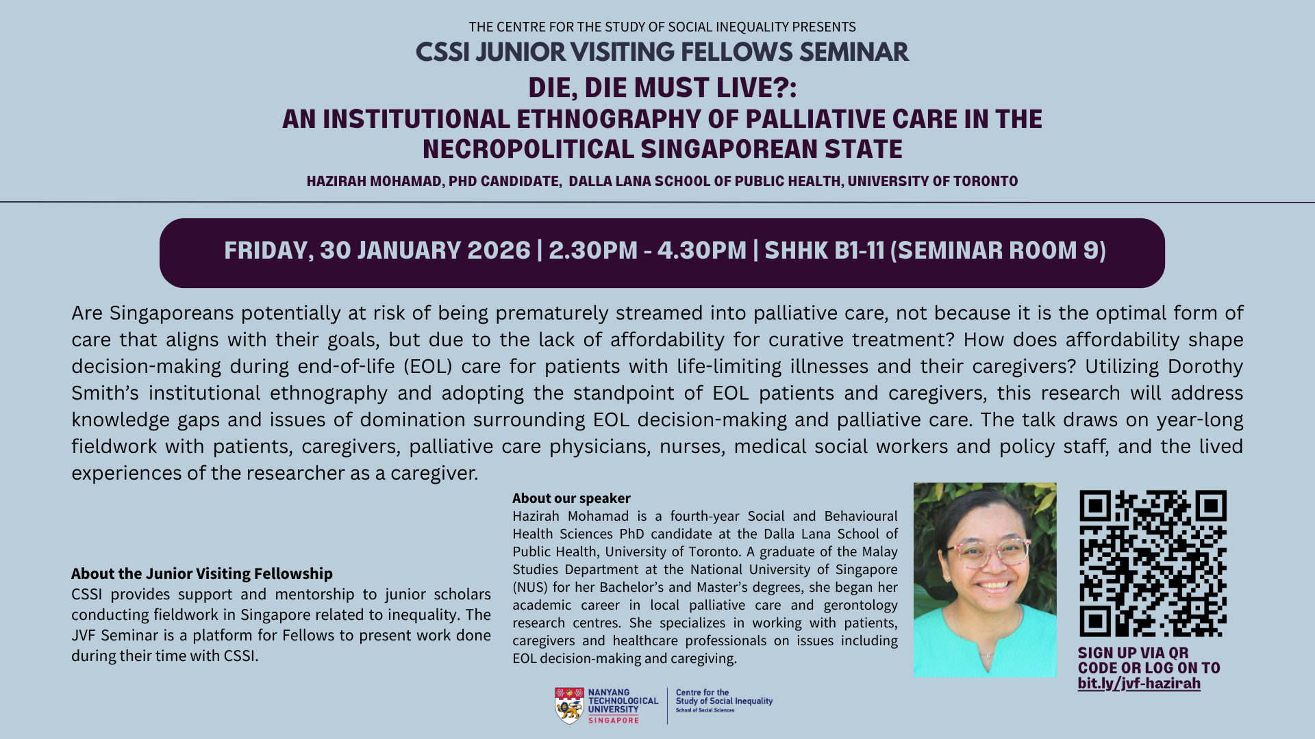 (CSSI Junior Visiting Fellows Seminar) Die, die must live?: An Institutional Ethnography of Palliative Care in the Necropolitical Singaporean State