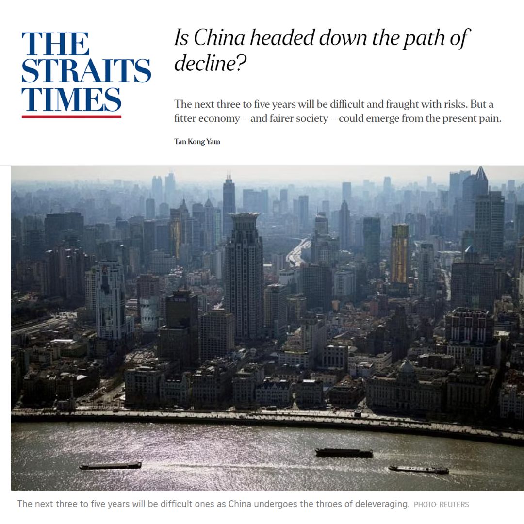 In this commentary, NTU economics professor Tan Kong Yam discusses the current state of China’s economy. Has China already passed its peak and is it headed for long-term decline, as some analysts suggest? To get better, the Chinese economy needs to shed the drag from its bloated real estate sector and overexpansion in infrastructure. It won’t be easy, but it is premature to declare that China’s economy is in terminal decline. The next three to five years will be difficult ones as China undergoes the throes of deleveraging. The path ahead is sure to be marked by setbacks and recalibrations, but if China stays on track along the lines of the new development model, the result would be a healthier economy and a more stable and fairer society.