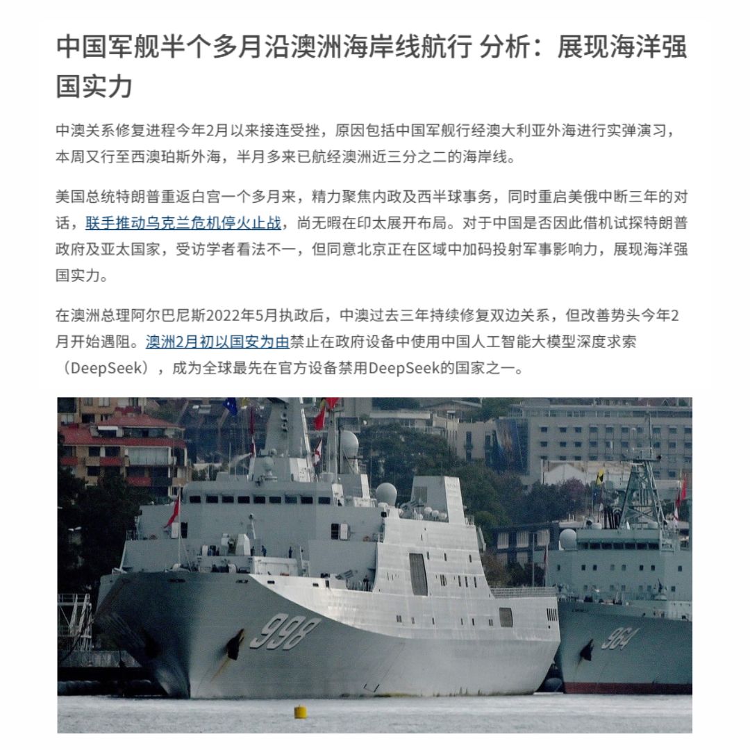 Since February, China-Australia relations have faced setbacks due to Chinese military exercises near Australia, including live-fire drills in the Tasman Sea. Australia’s February ban on China's DeepSeek AI model for government devices and its criticism of Chinese military actions in the South China Sea further strained ties. NTU Asst Prof Dylan Loh said that the renewed tensions reflect the fragile nature of bilateral relations despite three years of efforts to mend ties. He added that while China engaged diplomatically before Trump’s return to the White House, its strategic goals in the Indo-Pacific remain unchanged. He said Beijing continues to hope to establish dominance and control in the South China Sea, and has the ability to confront the United States and its allies in the region, and promote China's national interests without completely replacing the United States and minimising obstacles.